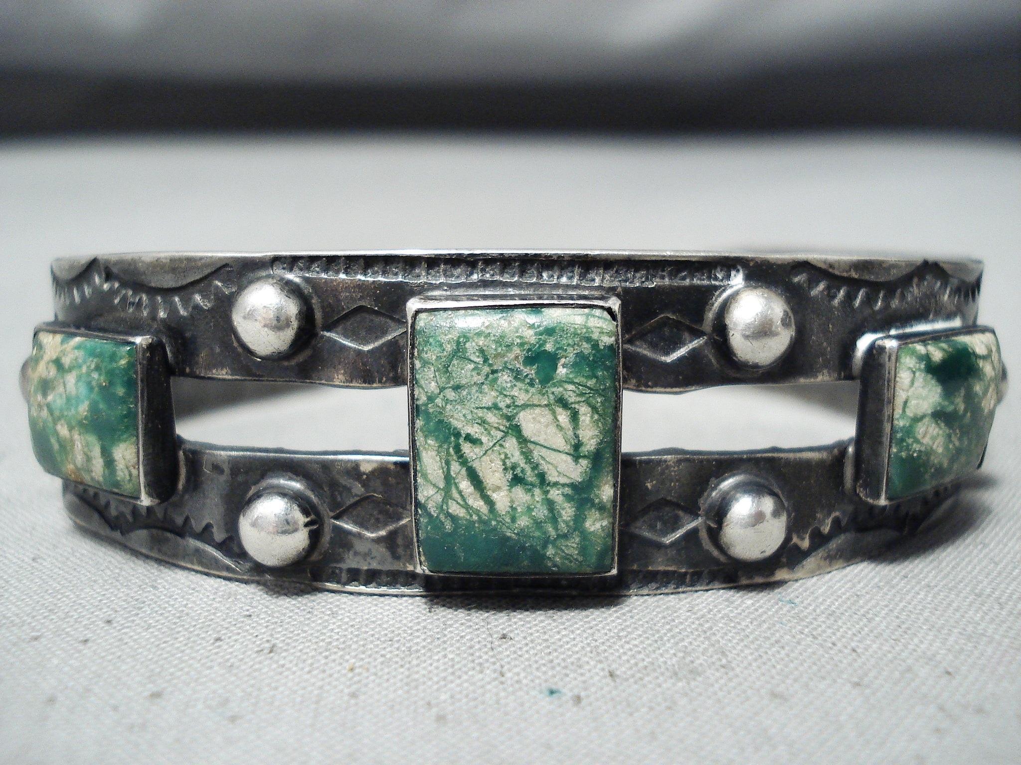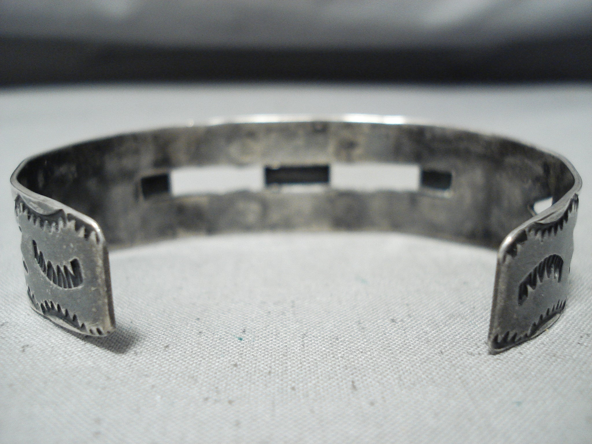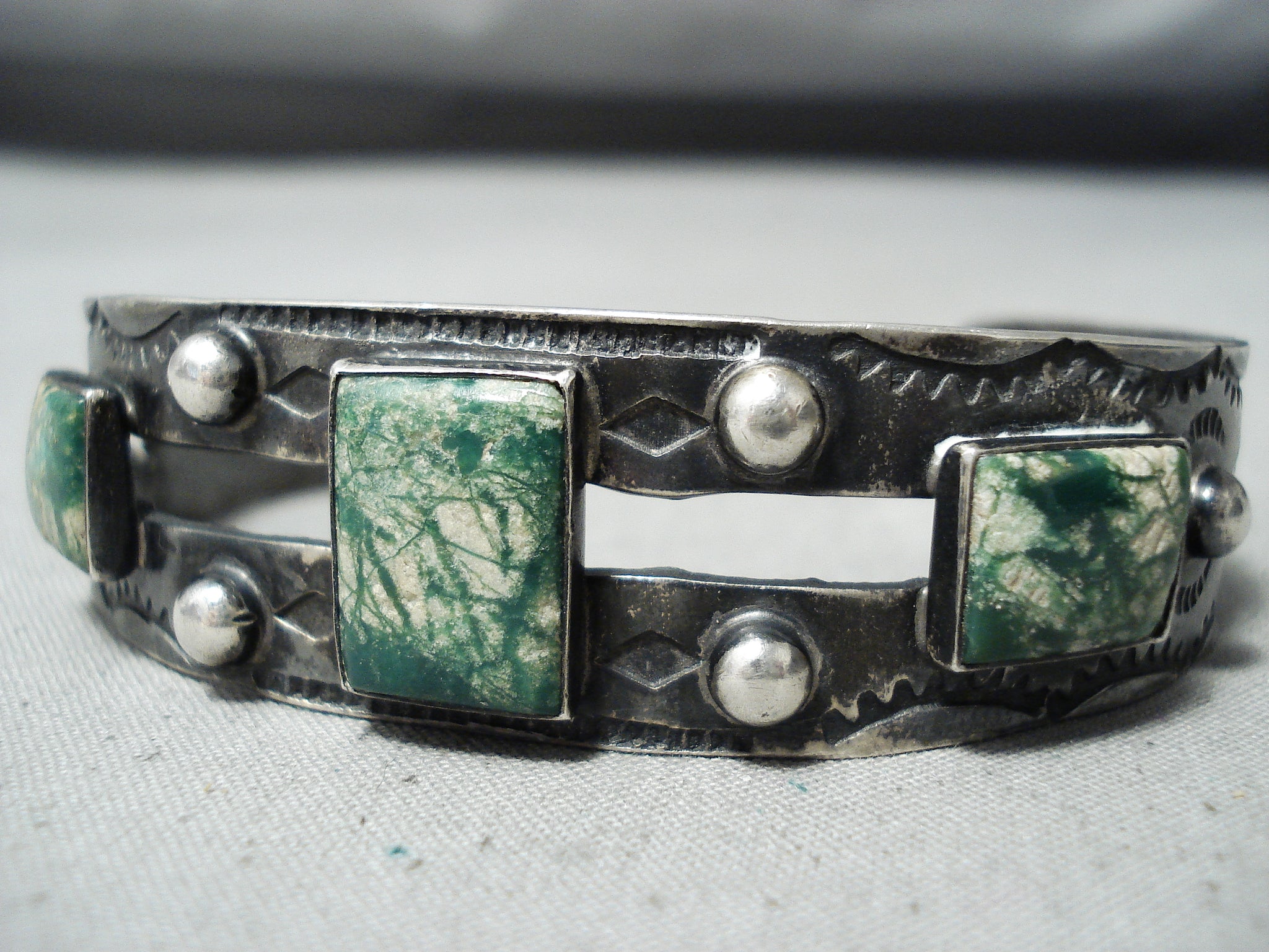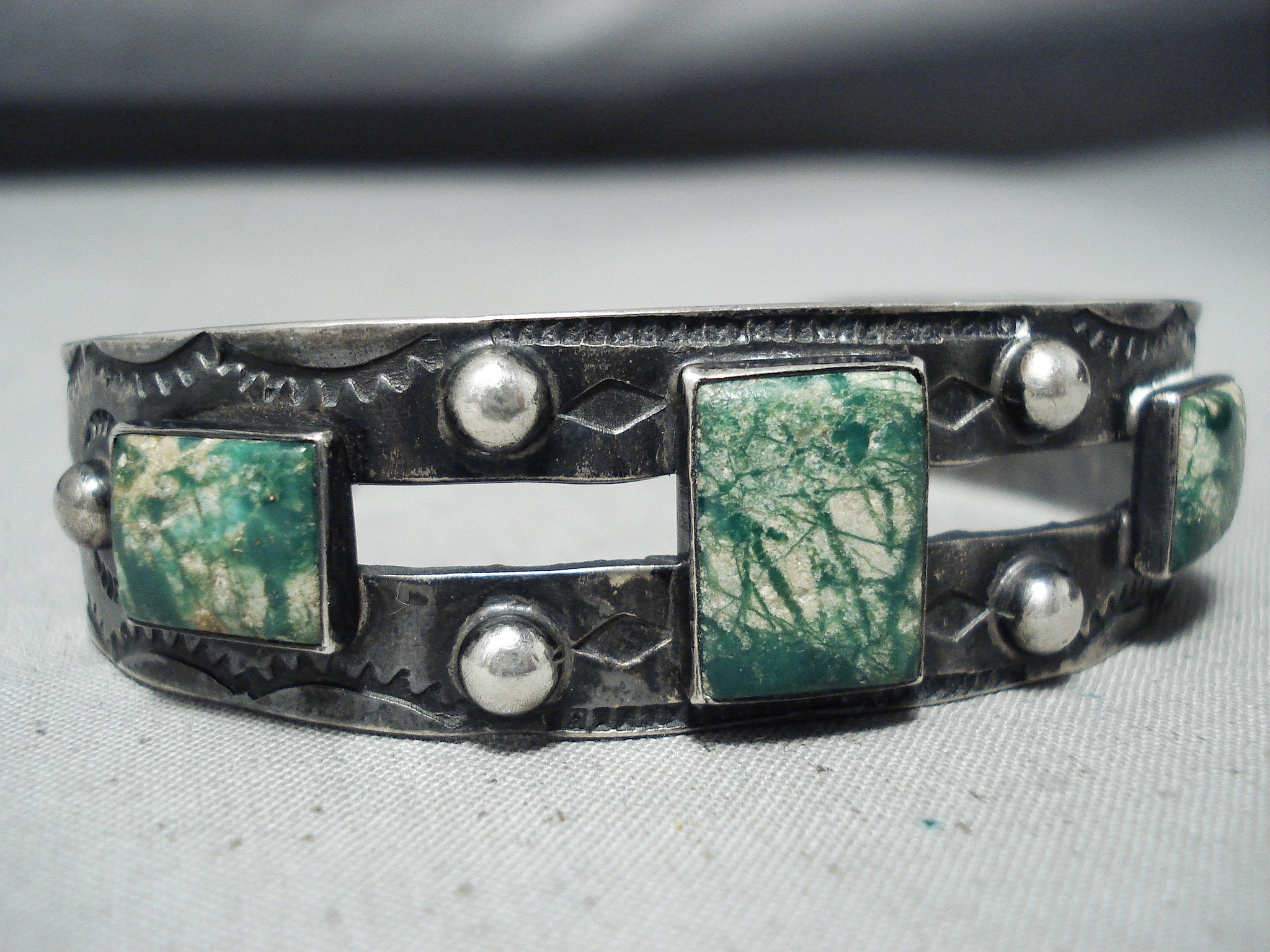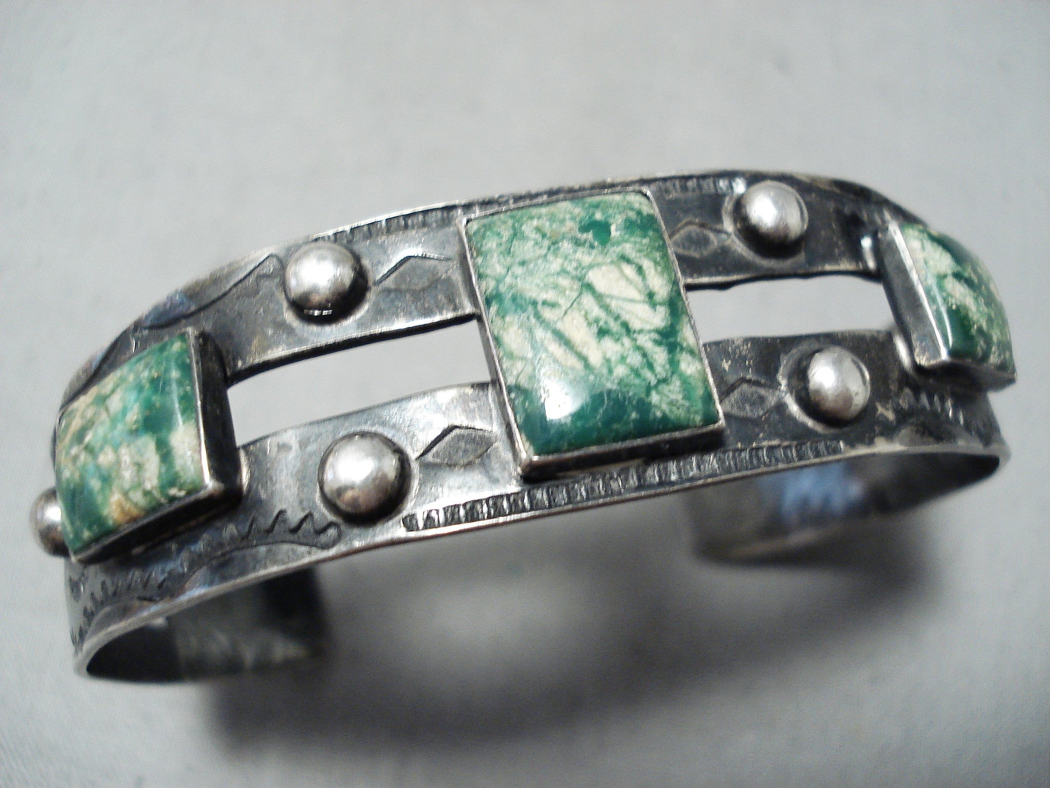 This is a wonderful vintage Navajo silver bracelet. The interesting cut-out arrows at the sides of this expressive cuff point the way to the 3 mesmerizing square cut gorgeous turquoise stones - fabulously decorated with handstamped designs and silver balls! The center stone measures around 9/16" x 7/16". The width of the bracelet measures around 3/4". Sterling silver. The inside end to end measures around 5-7/8" with an additional 1-3/8" gap. Sturdy 28 grams. Cir Early to Mid Century.