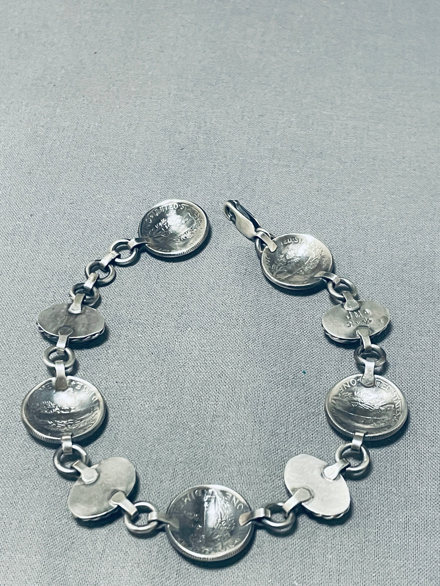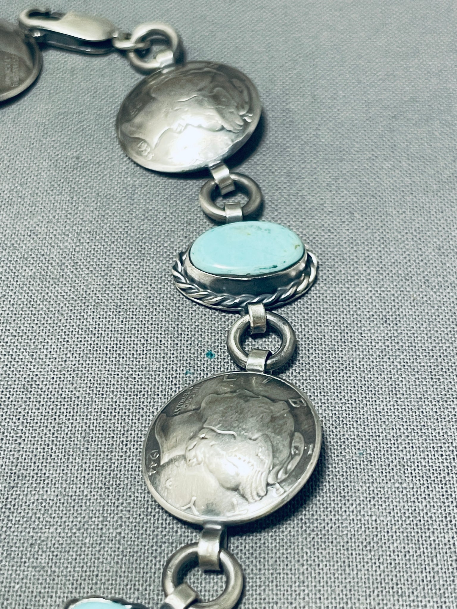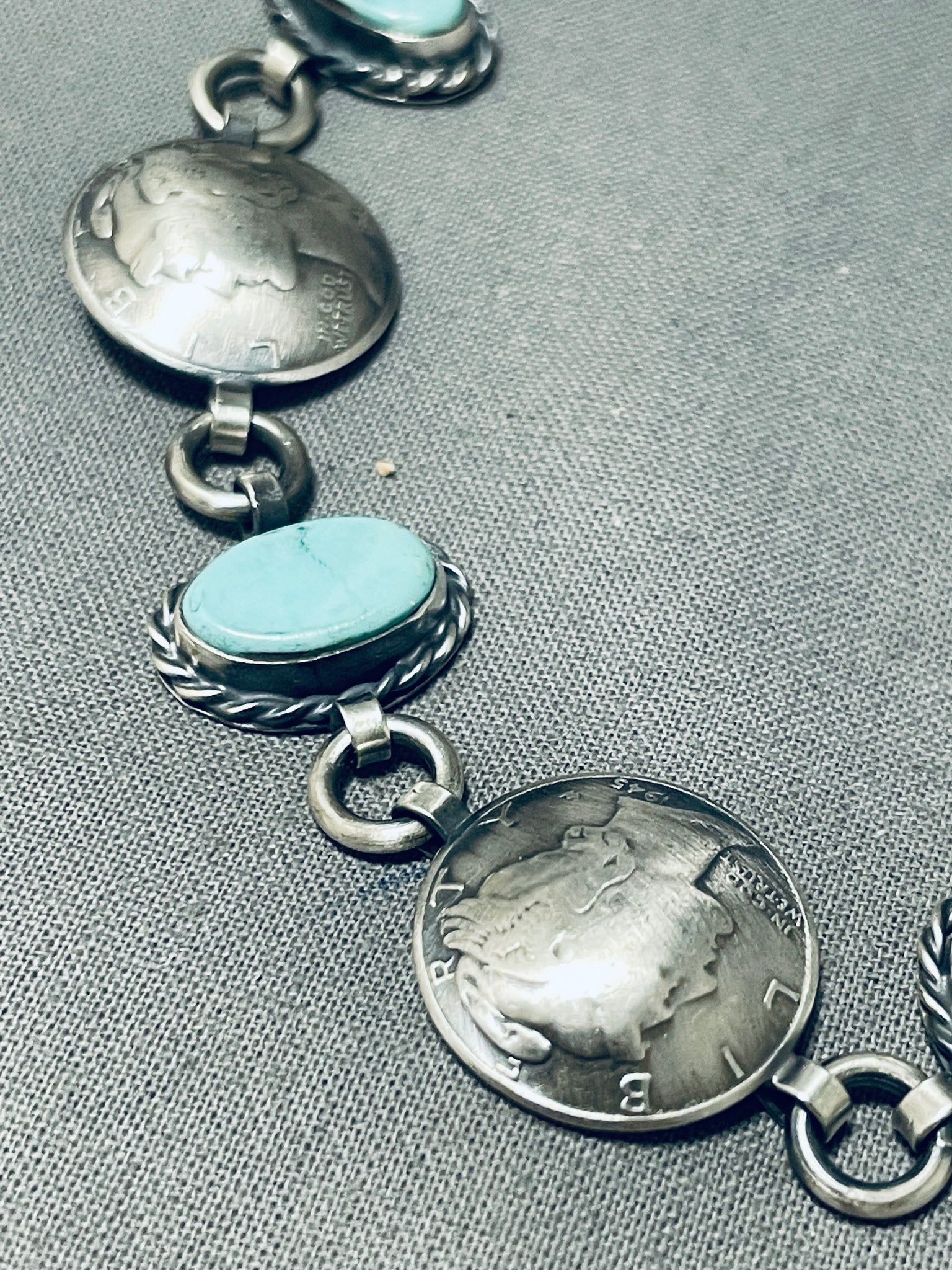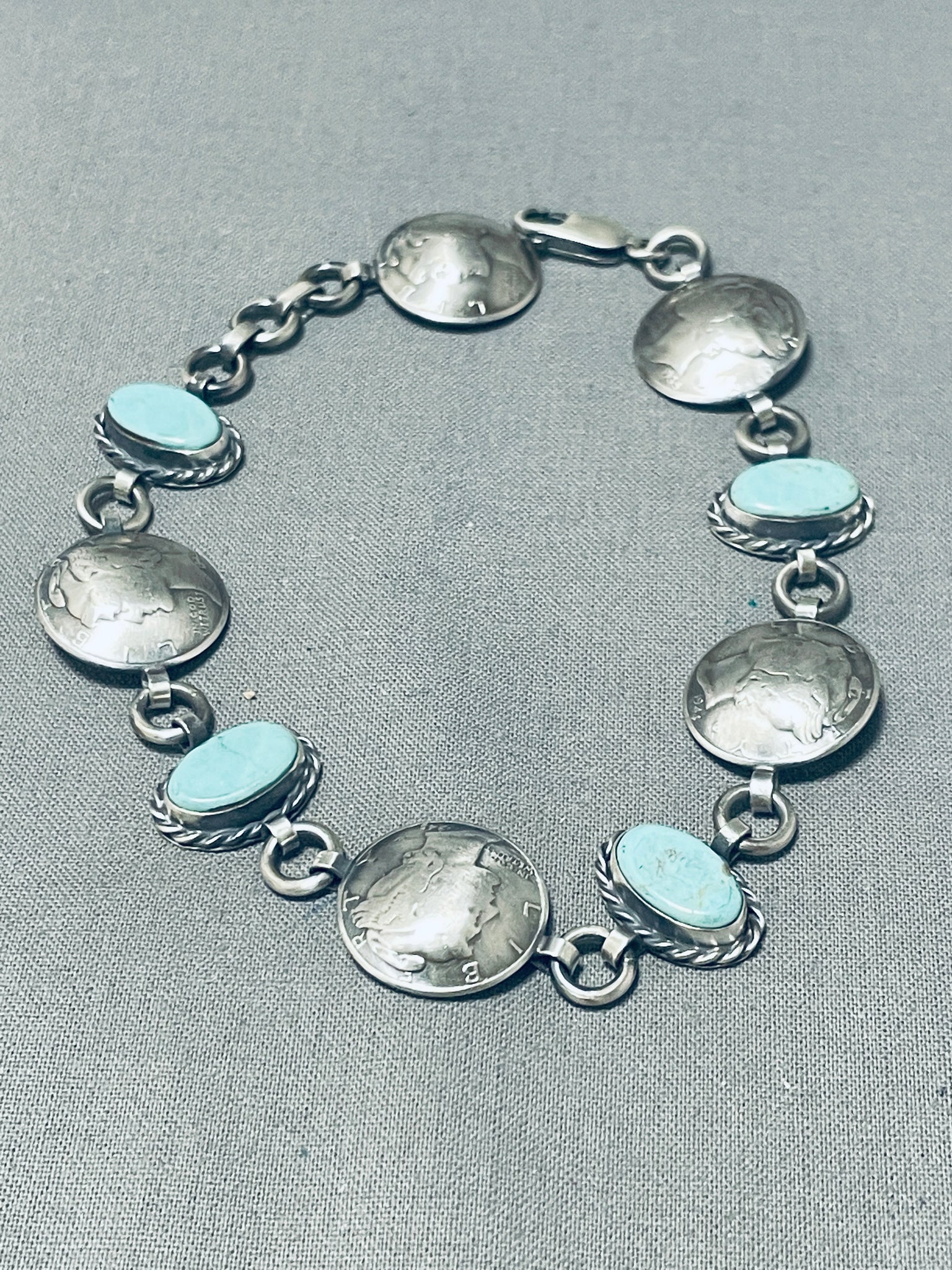 Exceptional Native American Navajo 4 Royston Turquoise 5 Silver Mercury Dimes Bracelet
