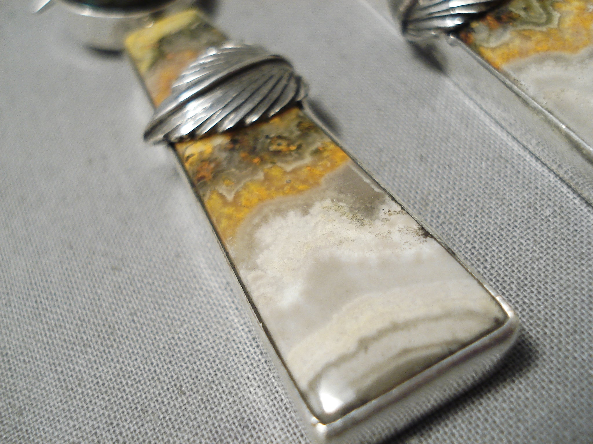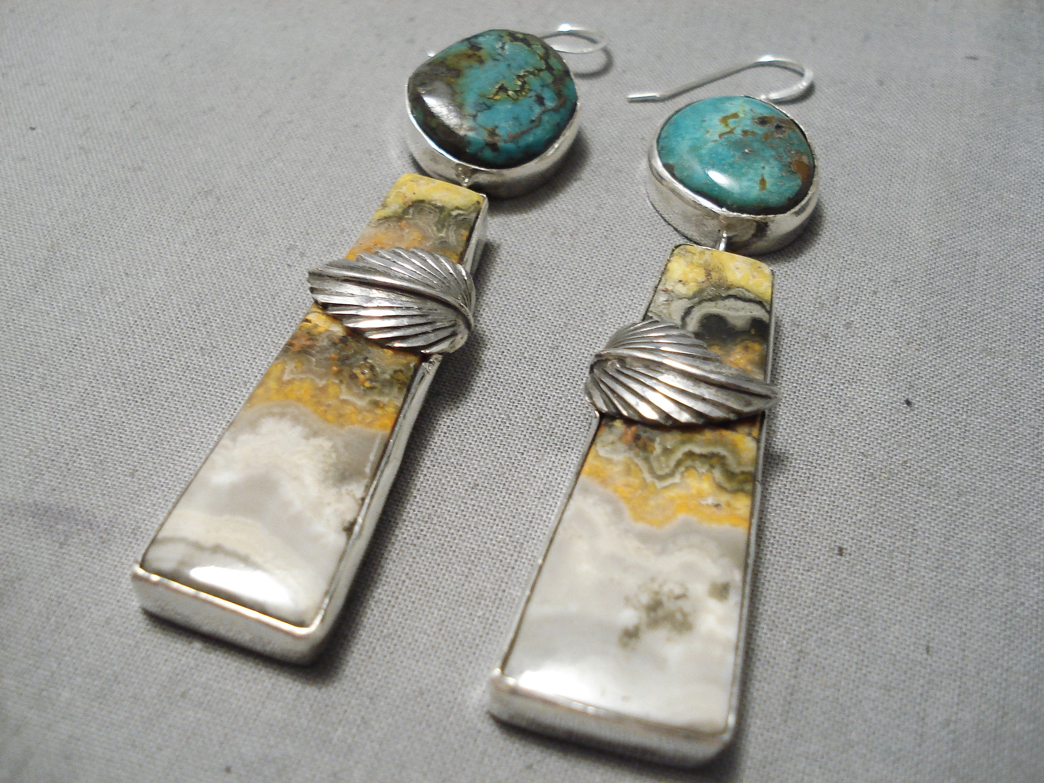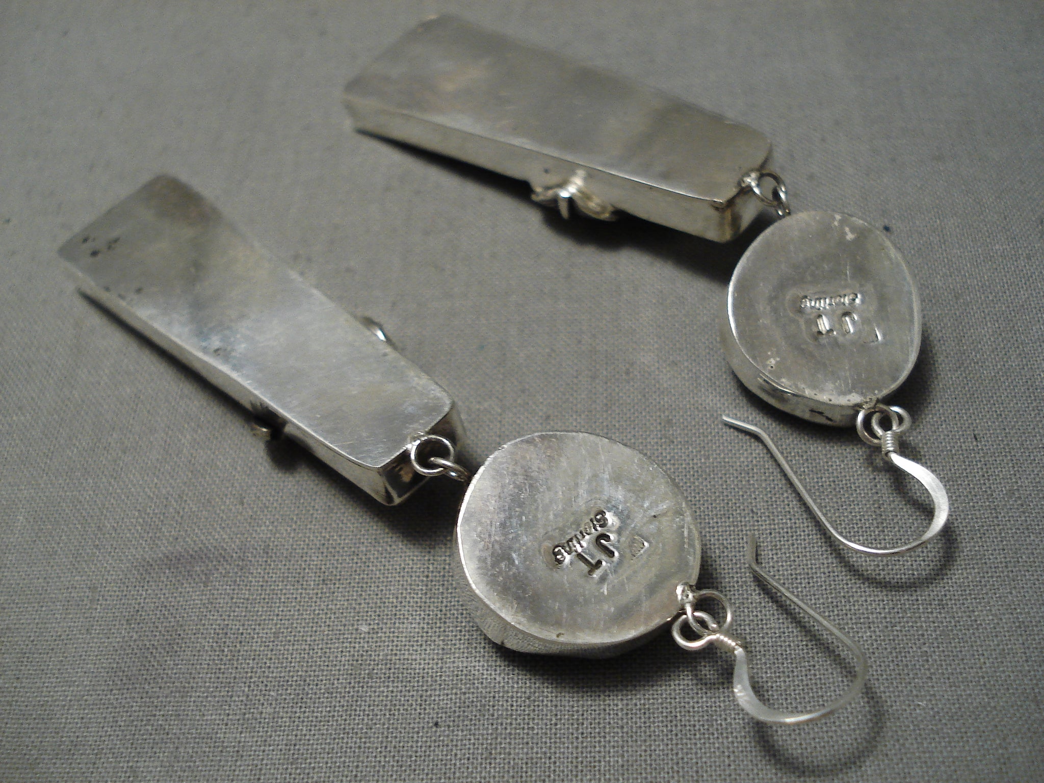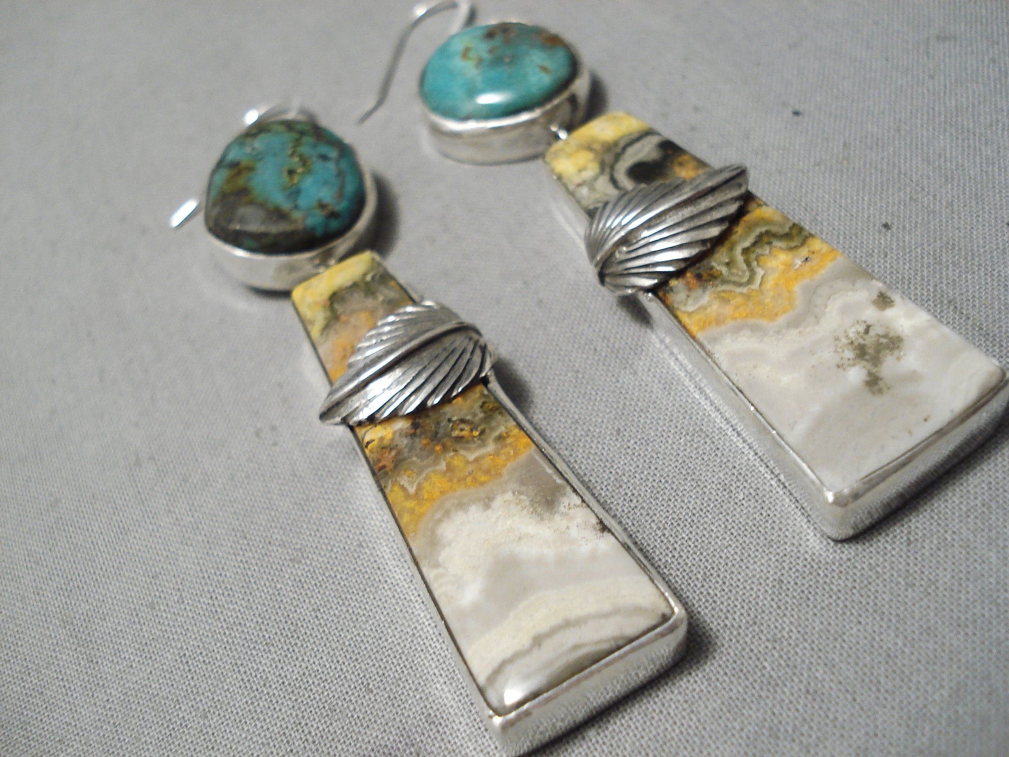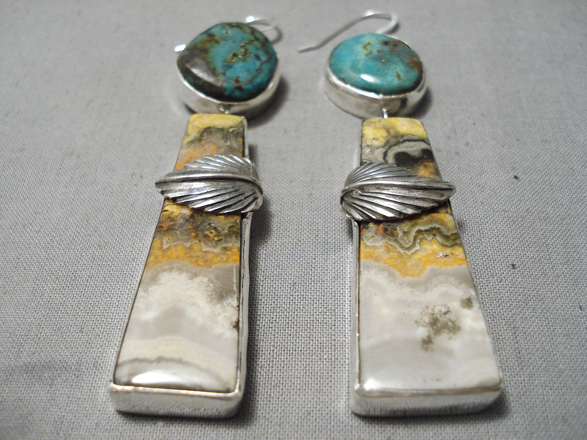 Exceptional Native American Navajo Longer Turquoise Sterling Silver Leaf Jasper Earrings