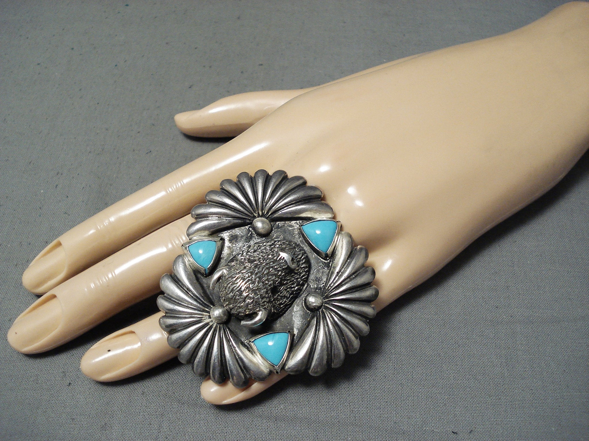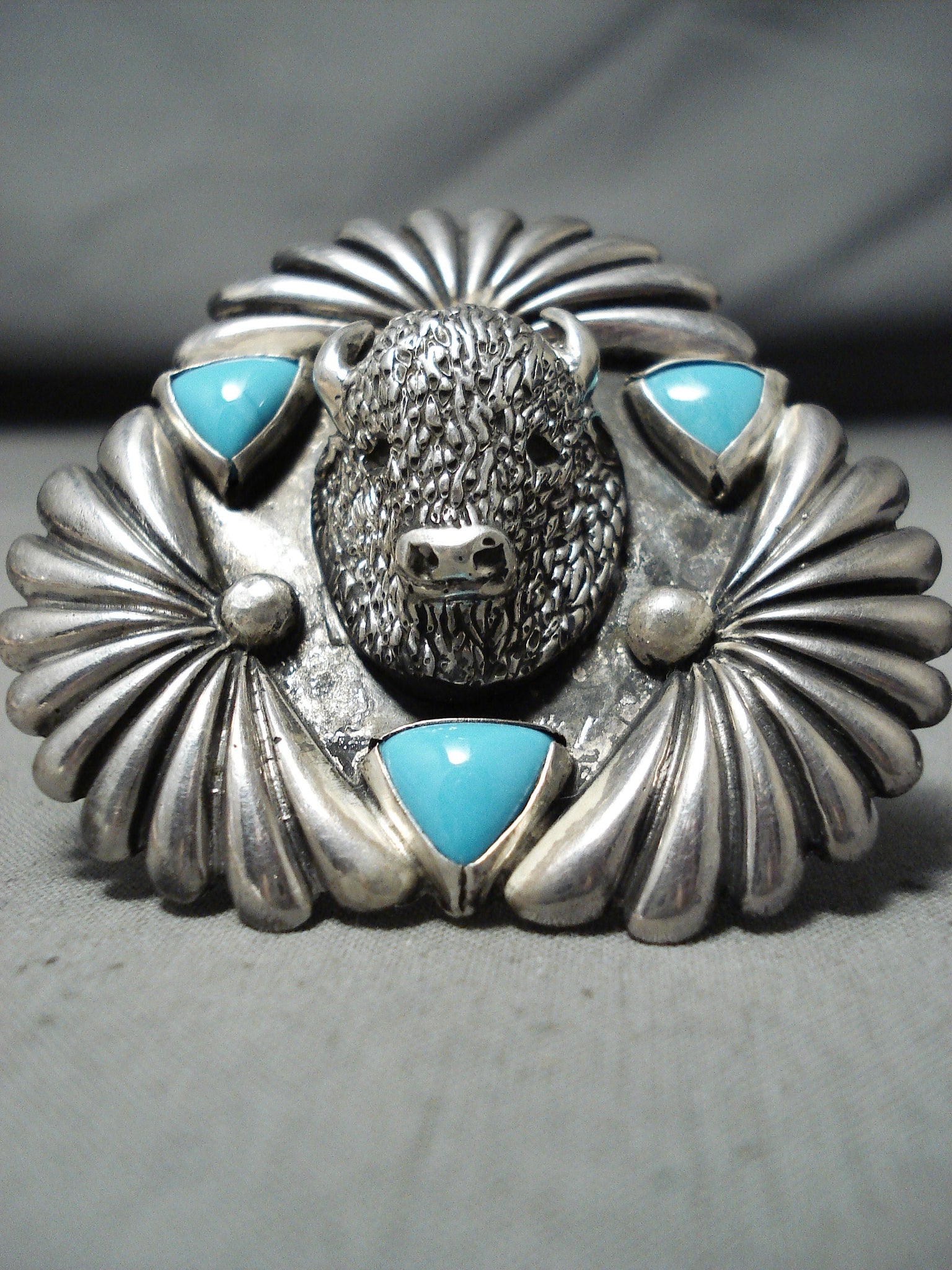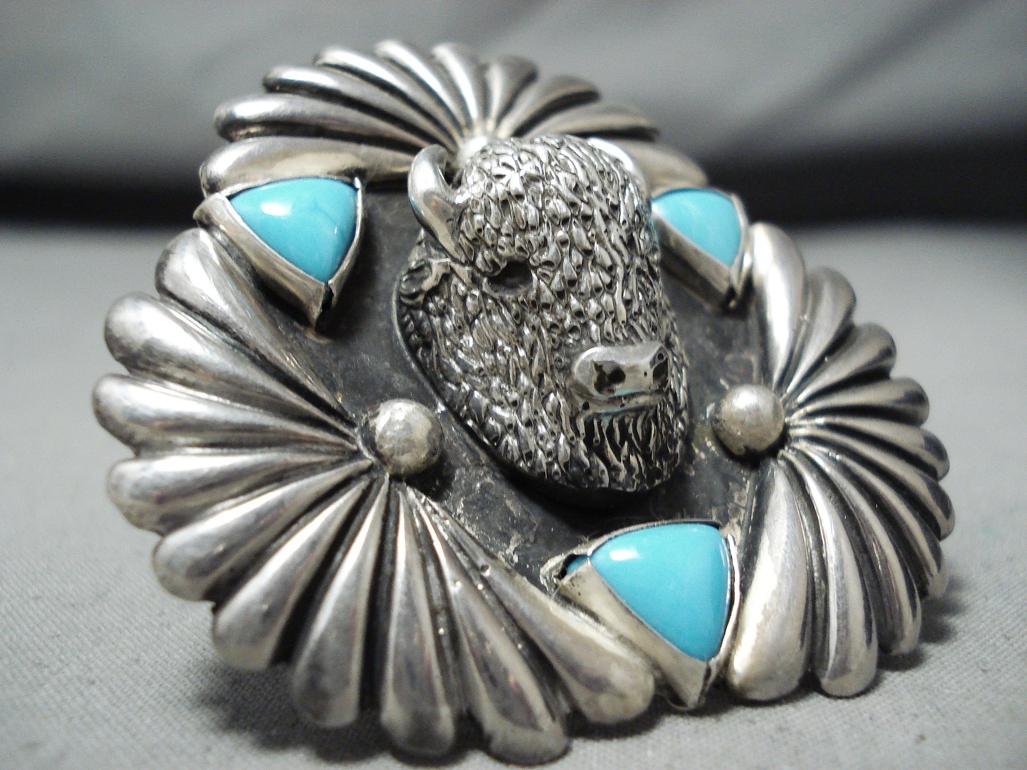 Exceptional Native American Navajo Sleeping Beauty Turquoise Sterling Silver Buffalo Ring