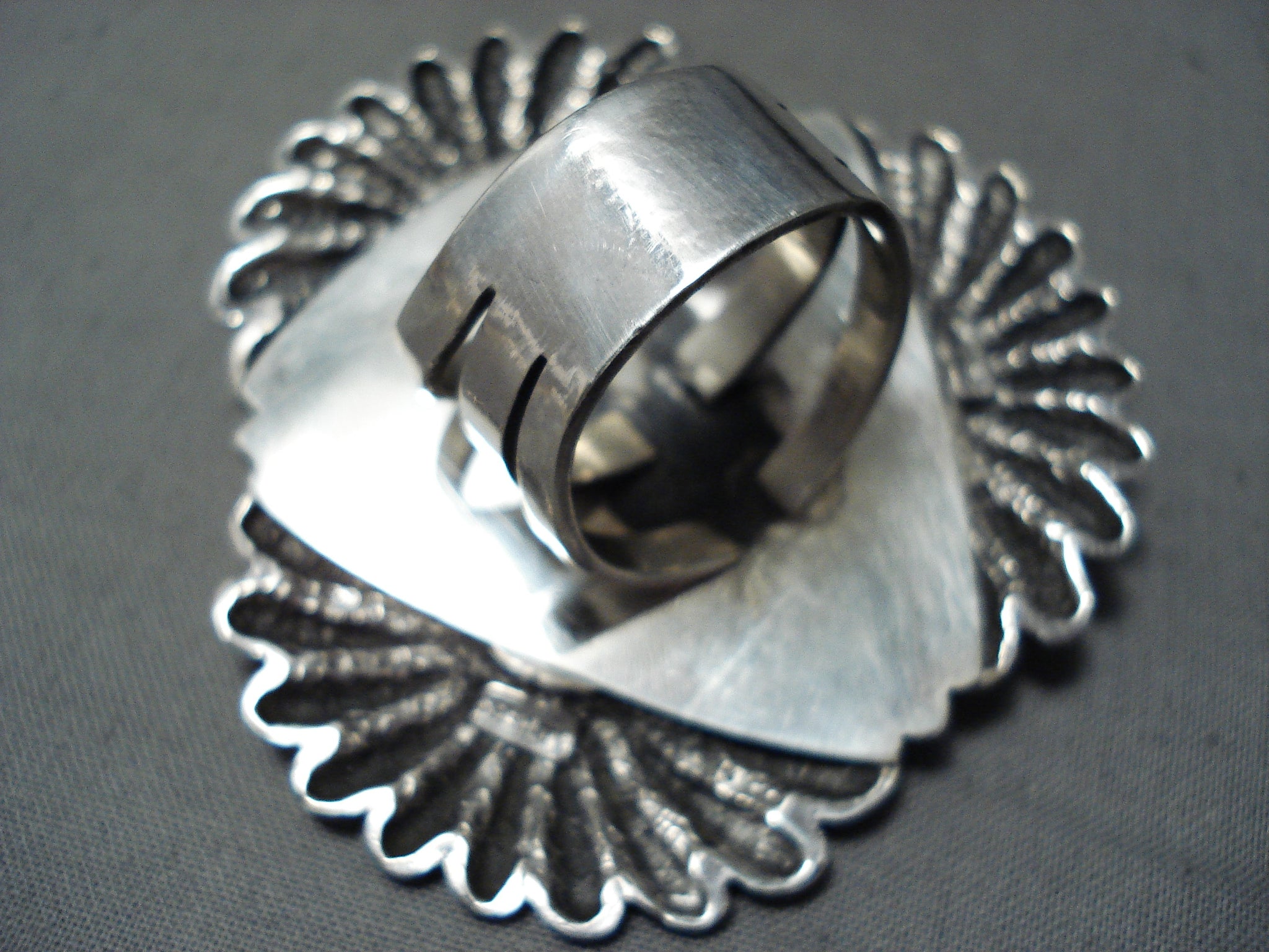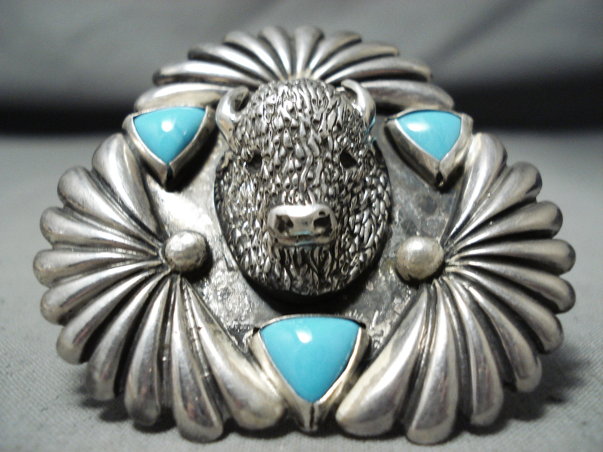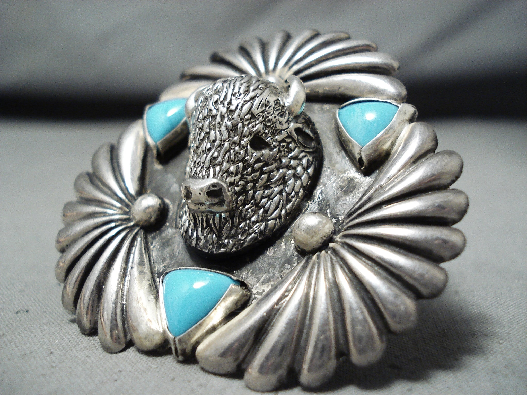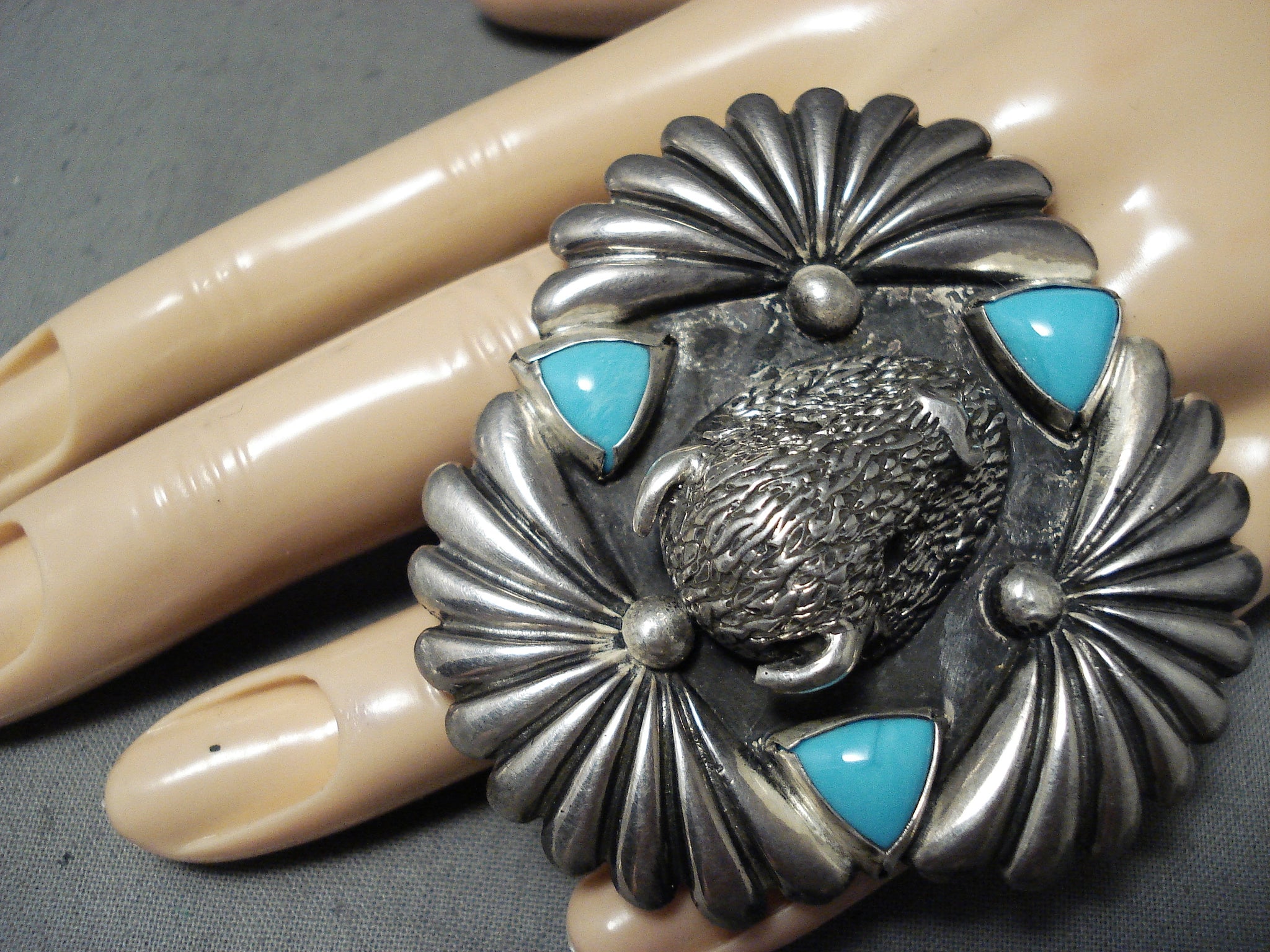 Exceptional Native American Navajo Sleeping Beauty Turquoise Sterling Silver Buffalo Ring
