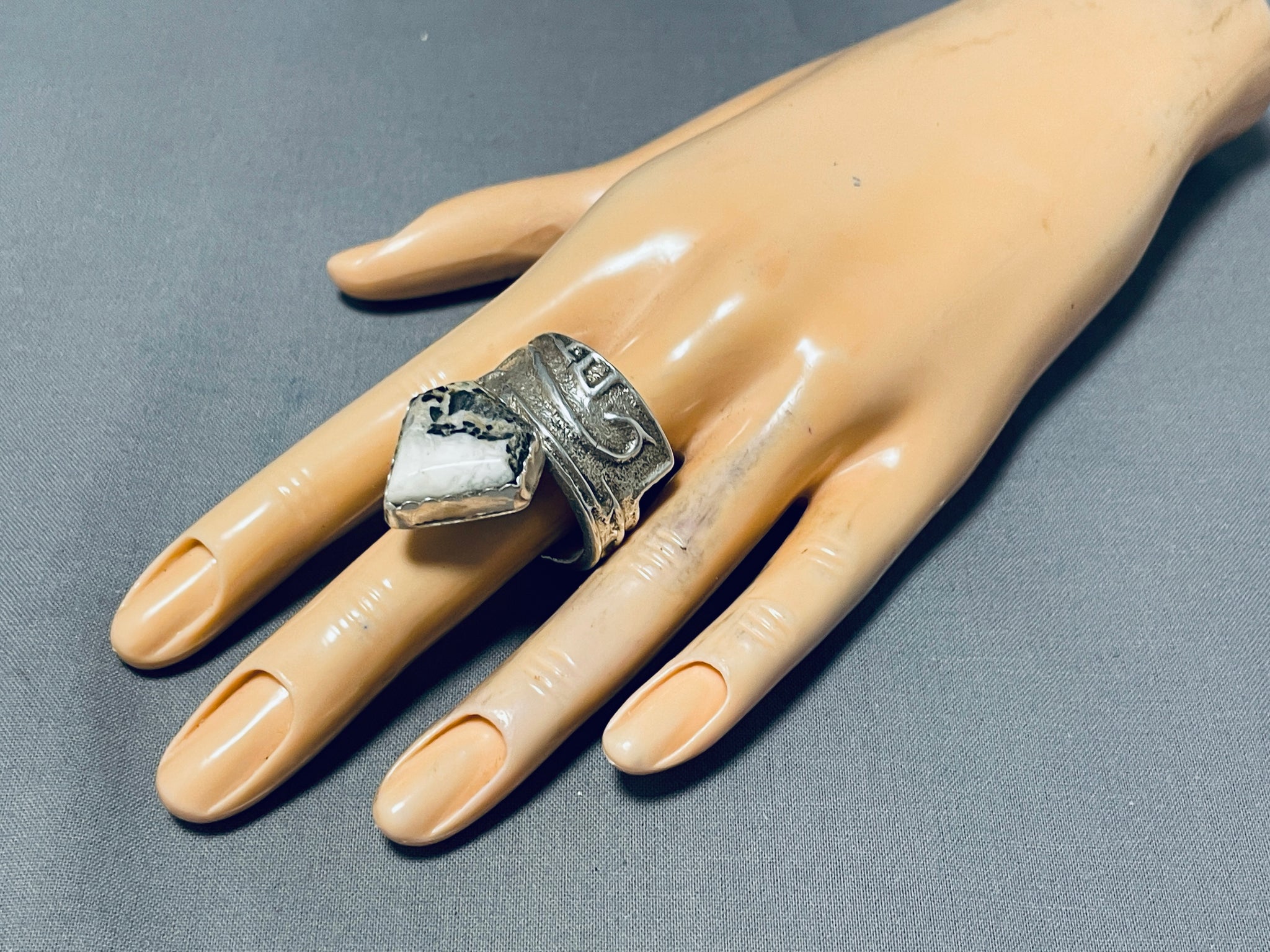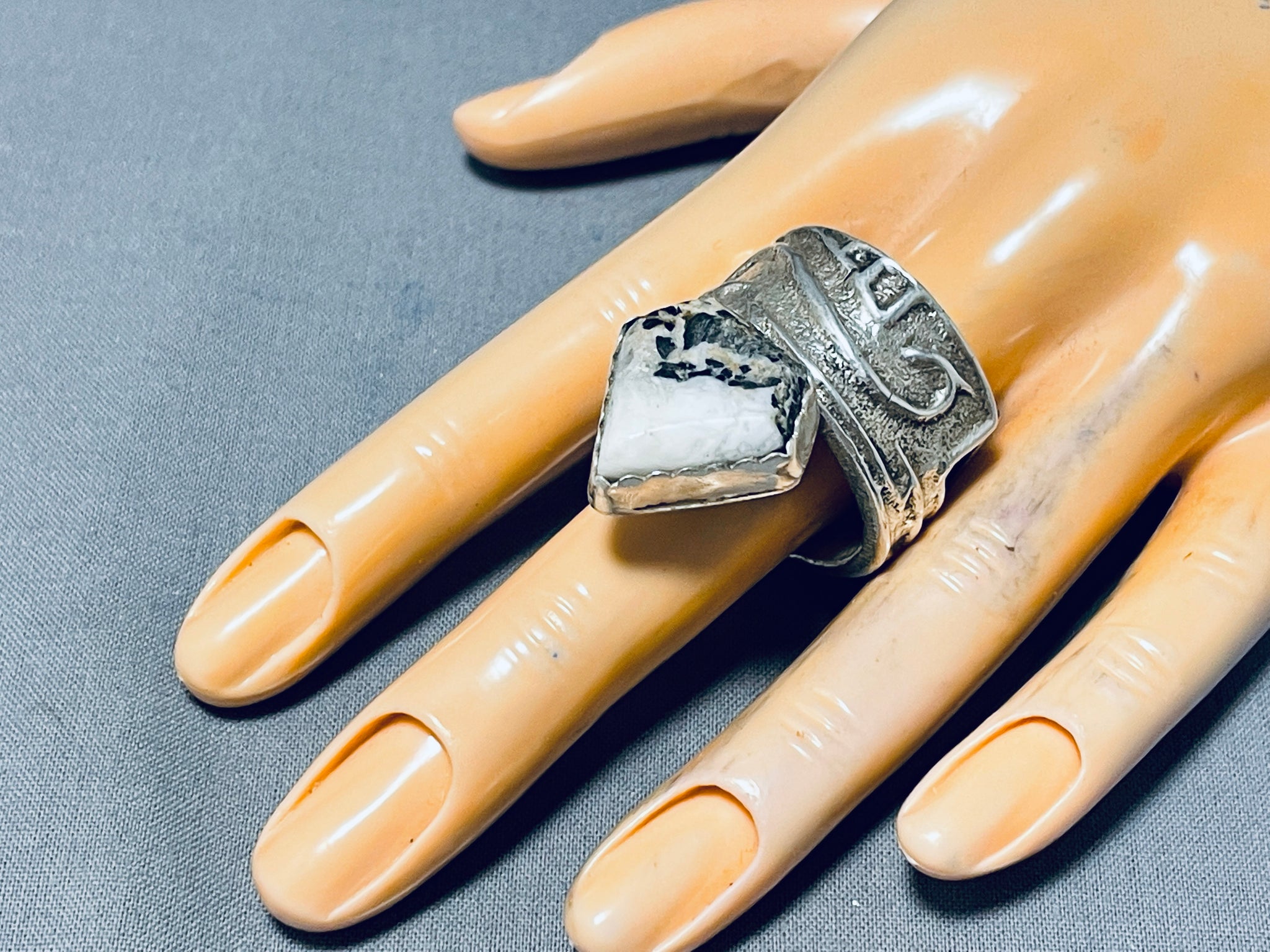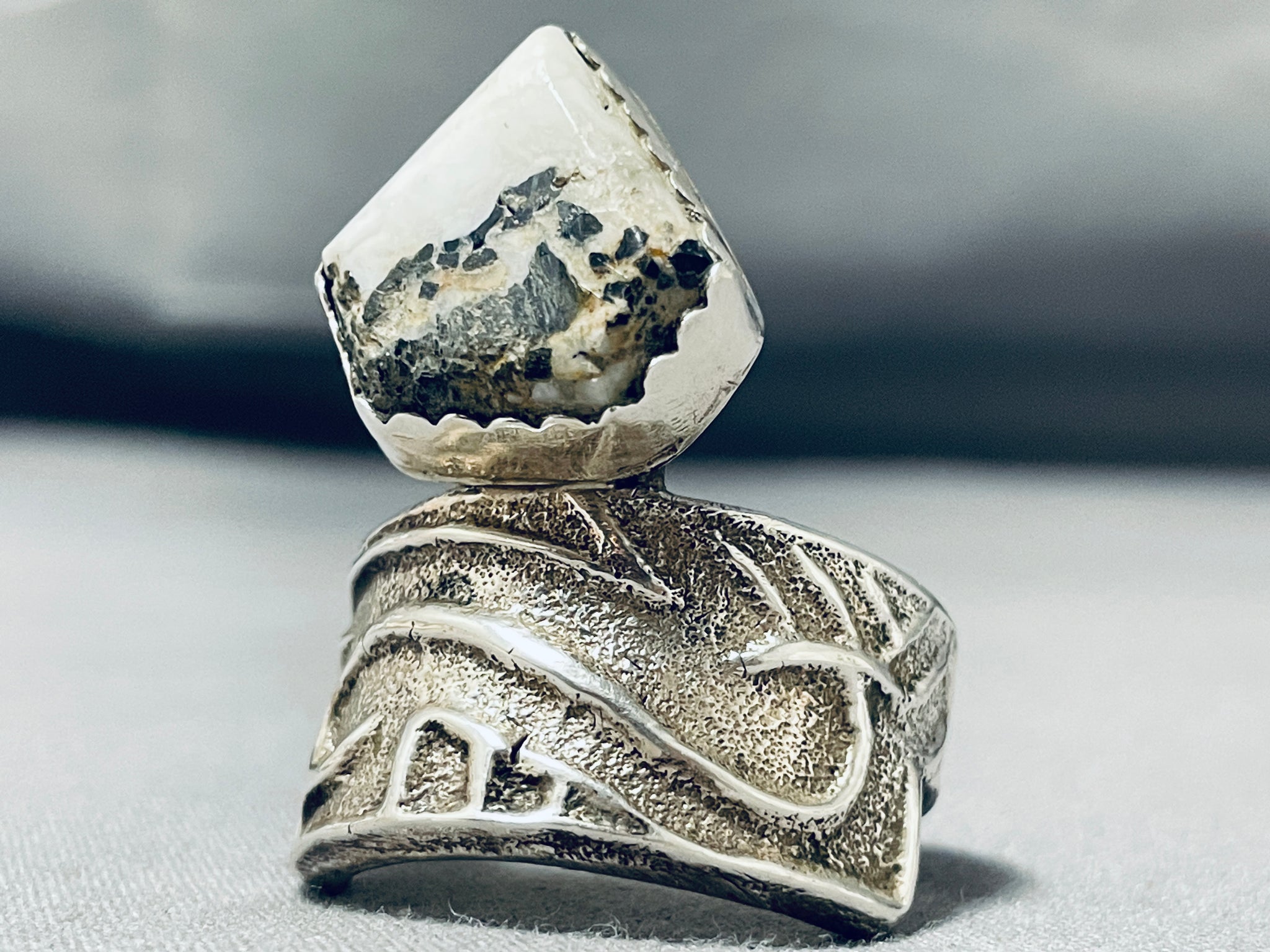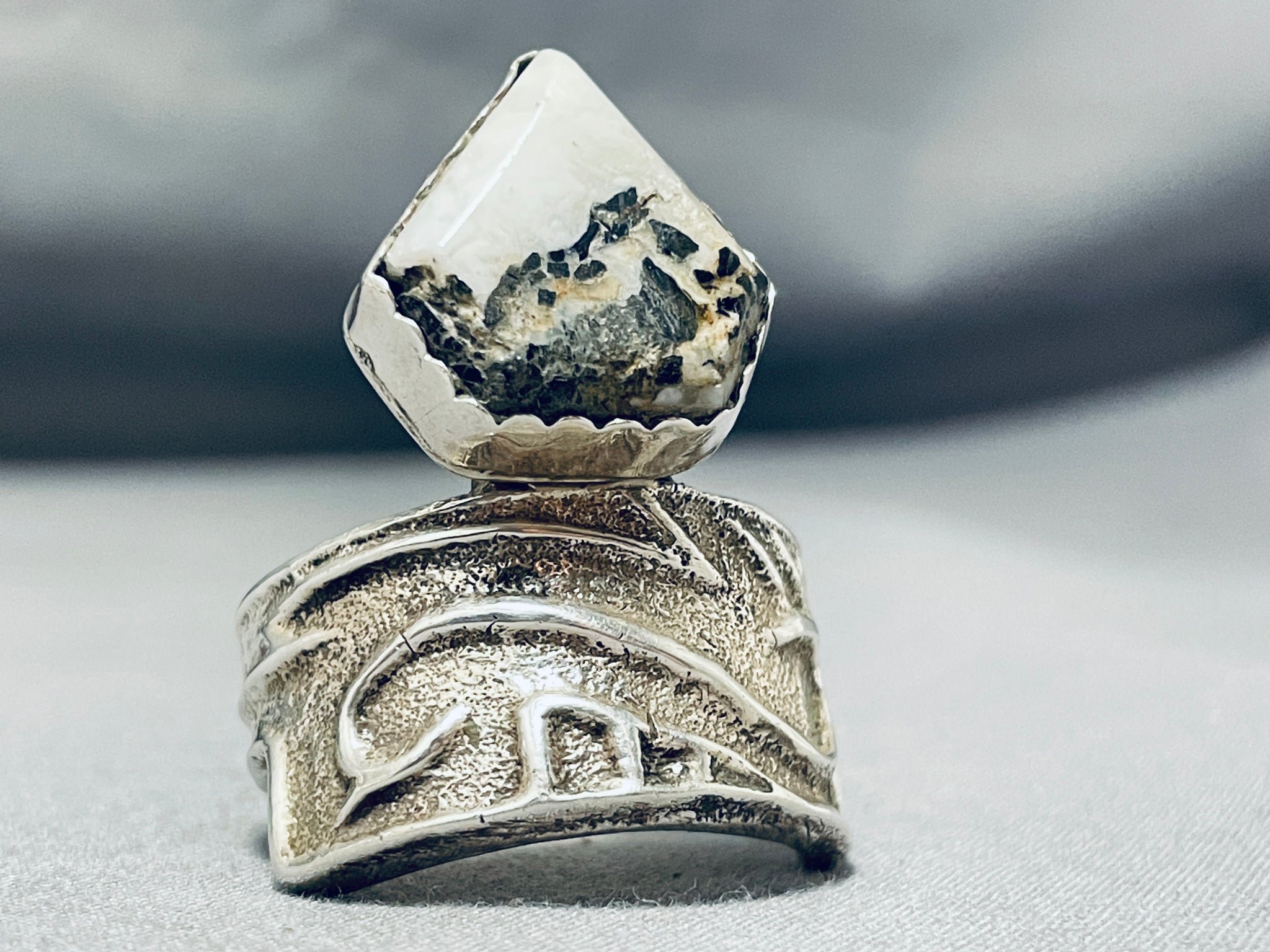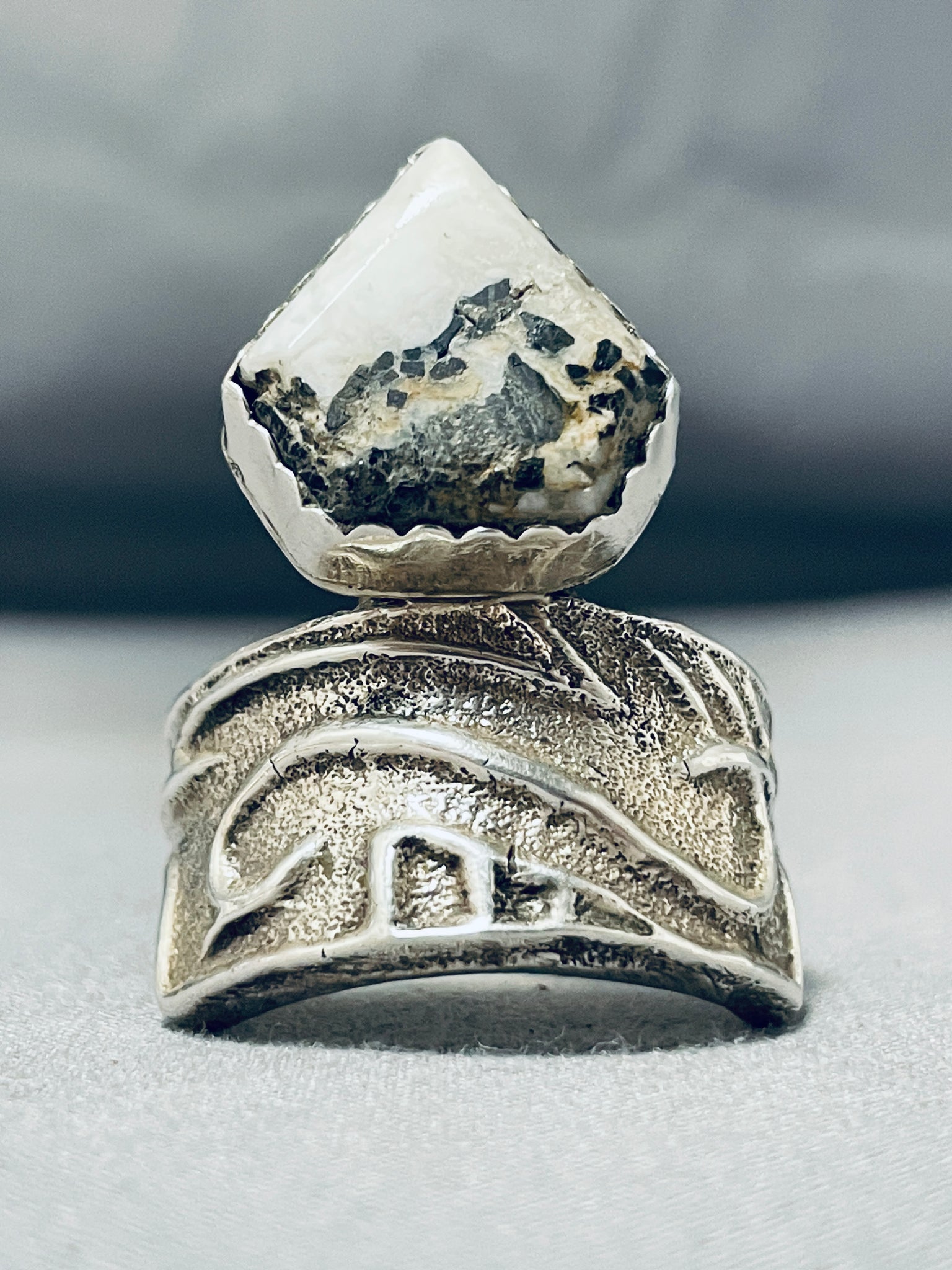 Exceptional Native American Navajo White Buffalo Turquoise Sterling Silver Ring Signed