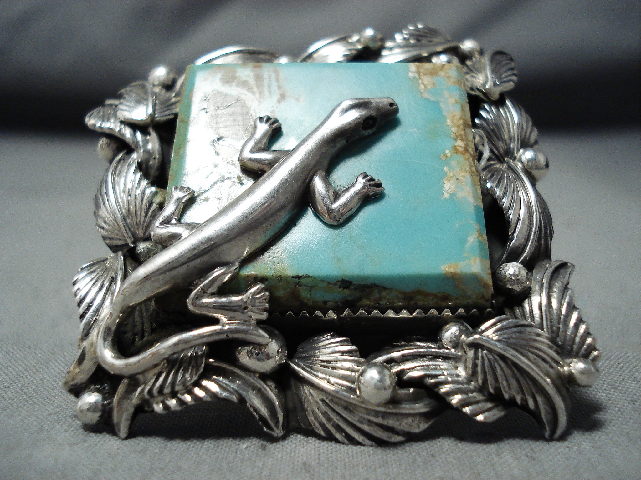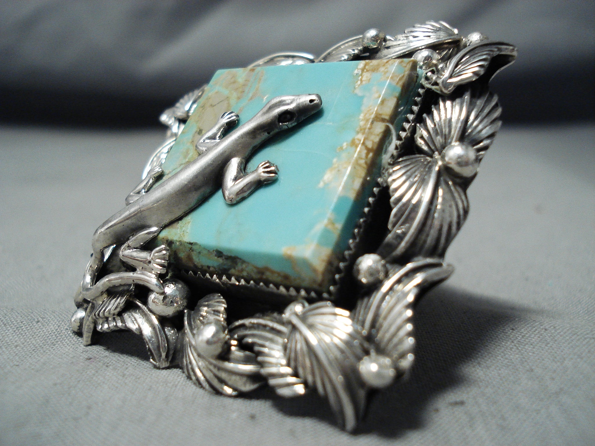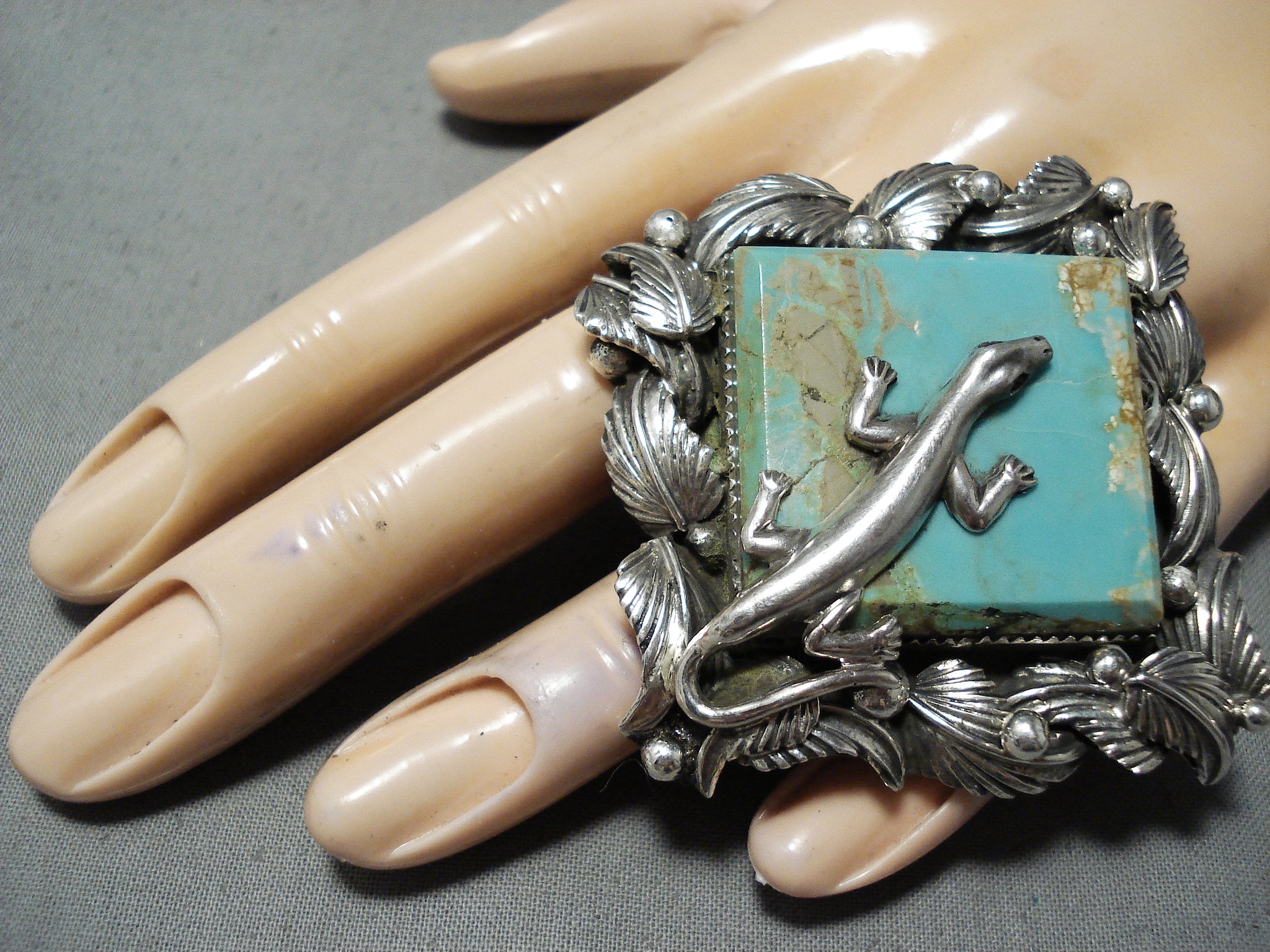 Up for sale is this huge San Felipe ring featuring a large #8 turquoise stone, a handcarved silver gecko, silver leaves, and silver beads, on a graduated quadruple silver rail band that reduces to a solid silver band! Totally Excellent! The center stone measures around 1-1/8" x 1-1/8". The ring face measures around 2" x 2". Signed by San Felipe artist, Jake Francosa. The ring size is around 9. Sterling silver, marked. Sturdy 51 grams.