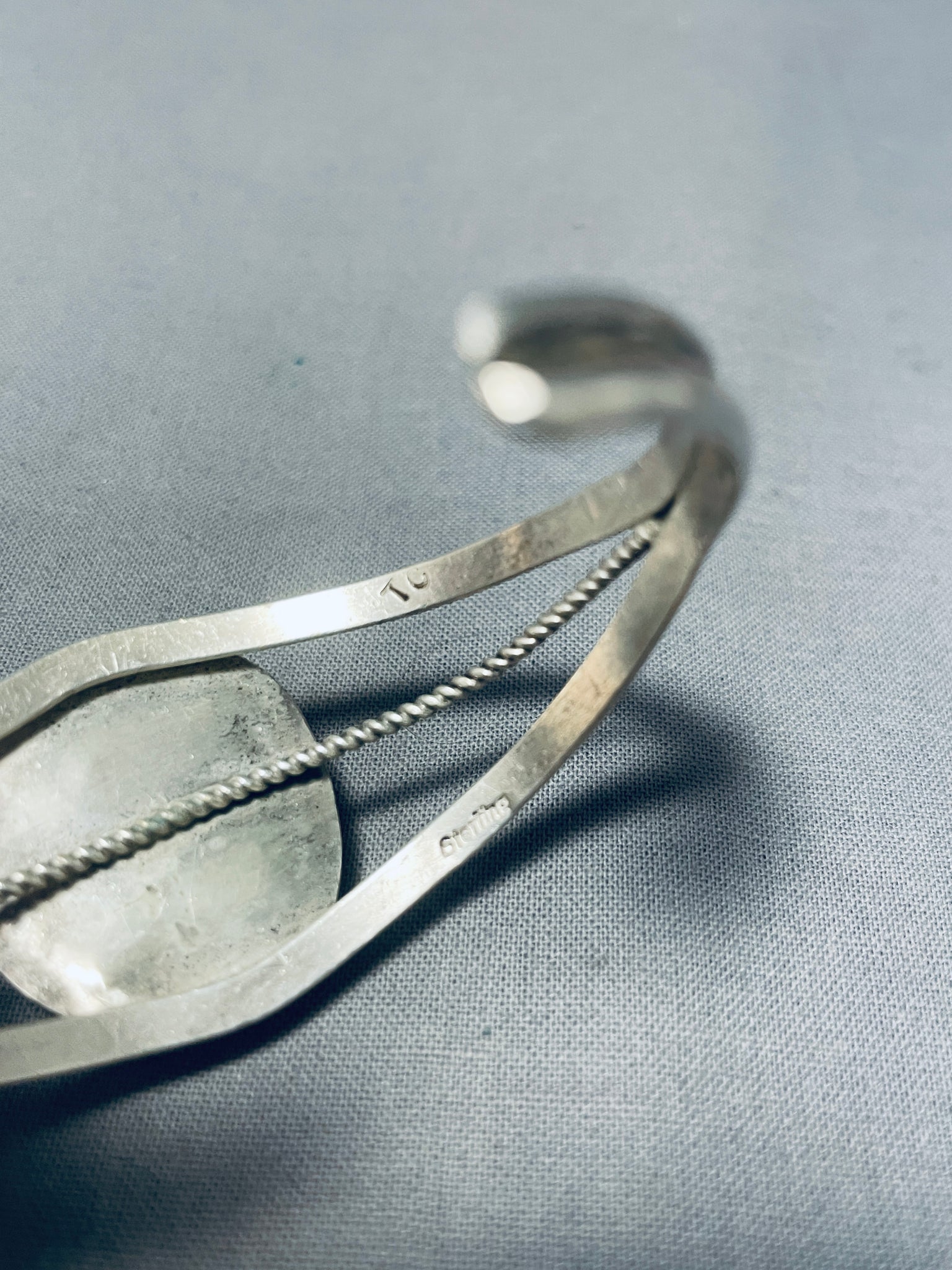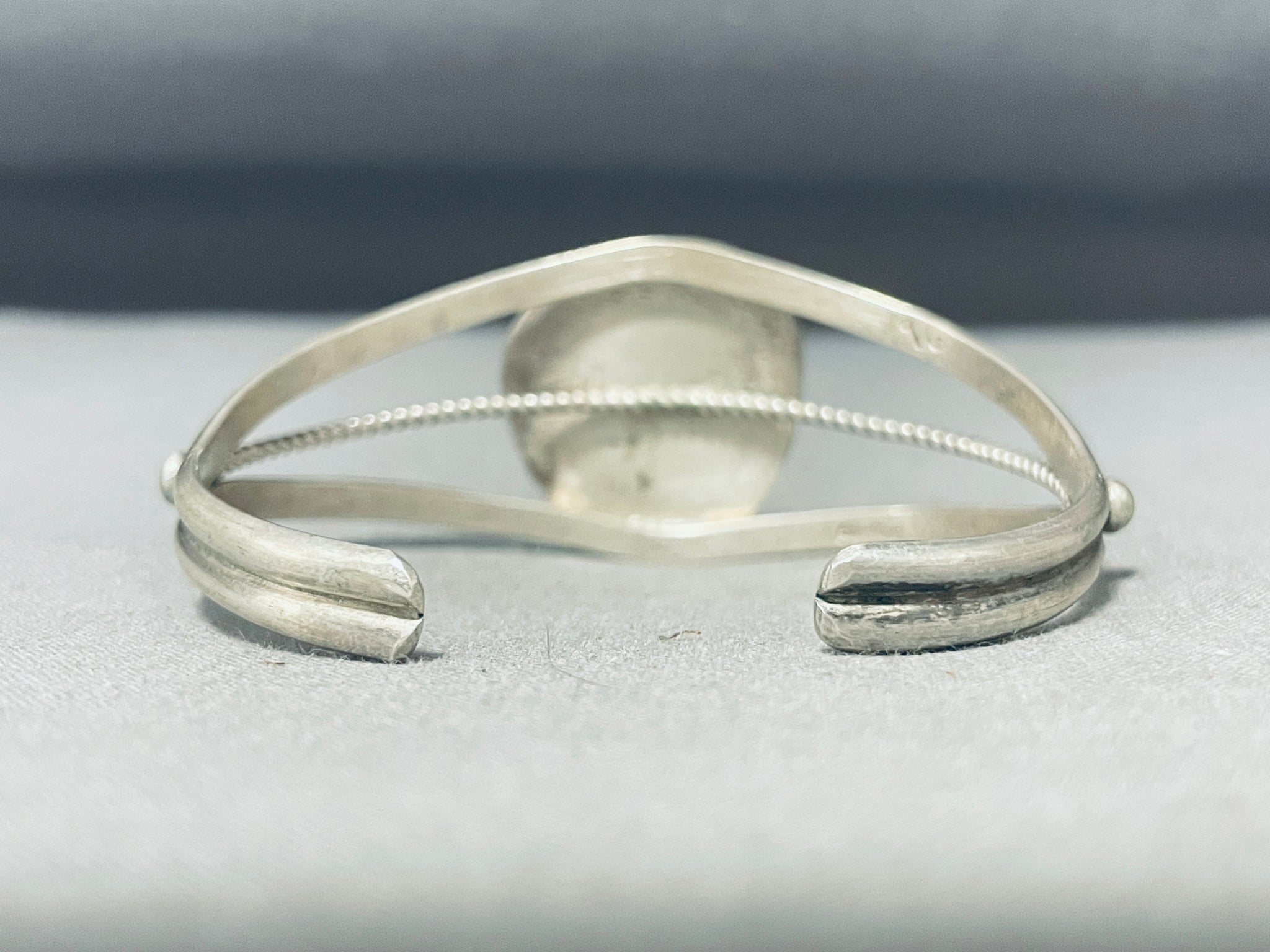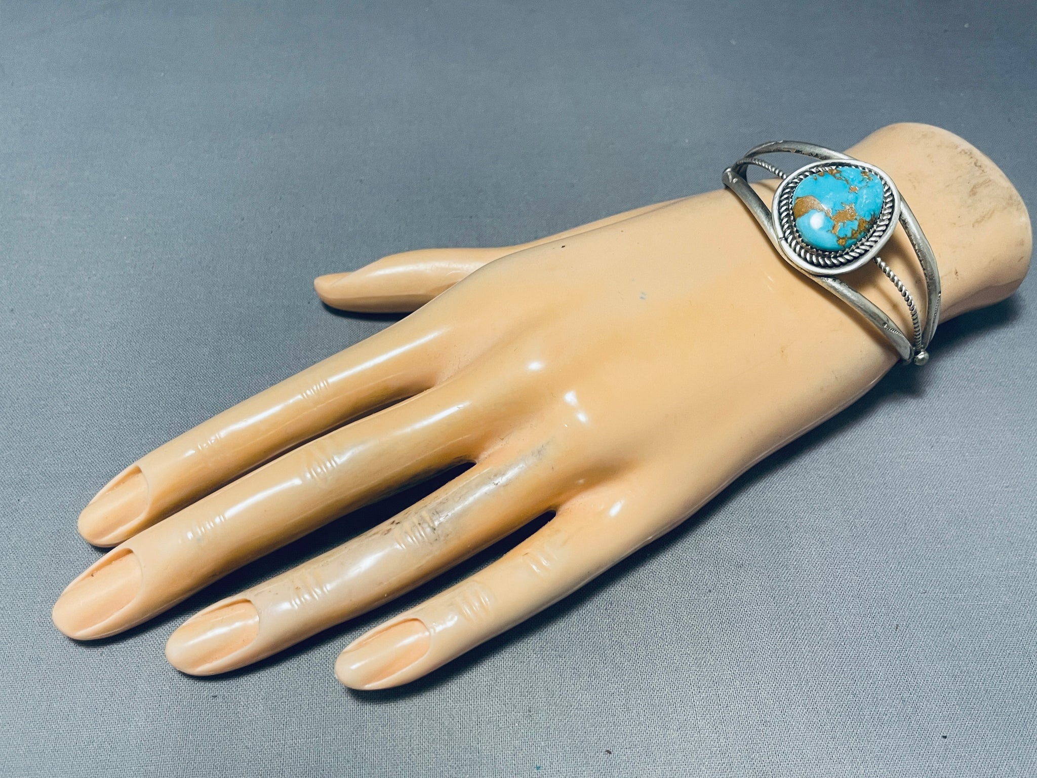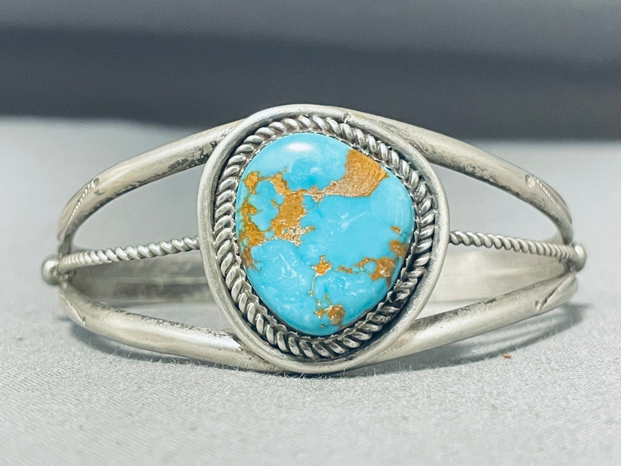Up for sale is this superlative vintage Navajo silver bracelet. The two handstamped rails of the bracelet split wide to host the large mesmerizing #8 turquoise mine stone in the center, as a center rail of pretty silver rope appears at its sides! The center stone measures around 3/4" x 5/8". The width of the bracelet measures around 1". Sterling silver, marked. The inside end to end measures around 5-1/2" with an additional 7/8" gap. Sturdy 20 grams.