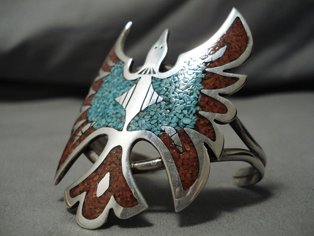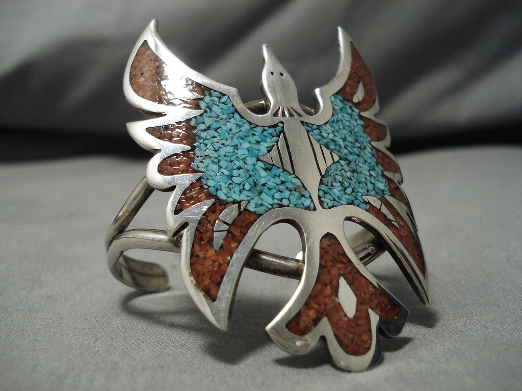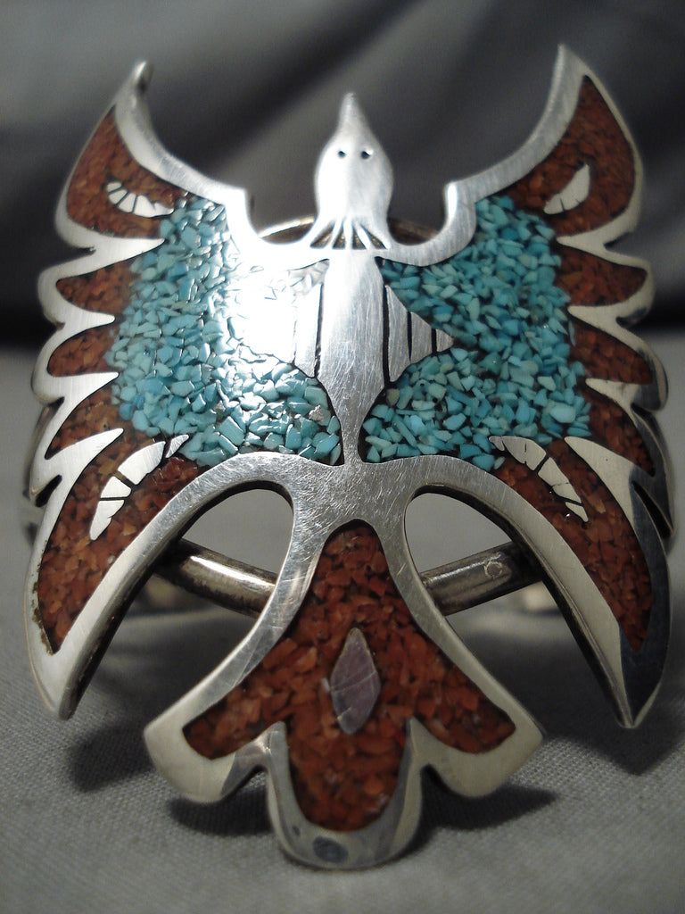 This is an exceptional Navajo inlaid thunderbird silver bracelet. This amazing piece contains a large inlaid thunderbird measuring around 2-3/4" X 2-1/8". The inlay consists of turquoise and coral. This bracelet contains a double silver shank cuff. The width of the bracelet measures around 1-3/8". Signed by Navajo artist, OTT. Sterling silver, marked. Cir. 1960's+. The inside end to end measures around 4-3/4" with an additional 1" gap. Sturdy 40 grams.