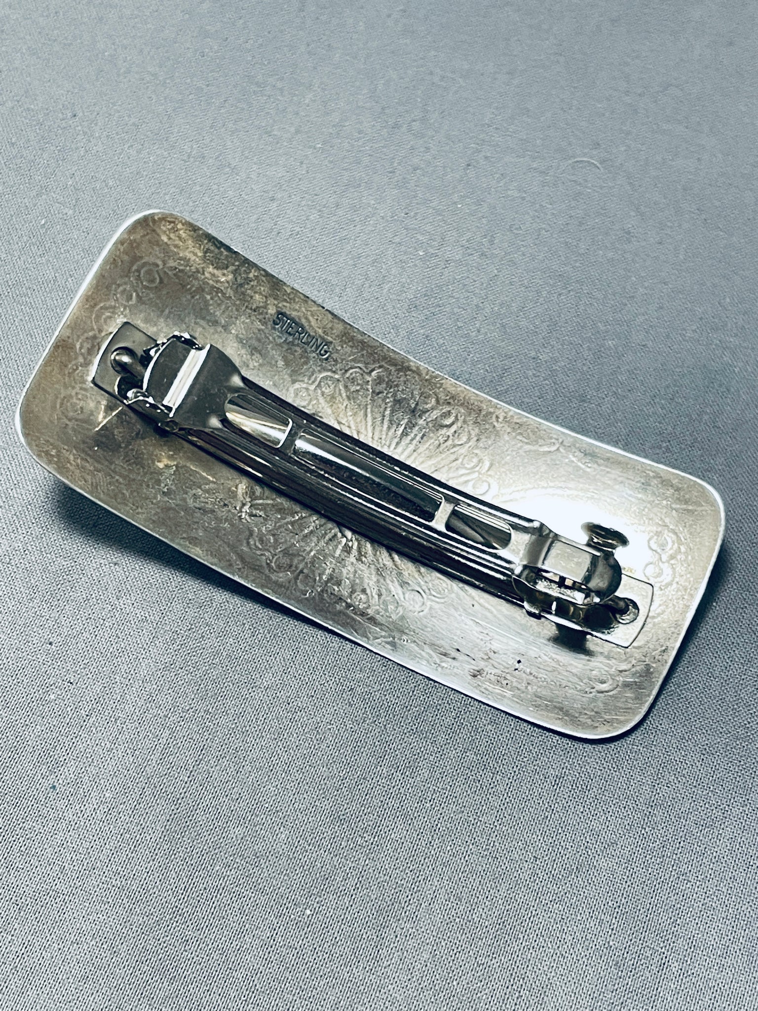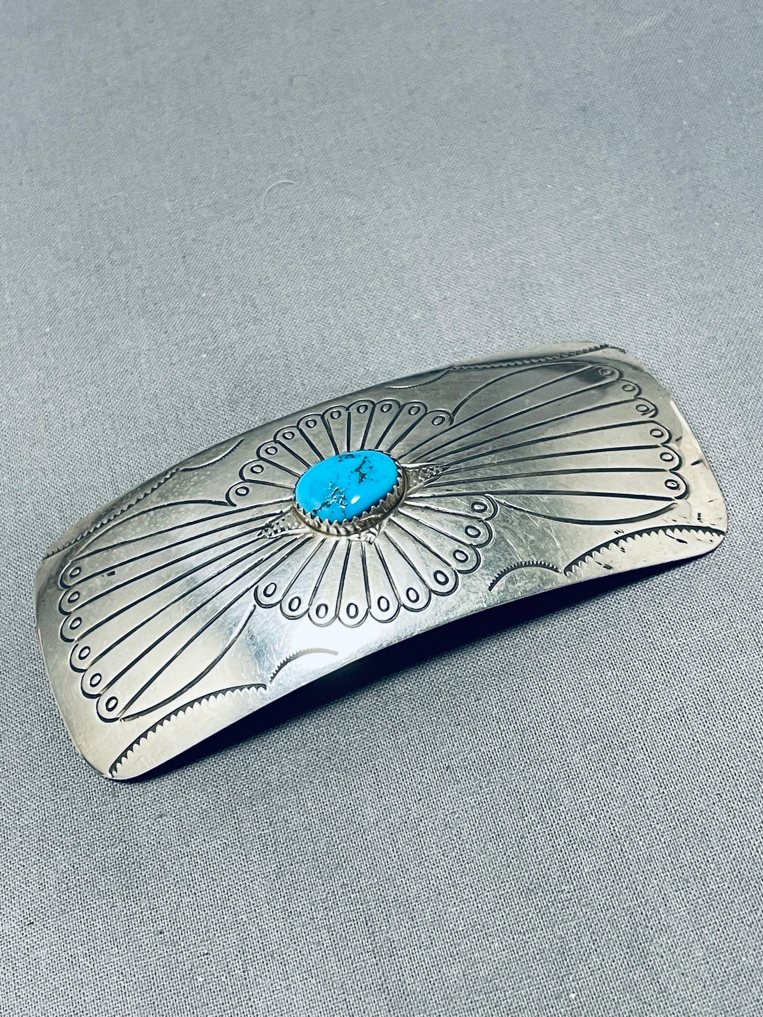 This is an impressive vintage Navajo silver hair barrette. Beautiful handstamped designs decorate this tremendous wide barrette that hosts the impressive large Kingman turquoise stone! This really looks fabulous in the hair! The center stone measures around 1/2" x 5/16". Sterling silver. The pin measures around 3-1/2" x 1-1/2". Sturdy 18 grams.
