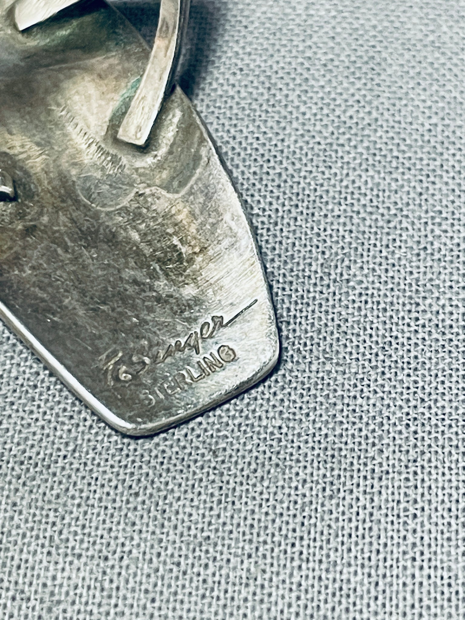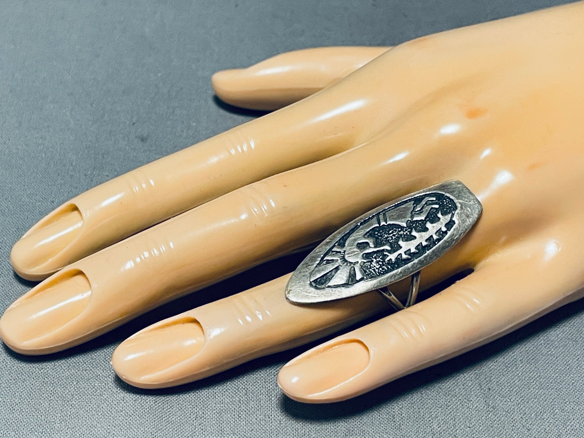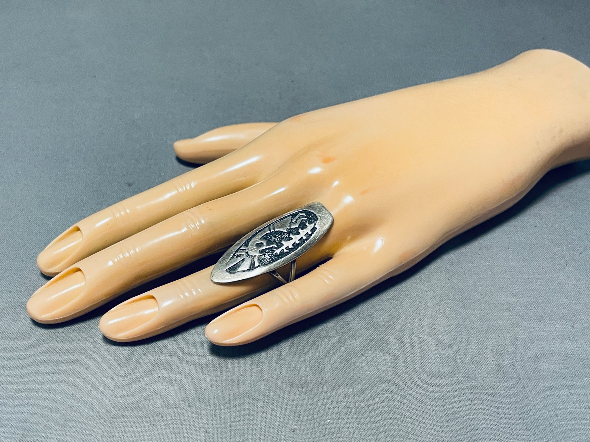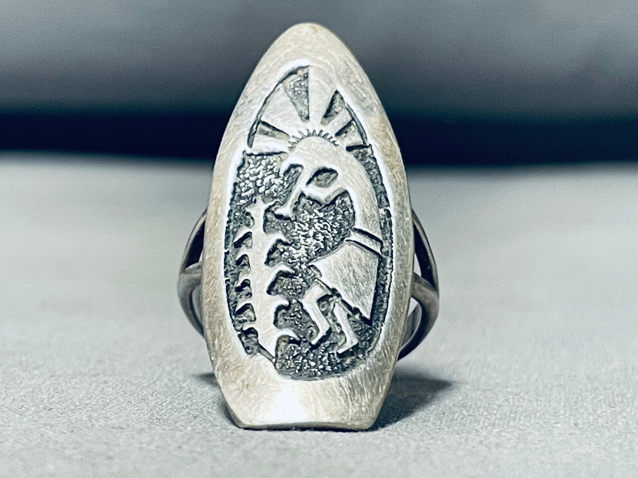 A superior vintage Navajo silver ring. Love the unique, elongated arrowhead design of this ring! The kokopelli and tall cornstalk seem to spring forth from the darker, textured center of the ring! The kokopelli is a popular and iconic figure in Native American and Southwestern Native American cultures - a bringer of music, joy, and good fortune. The figure is associated with agriculture, rainmaking, and the spirit of the land. Tommy Singer was a highly respected and influential Navajo artist known for his work in jewelry and metalwork. Born in 1940 in Winslow, Arizona, he was a self-taught silversmith and became one of the most recognized and celebrated Native American artists. He passed away on May 31, 2014. He's known for introducing new techniques and innovations in his jewelry designs. He often incorporated intricate overlay and stamp work, creating visually stunning pieces that showcased both traditional Navajo designs and his unique artistic vision. His work has had a lasting impact on Native American jewelry and art. His innovative designs and craftsmanship earned him recognition not only within the Native American community but also among collectors and enthusiasts worldwide. Tommy Singer came from a family with a tradition of jewelry making, and he passed on his skills and knowledge to his children and other family members. Today, some of his family members continue the tradition of creating jewelry in his style. The ring face measures around 1-5/8" x 3/4". Signed by Navajo artist, Tommy Singer. The ring size is around 8. Sterling silver, marked. Sturdy 8 grams.