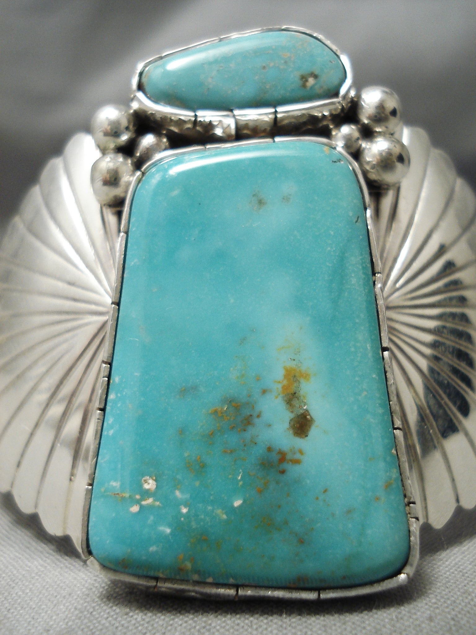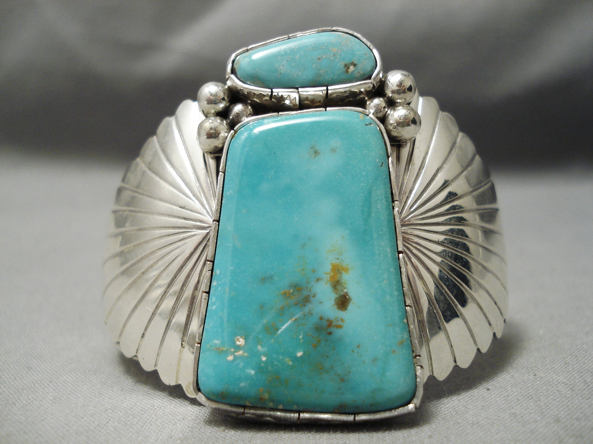 This is an exceptional vintage Navajo two stone silver bracelet. This piece contains two large turquoise stones that appear to be from the fascinating old Carico Lake turquoise mine. Resting at the sides of the wonderful double silver shank cuff are colossal sun bursting silver flanks with accenting silver raindrops around the stones. I just love this bracelet. The largest stone measures around 1-3/8" x 7/8". The width of the bracelet measures around 1-5/8". Signed by Navajo artist, Lelend Bennett . Sterling silver, marked. Cir. 1970's+. The inside end to end measures around 5-3/4" with an additional 3/4" gap. Sturdy 52 grams.