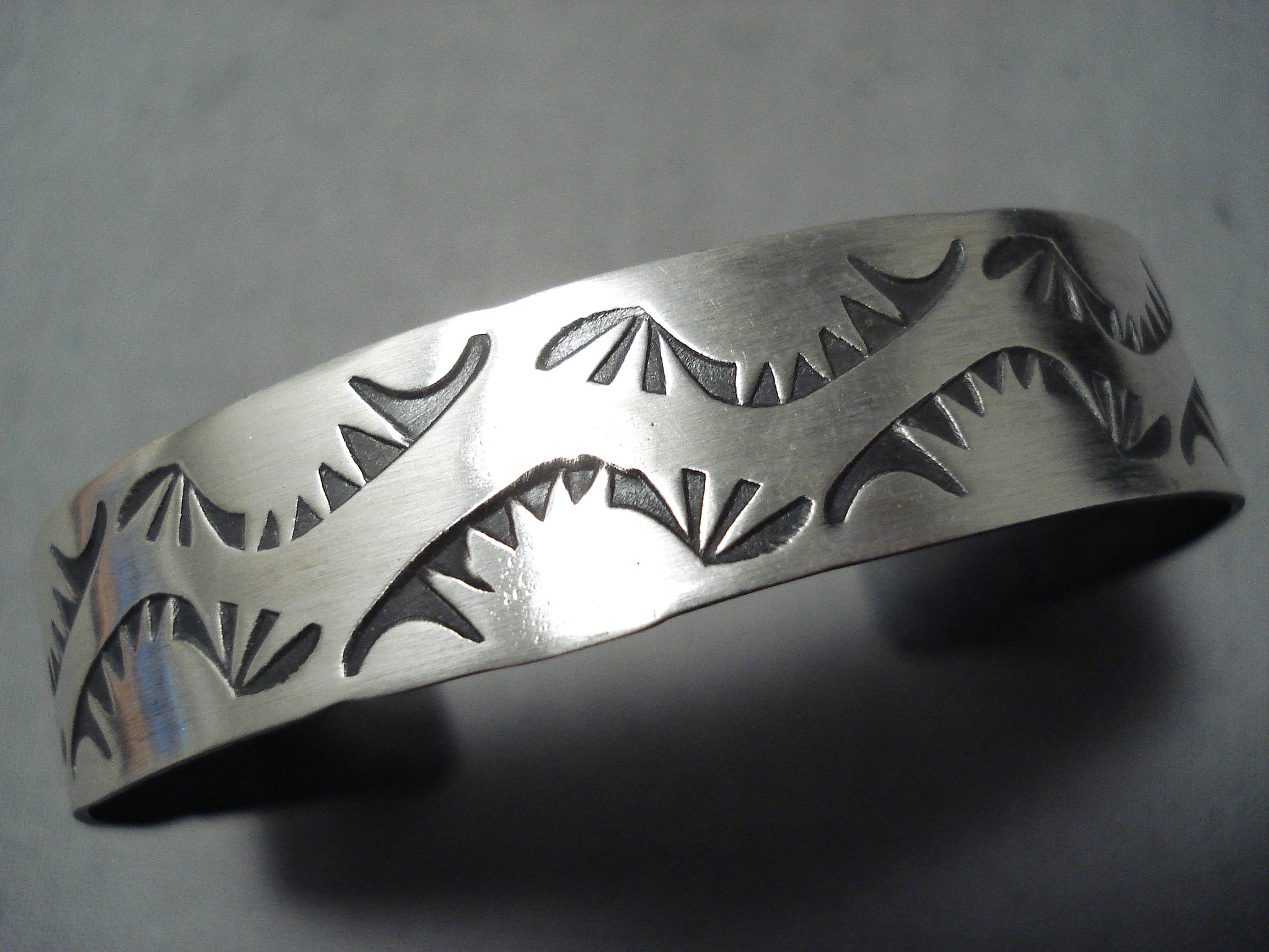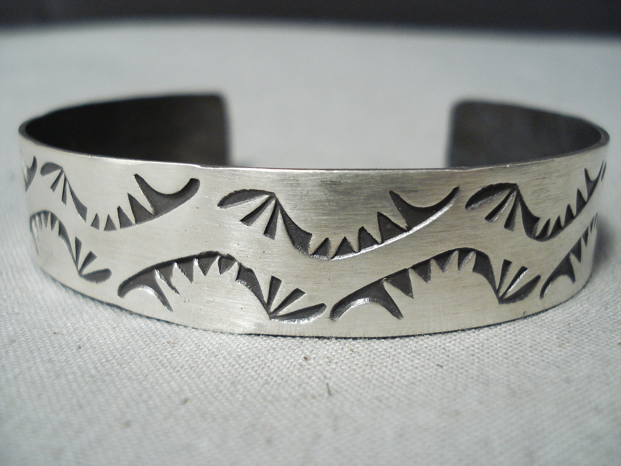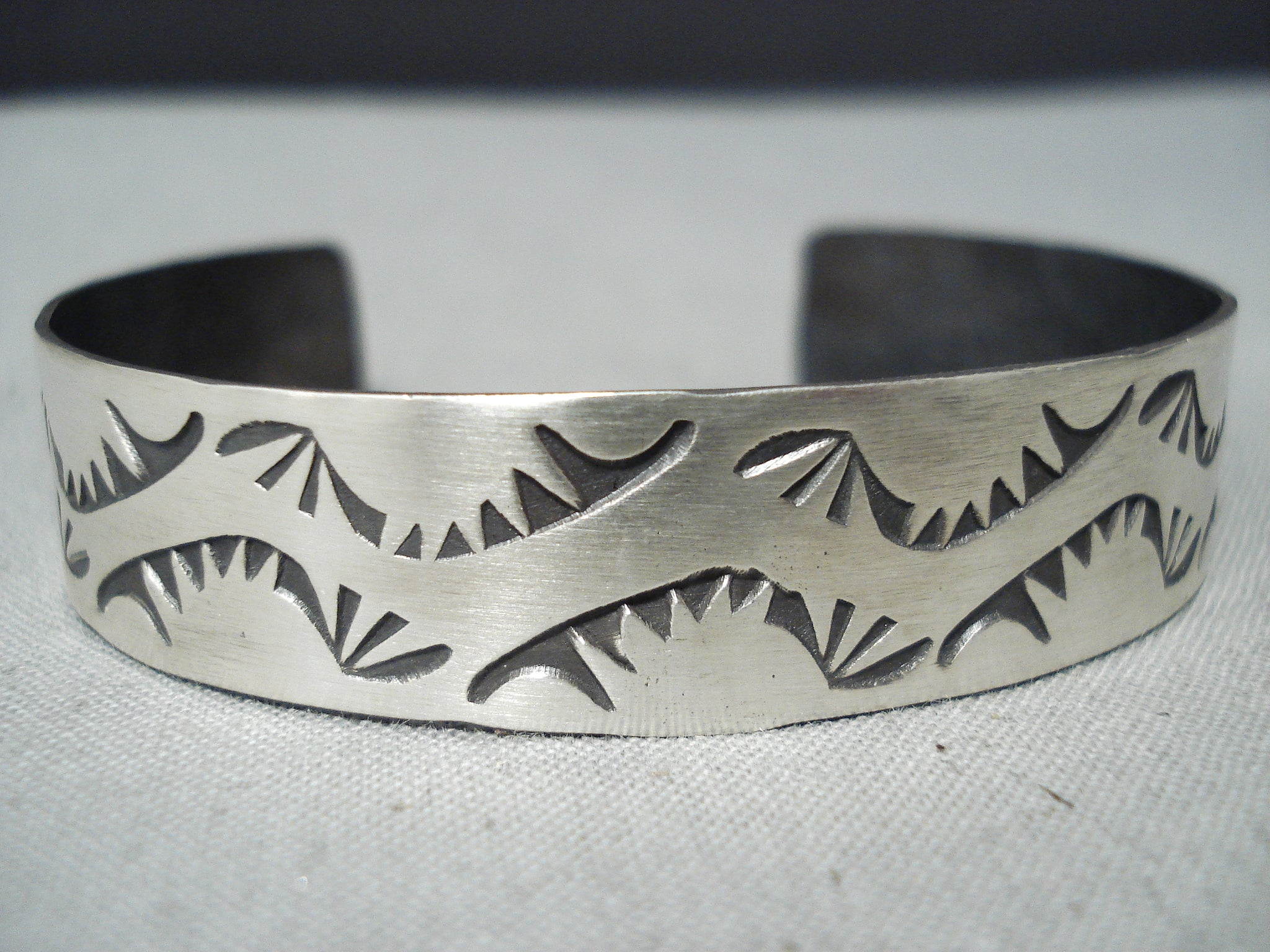 This is an amazing vintage Navajo silver bracelet. From end to end, these unique handstamped wave designs beautifully decorate the entire cuff! The width of the bracelet measures around 1/2". Sterling silver, marked. The inside end to end measures around 5-1/8" with an additional 1-1/8" gap. Sturdy 16 grams.