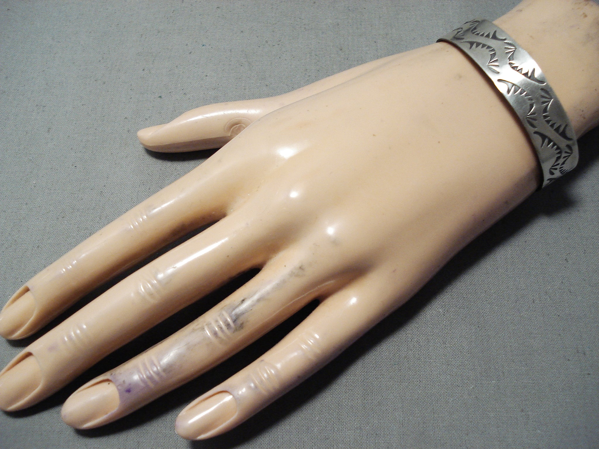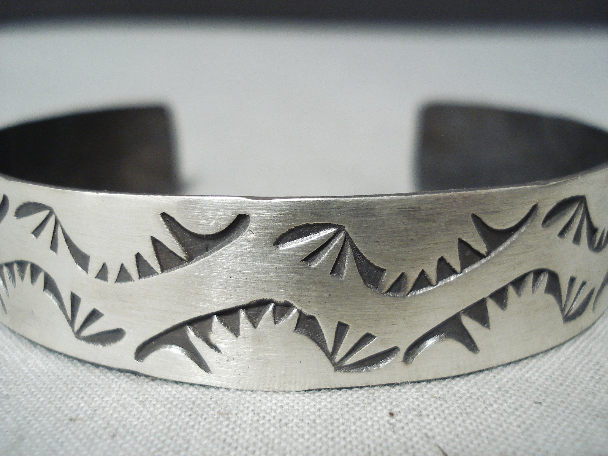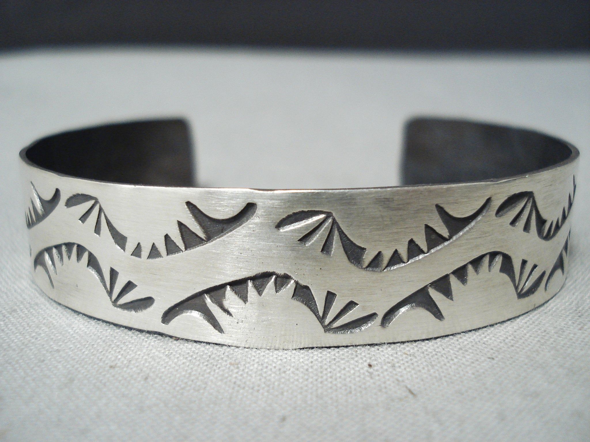 This is an amazing vintage Navajo silver bracelet. From end to end, these unique handstamped wave designs beautifully decorate the entire cuff! The width of the bracelet measures around 1/2". Sterling silver, marked. The inside end to end measures around 5-1/8" with an additional 1-1/8" gap. Sturdy 16 grams.