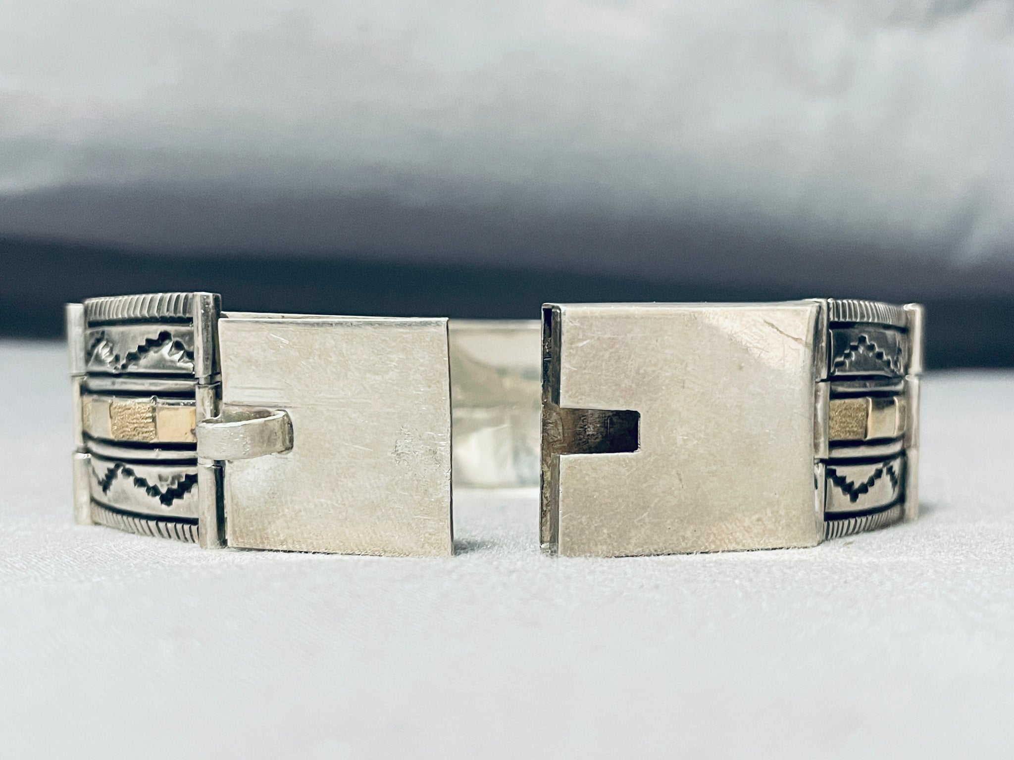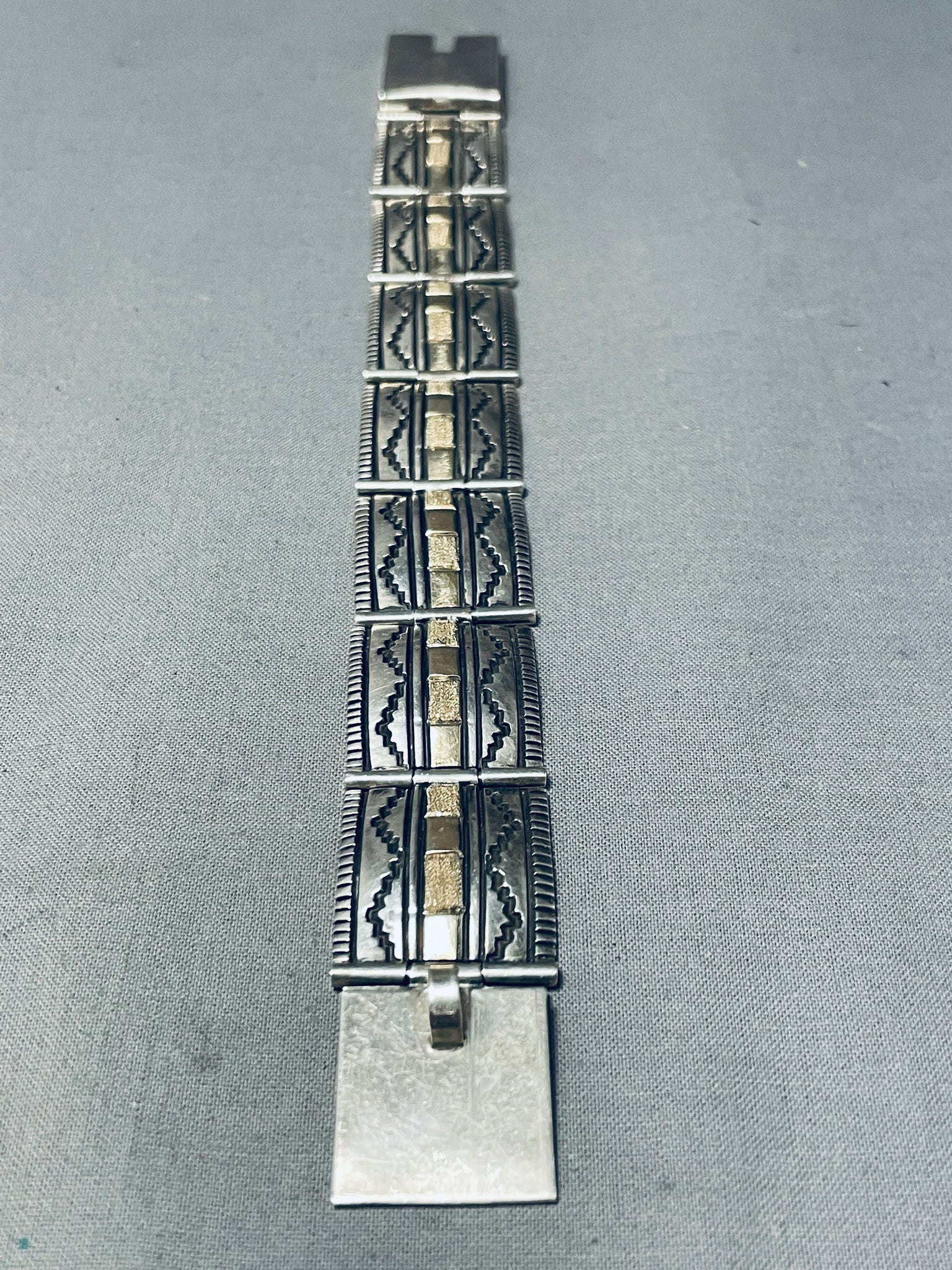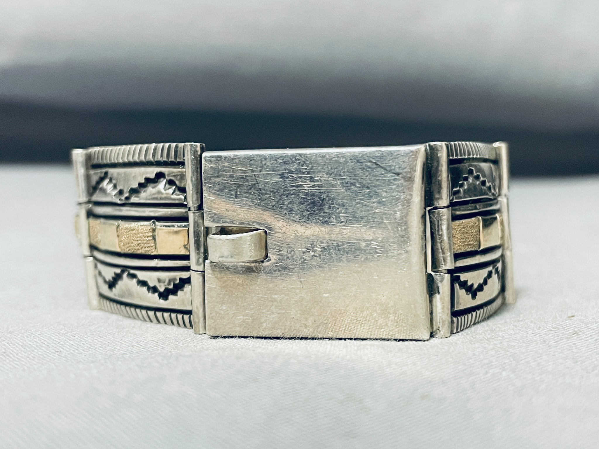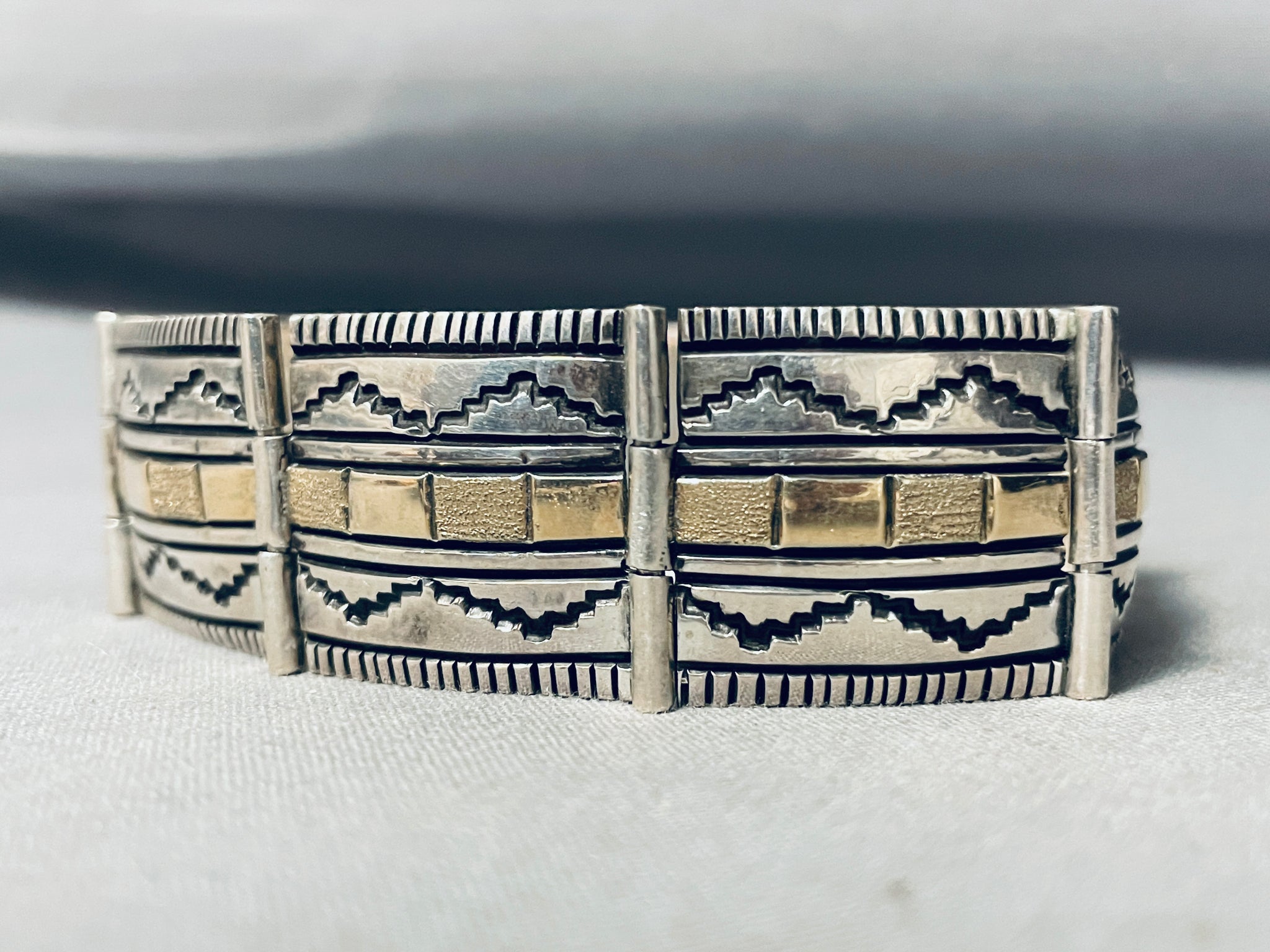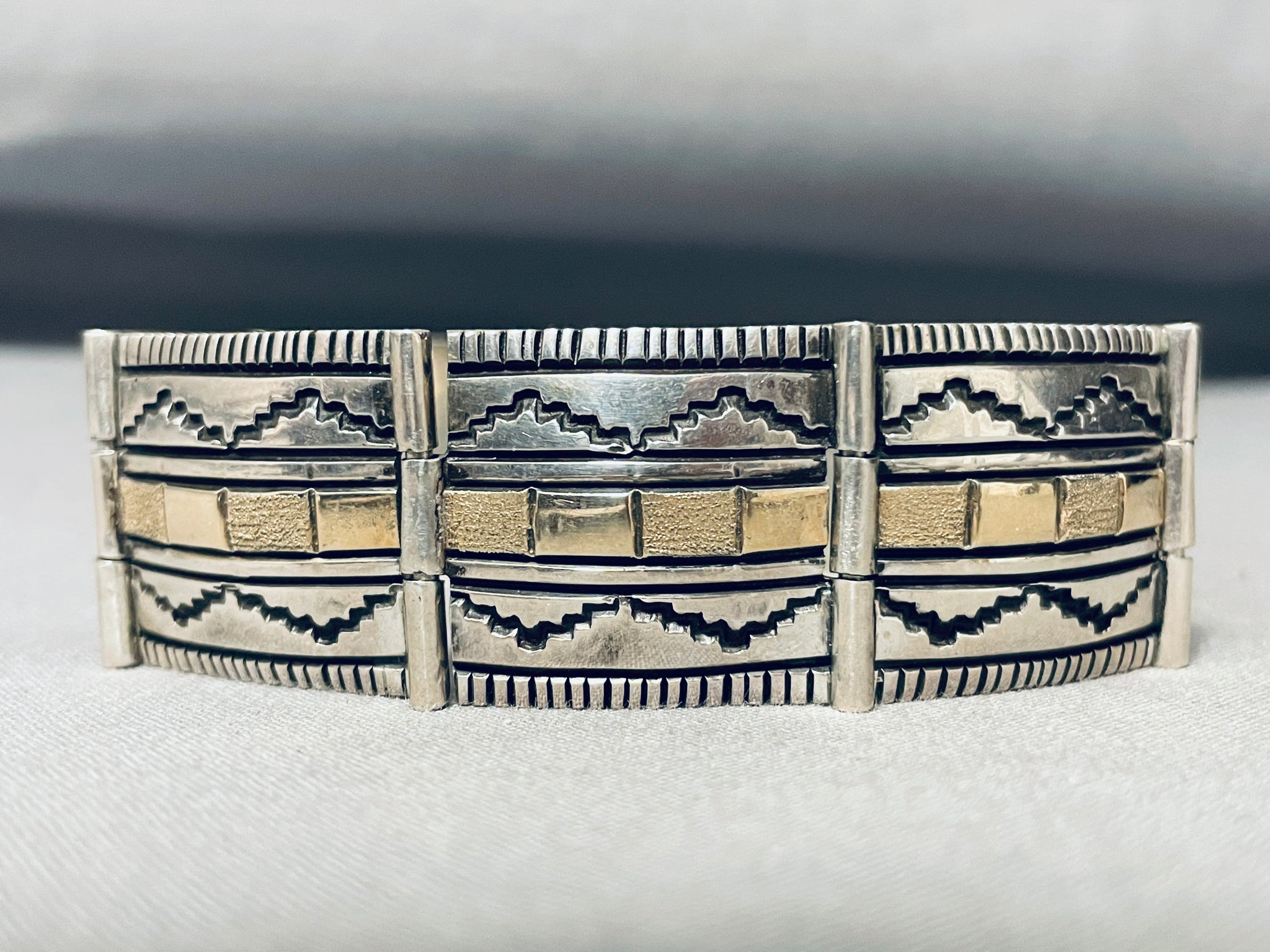 Expertly Detailed Vintage Native American Navajo Gold Sterling Silver Sectional Bracelet