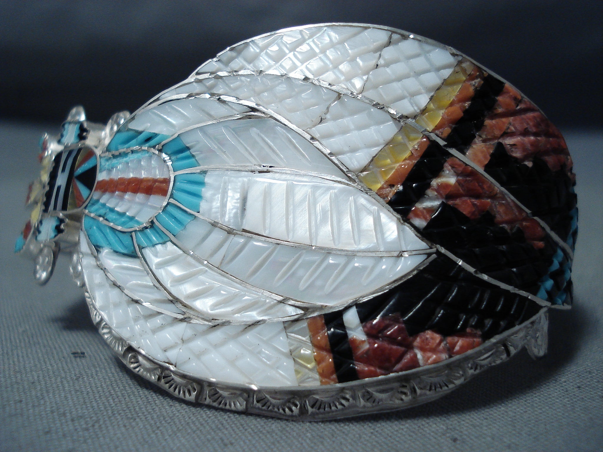 Up for sale is this wonderful vintage Zuni silver bracelet. This is a fascinating sunface and feather design cuff of colorful, textured inlay stones that include turquoise, coral, mother of pearl, spiny oyster and jet that uniquely wrap around the 2-rail cuff! Look for matching pieces in our other listings. The width of the bracelet measures around 1-1/2". Signed by Zuni artist, Eldred Martinez. Sterling silver. The inside end to end measures around 5-5/8" with an additional 1-5/8" gap. Sturdy 32 grams.