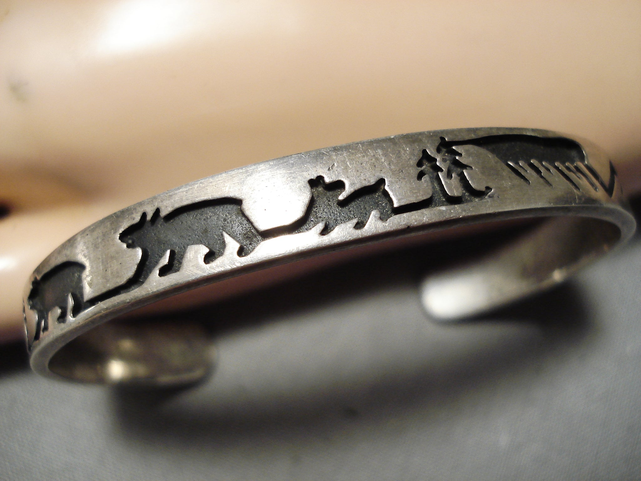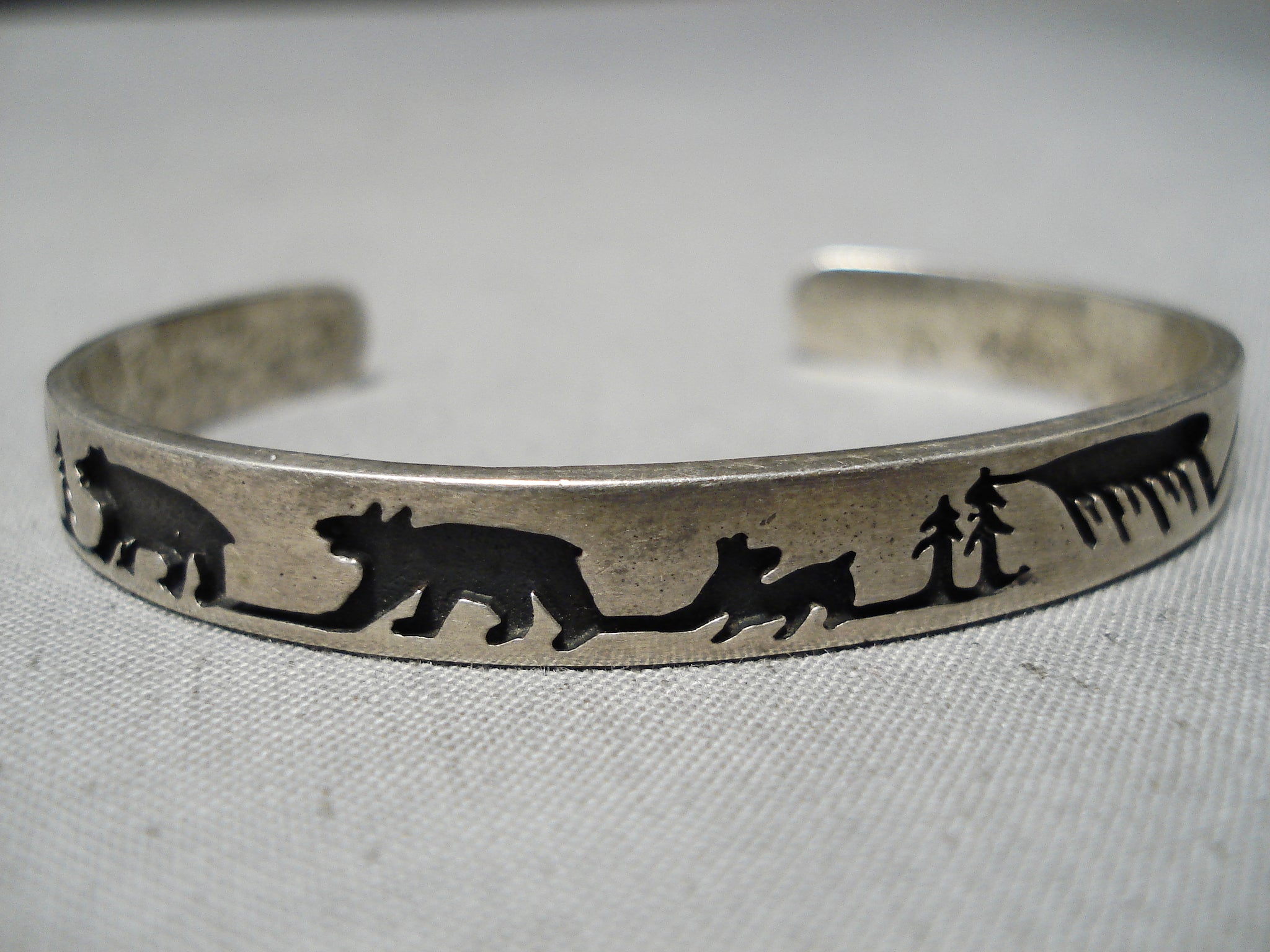 Here we have an amazing vintage Navajo silver bracelet. Done with the silver overlay technique, the face of this bracelet is a pictorial of marching bears, trees, clouds and a lightning bolt! So cool! The width of the bracelet measures around 1/4". Sterling silver. The inside end to end measures around 5" with an additional 1-1/8" gap. Sturdy 16 grams. Cir mid to late century.