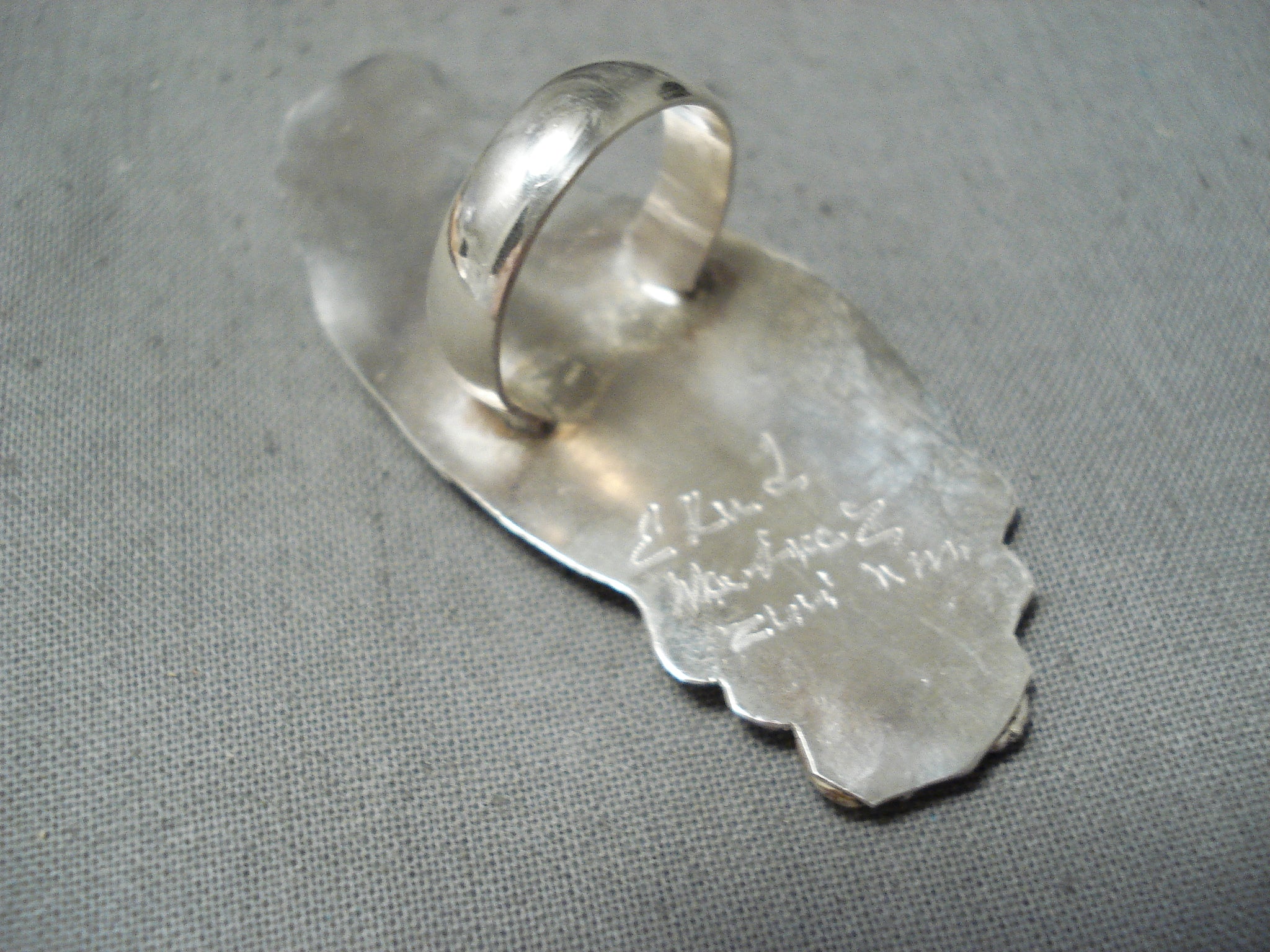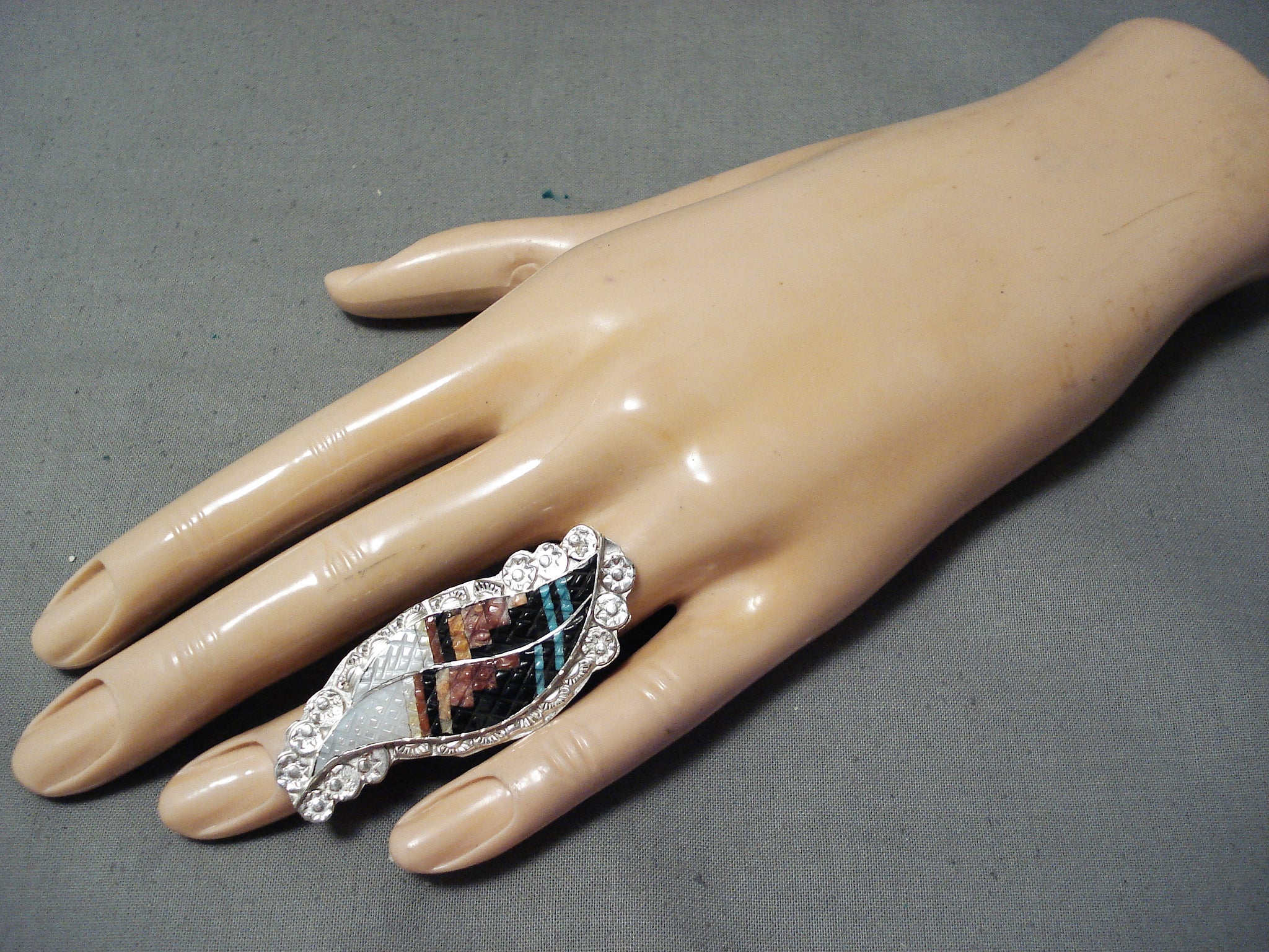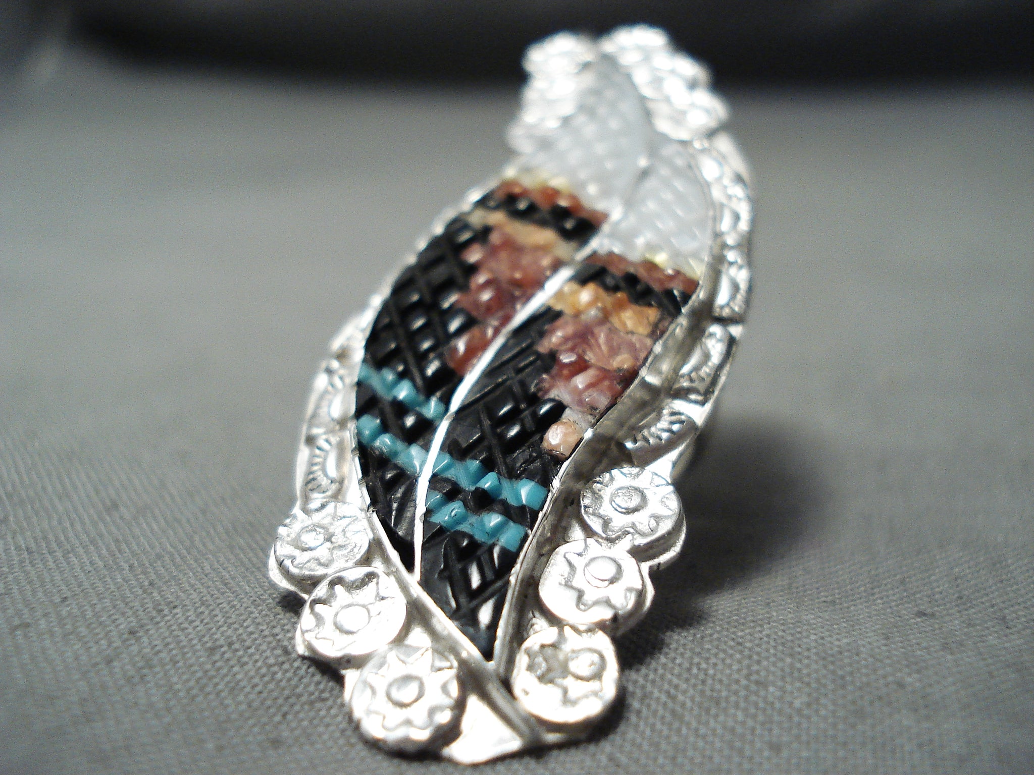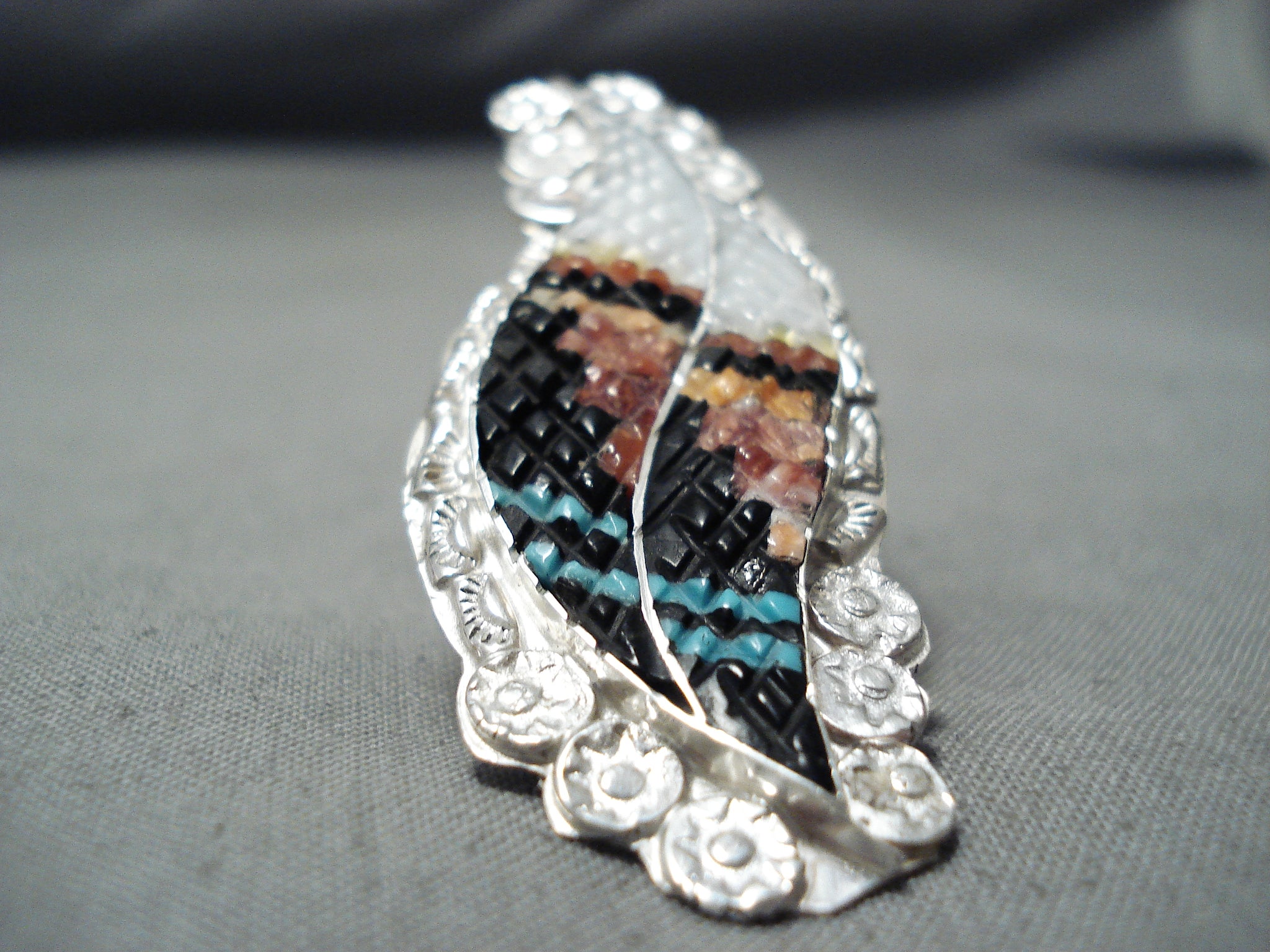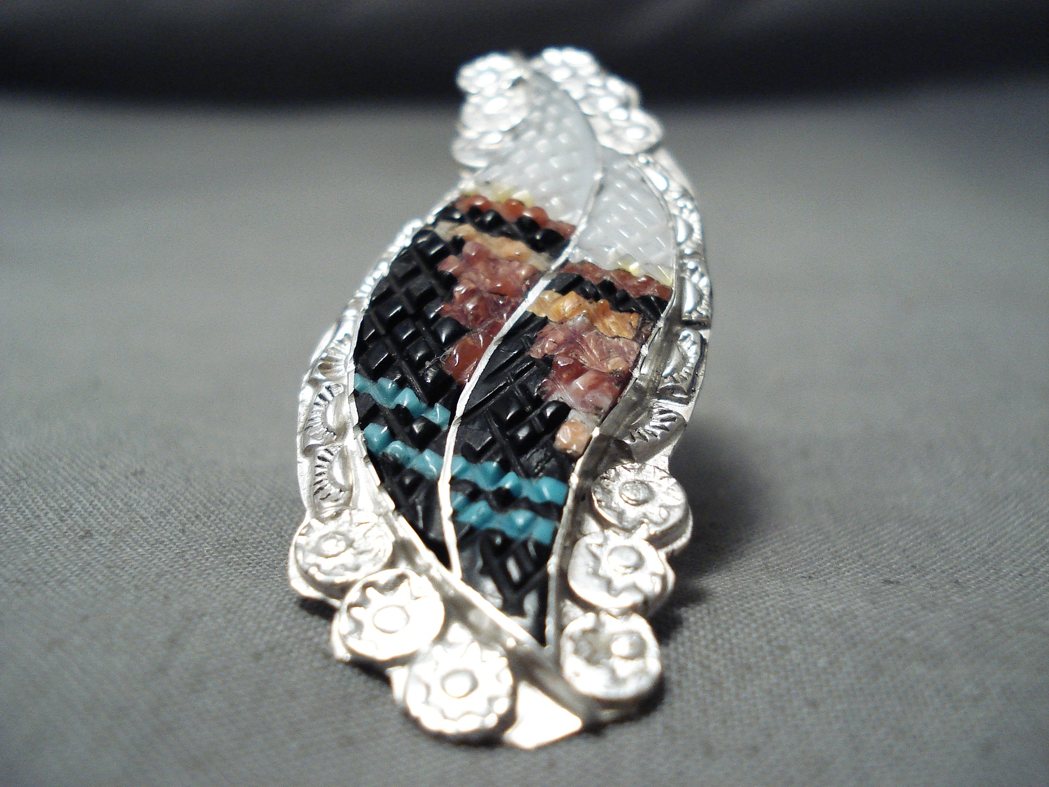 Exquisite Native American Zuni Textured Inlay Turquoise Coral Jet Sterling Silver Ring