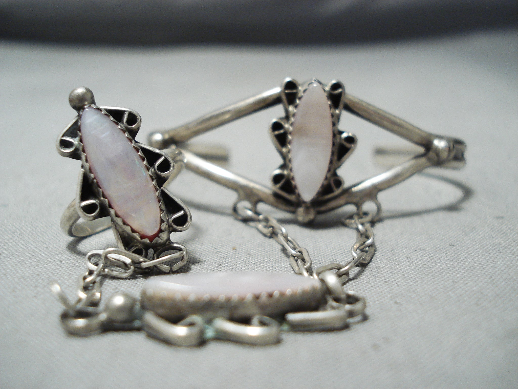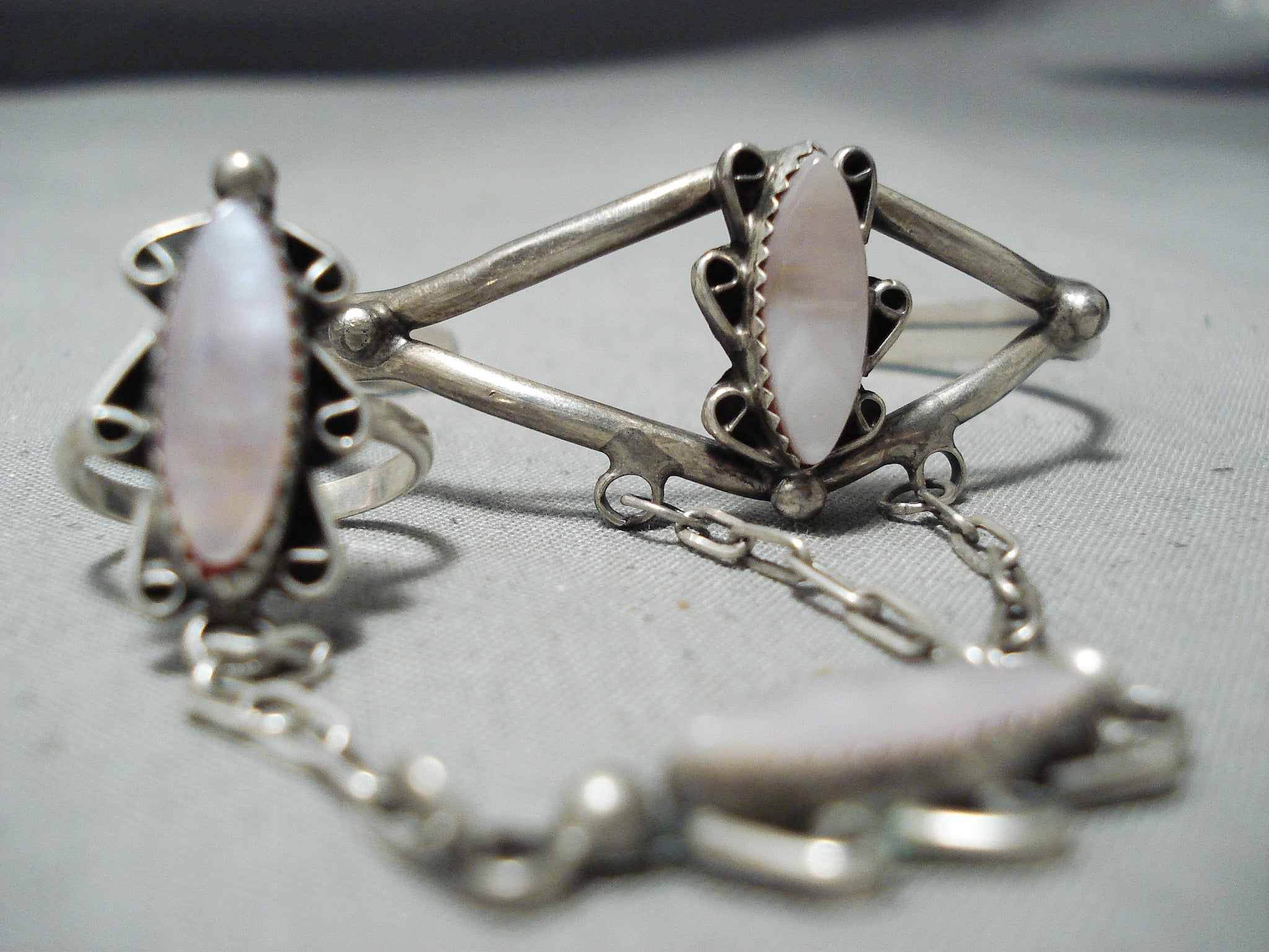 Here we have an impressive Navajo silver slave bracelet having abalone centers with handcarved silver stem borders and silver bead accents! The bracelet has a handcarved graduated double silver rail cuff. The ring has a handcarved solid silver band and is linked by a handmade silver chain with an abalone pendant! Absolutely Amazing! The ring size is about 6. Ring face measures around 7/8" x 3/8". The stones measure around 5/8" x 1/4". The width of the bracelet measures around 3/4". Sterling silver, marked. Cir mid century. The inside end to end measures around 4-1/2" with an additional 1-1/8" gap. Sturdy 15 grams.