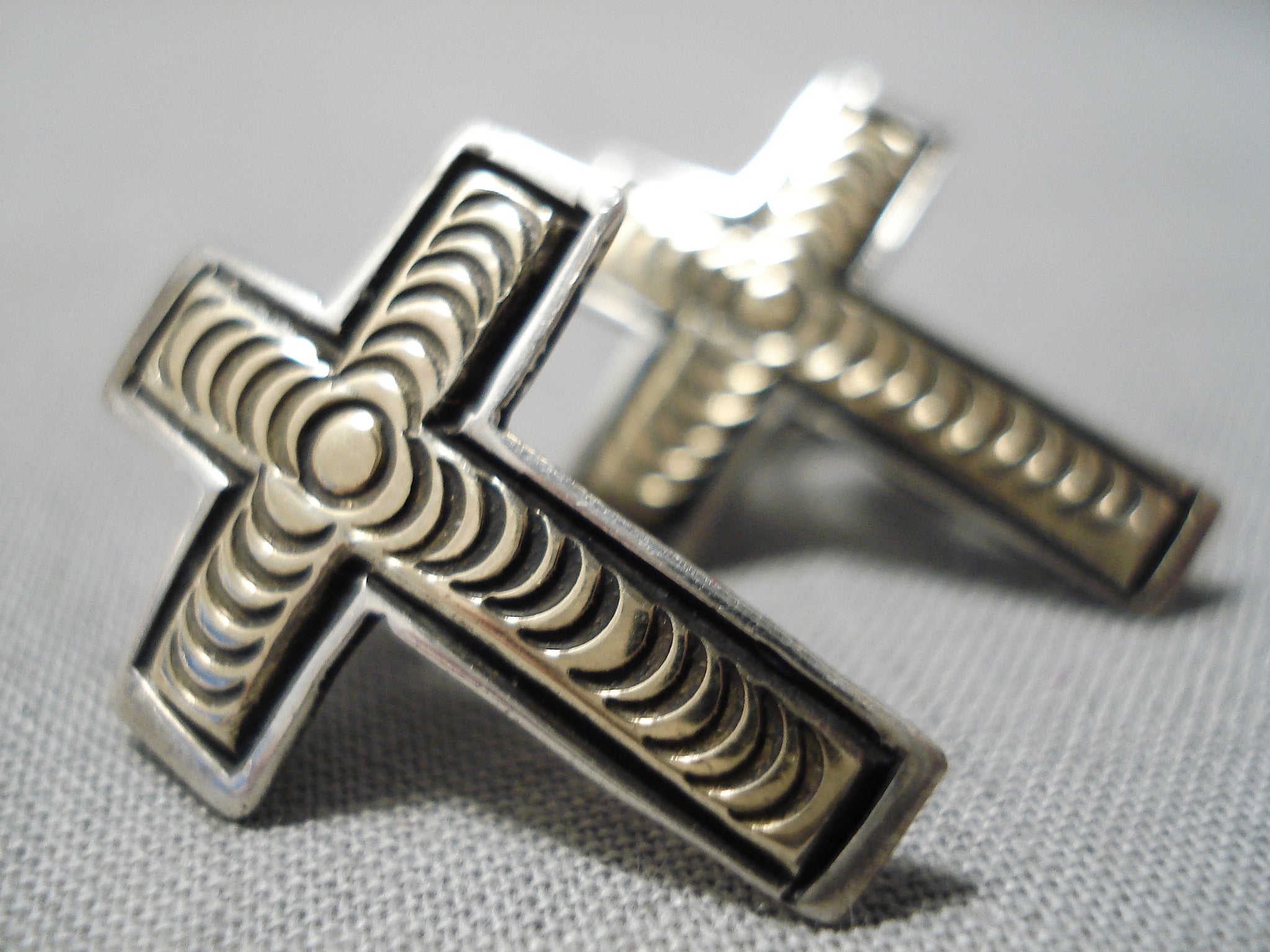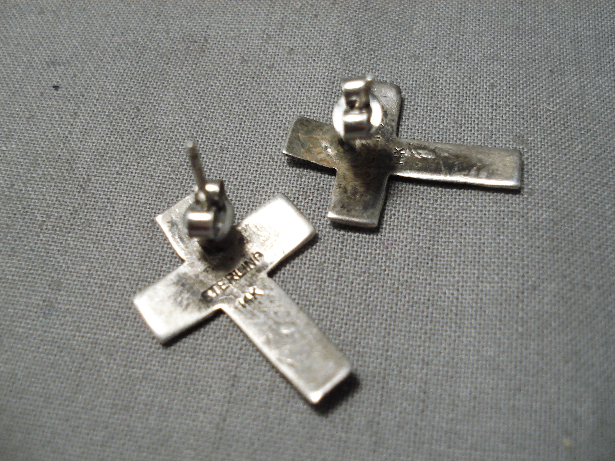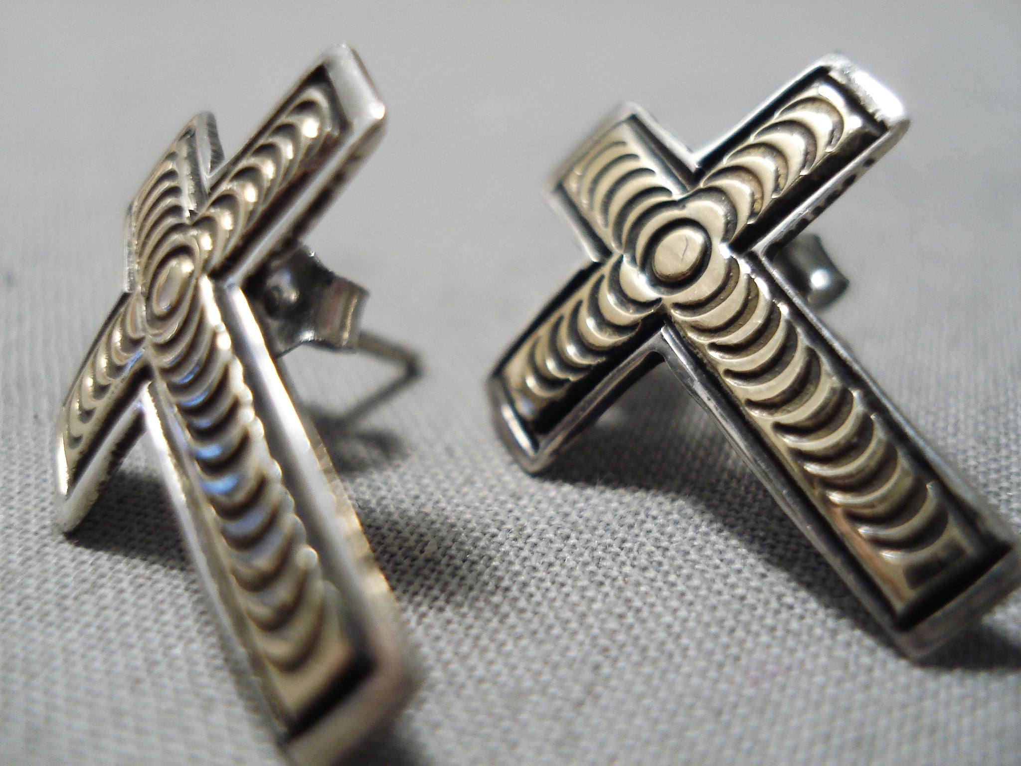 Exquisite Vintage Native American Navajo 14k Gold Cross Sterling Silver Earrings