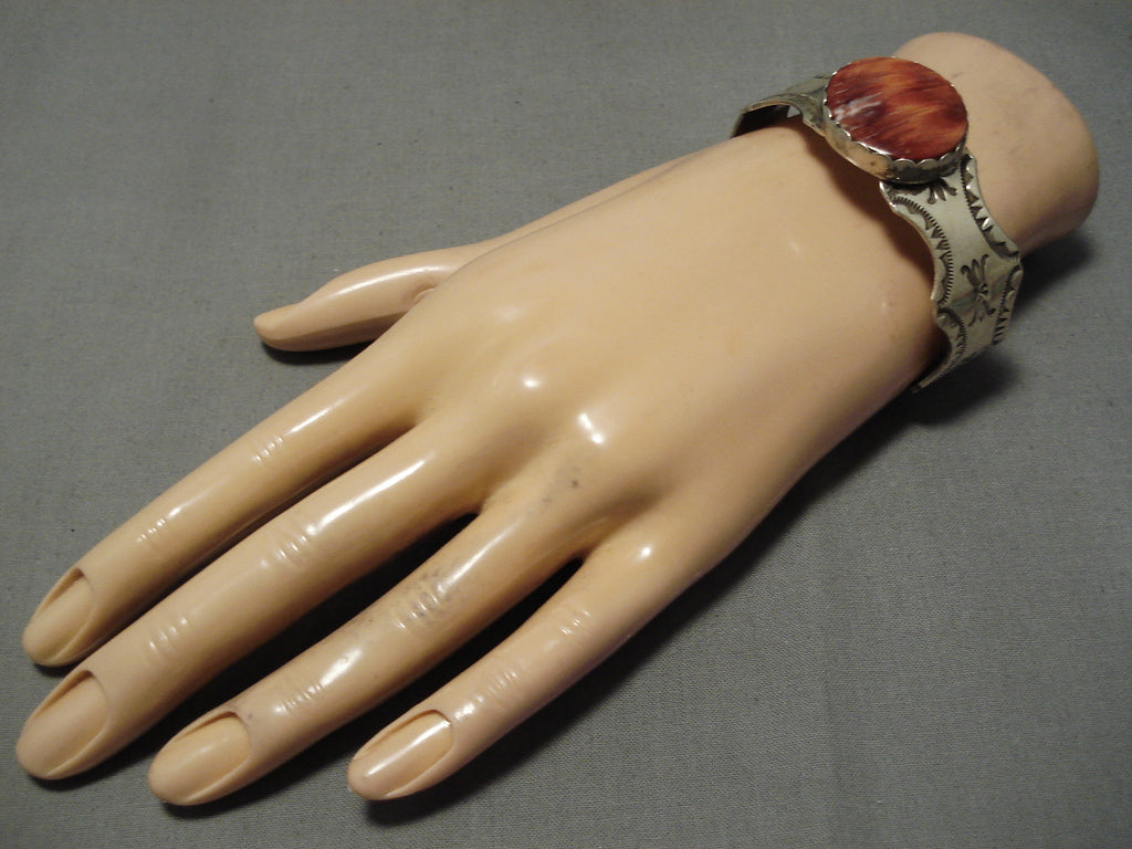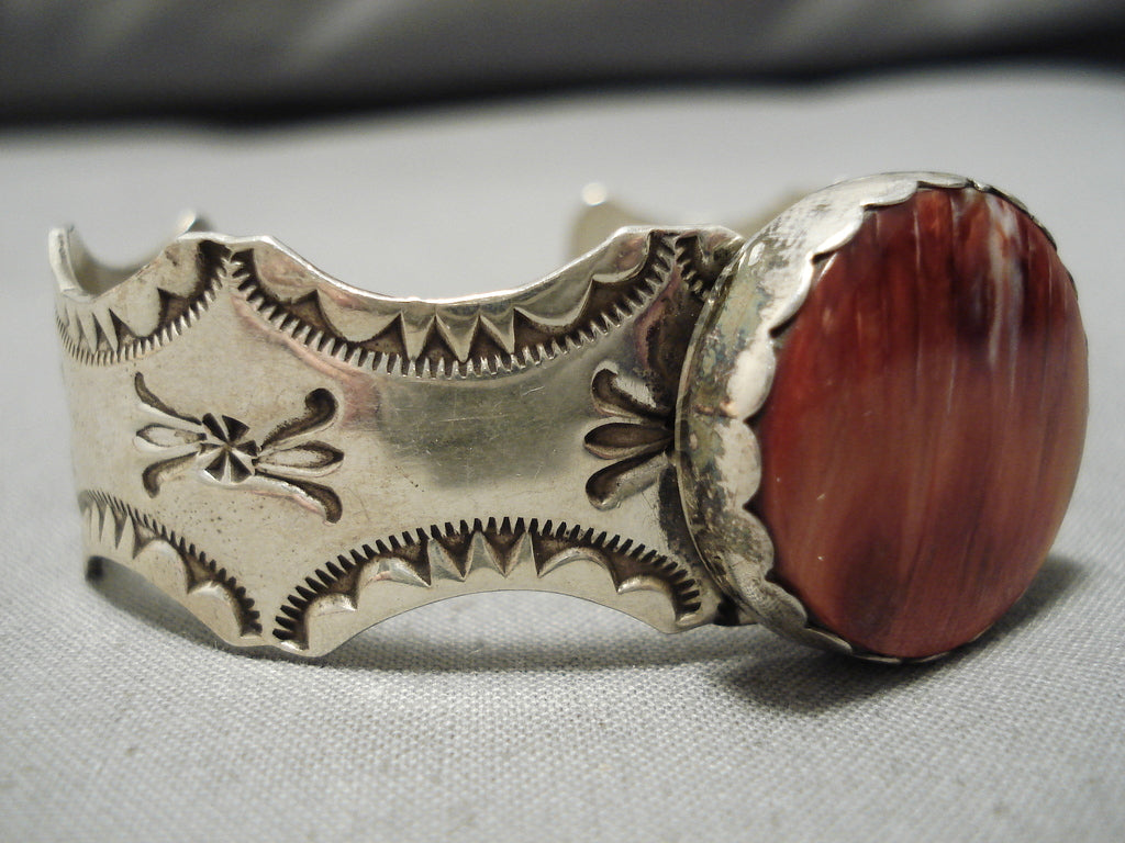 Exquisite Vintage Native American Navajo Red Spiny Oyster Shell Sterling Silver Bracelet Cuff