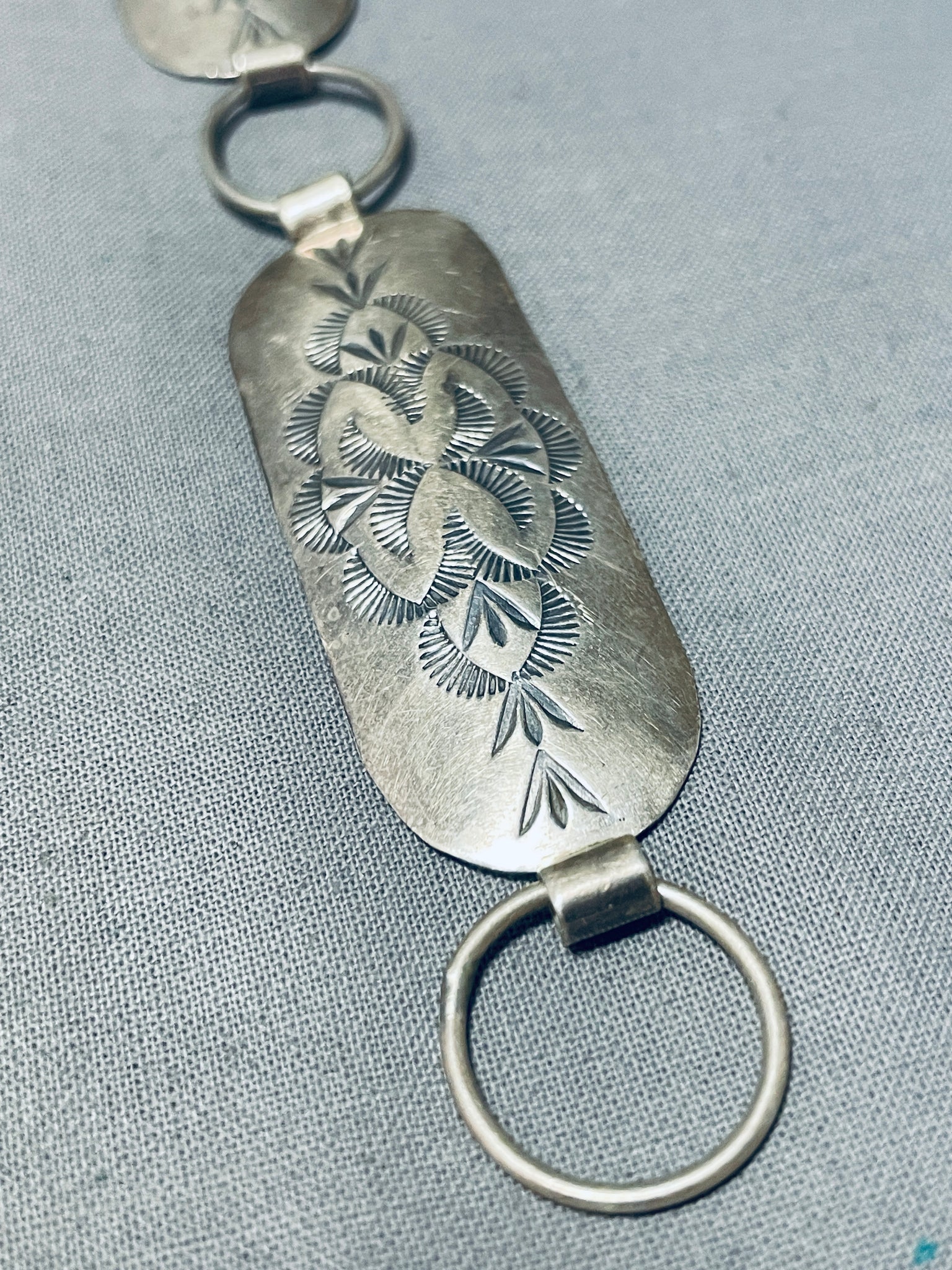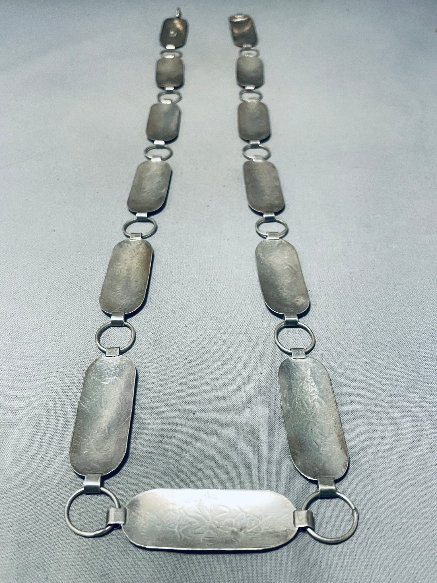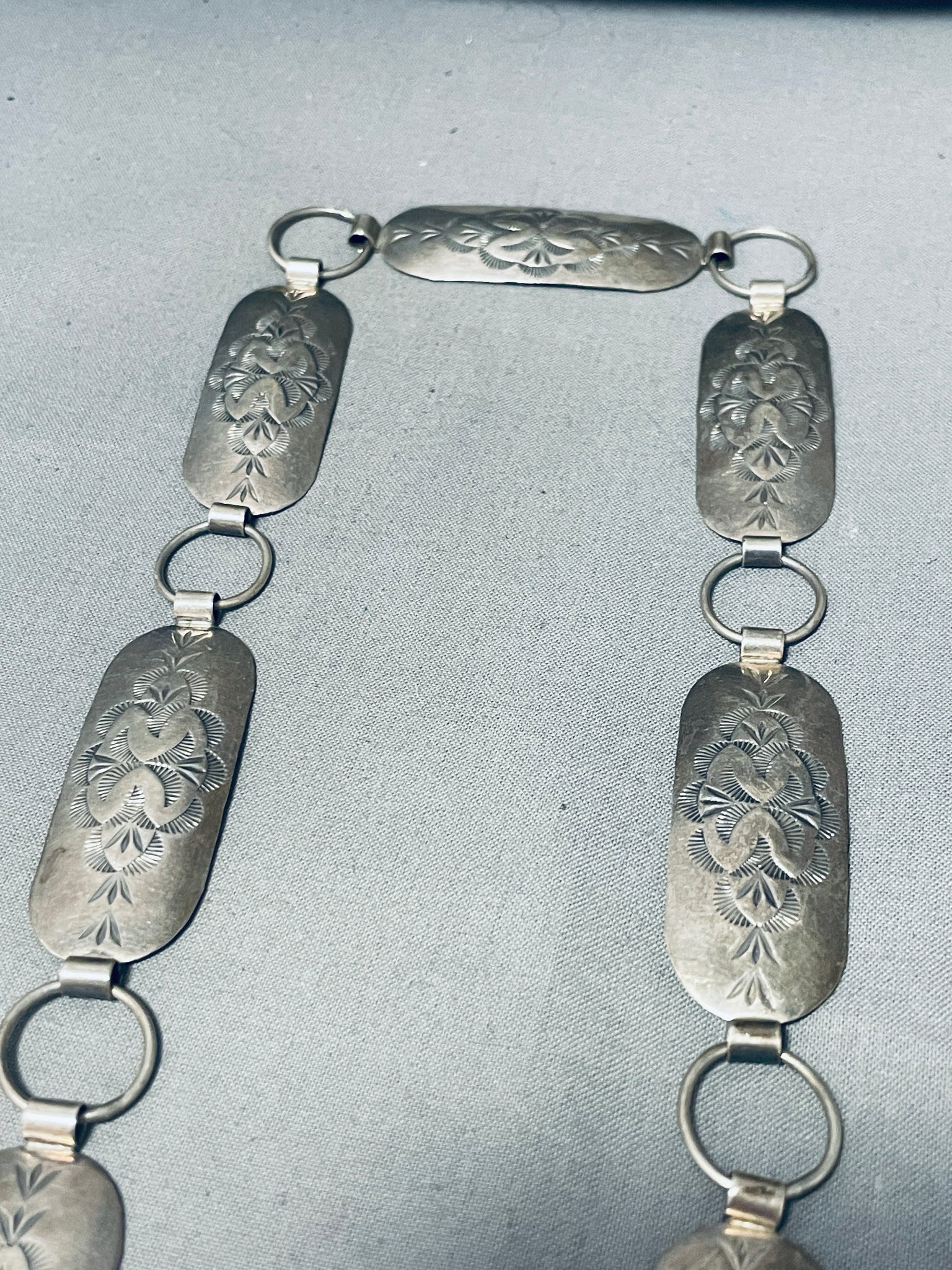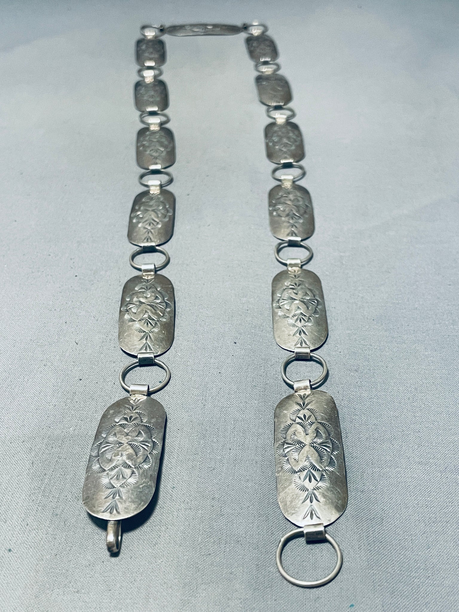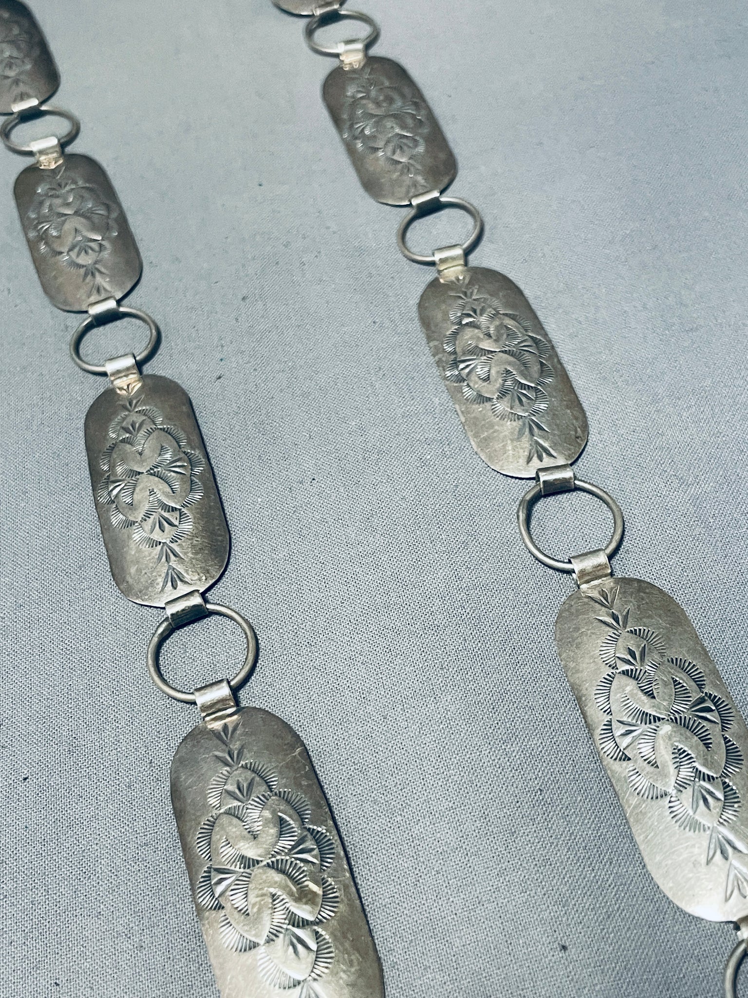 This is an elegant vintage Navajo concho belt! It features silver conchos with hand stamped floral designs, silver links, and a silver clasp! A gorgeous design! The belt will fit a waist up to 36-1/2", and may also be worn as a necklace. Signed by Navajo artist, Spencer. Sterling silver, marked. Sturdy 73 grams.