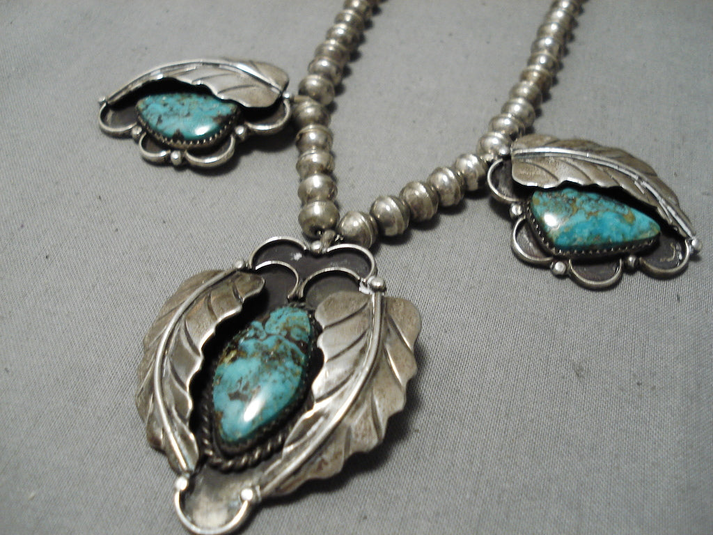 Here we have an exquisite vintage Navajo silver necklace having 3 handcarved silver pendants with intricately handcarved silver leafs silver swirling stems and silver beads surrounding Royston turquoise ovals! The necklace has a single strand of handcarved silver round beads and a handmade silver hook and eye clasp! Simply Stunning! The largest pendant measures about 1-7/8" x 1-3/4", and the smaller pendants measure around 1-1/2" x 1-1/8". Royston turquoise ovals measure about 1" x 1/2". Silver beads measure about /4" x 1/4". Sterling silver. The length of the necklace measures around 18". Sturdy 63 grams.