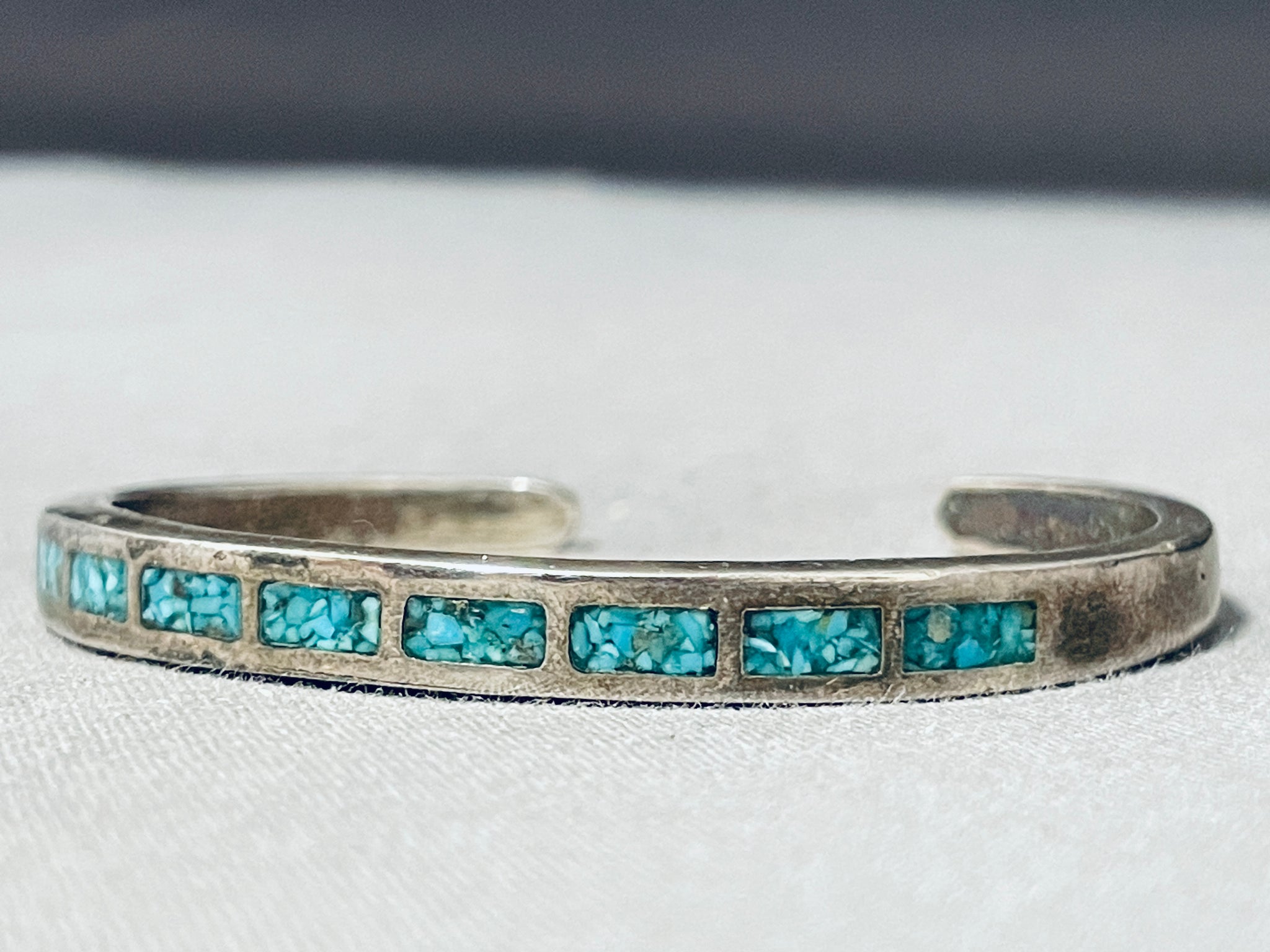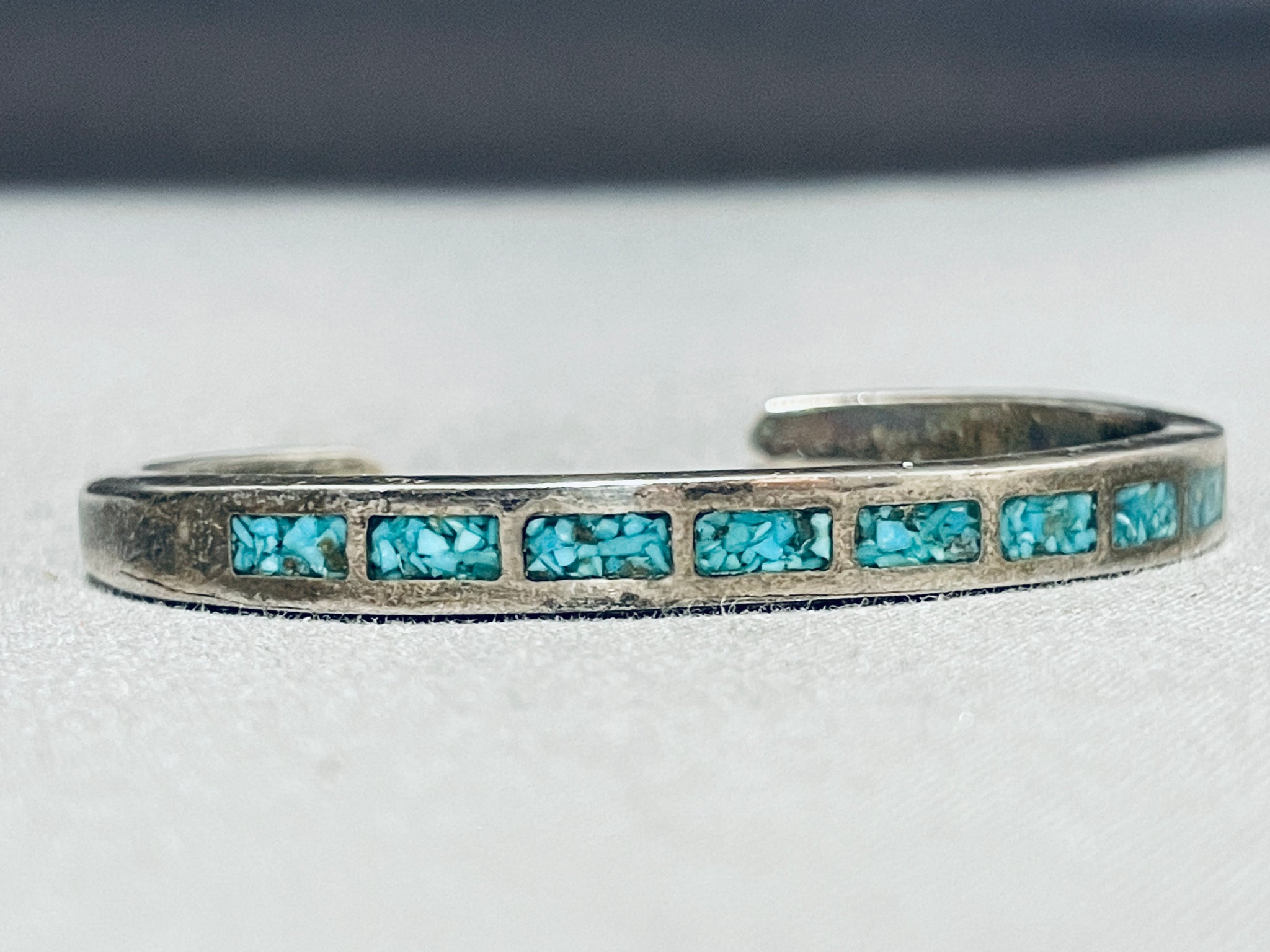 Exquisite Vintage Native American Navajo Turquoise Chip Inlay Sterling Silver Bracelet
