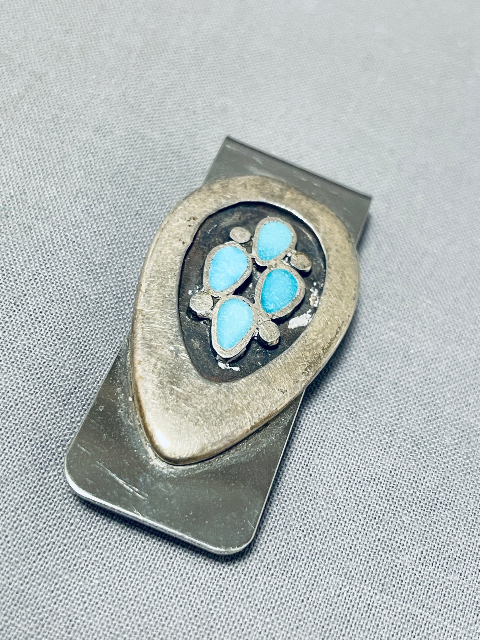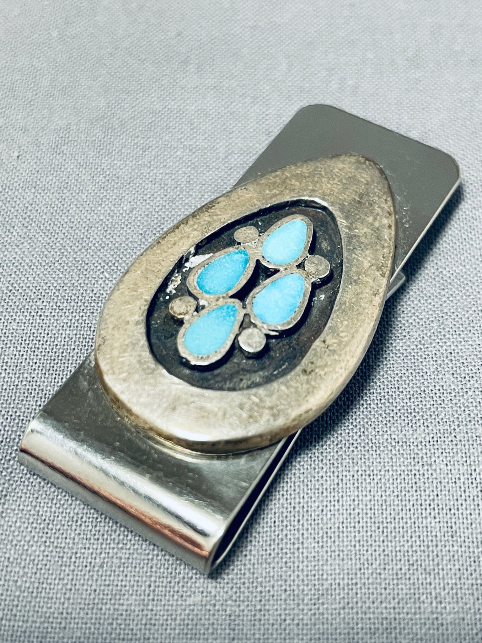 Exquisite Vintage Native American Navajo Turquoise Inlay Sterling Silver Money Clip