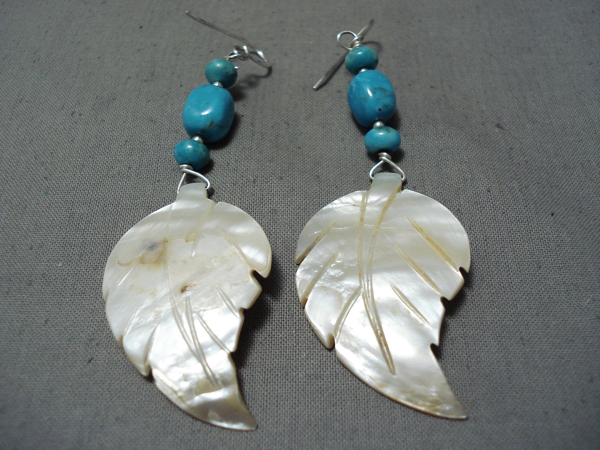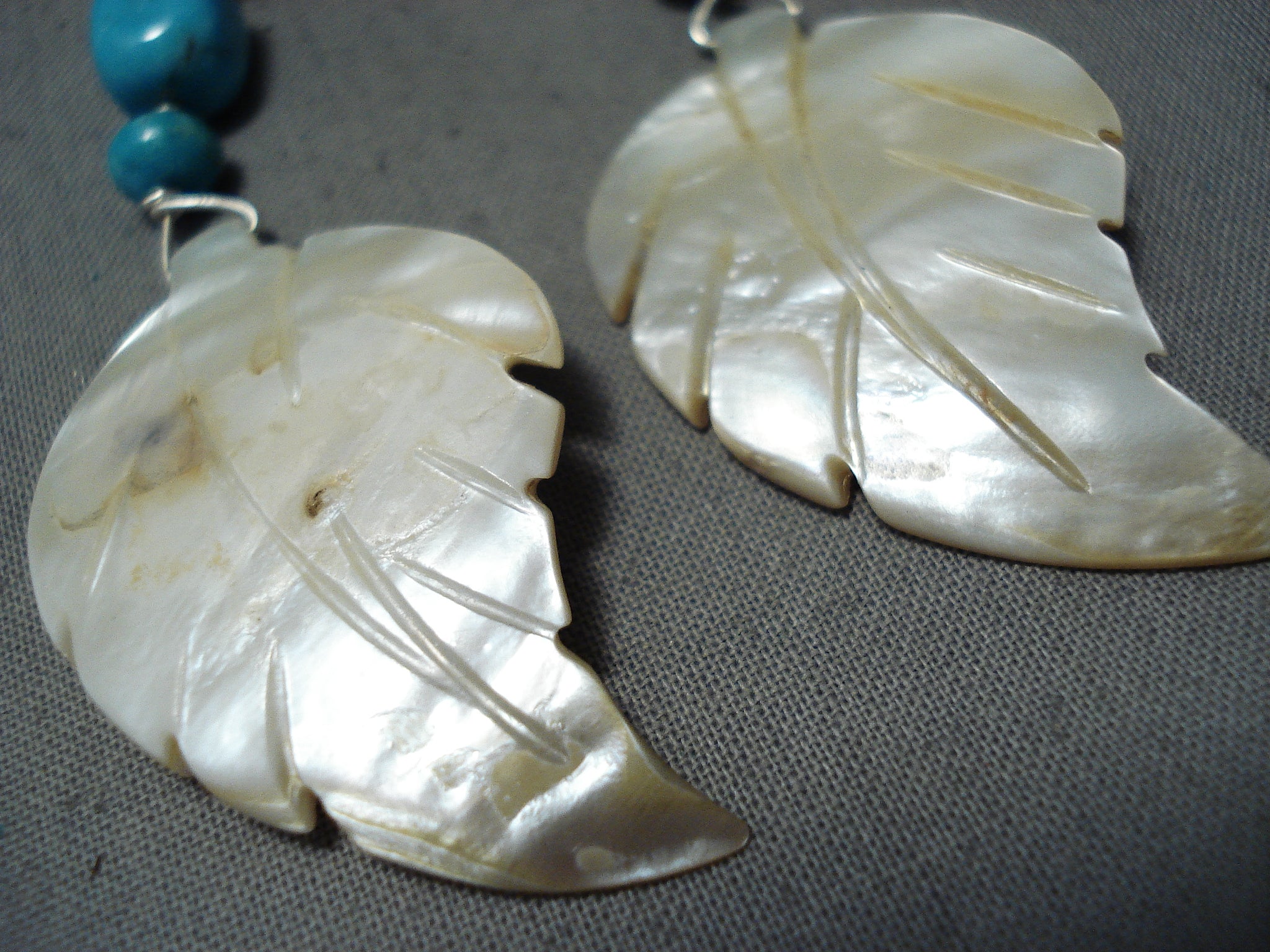We are proud to offer this marvelous pair of vintage Navajo earrings having turquoise stones, handcarved mother of pearl leaf pendants and handmade silver hooks for pierced ears! Simply Stunning! The earrings measure about 3-1/2" top to bottom. The largest turquoise stone measures around 3/8" x 1/4". Cir Mid Century. Sterling silver. The earrings weigh around 11 grams.