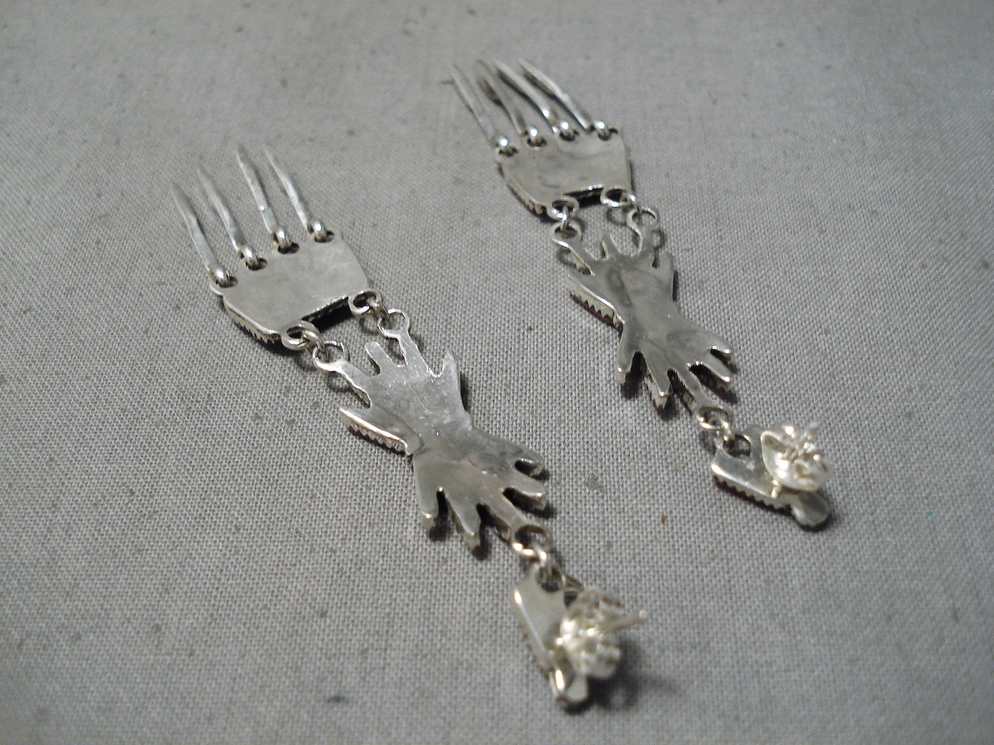 Here we have an incredible pair of Zuni silver earrings having a coral needlepoint cluster, silver links and silver pendants! The earrings have silver posts for pierced ears! Simply Stunning! The earrings measure about 3" top to bottom. Sterling silver. Signed by Zuni artist, J. Lastiano. The earrings weigh around 7 grams.