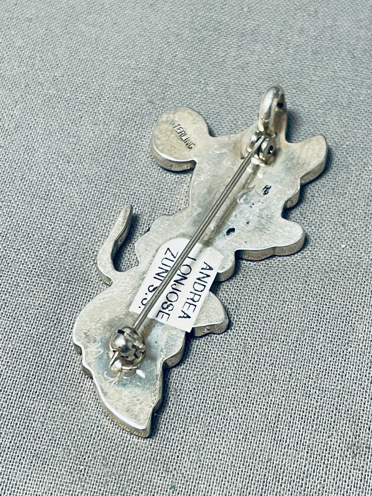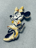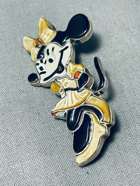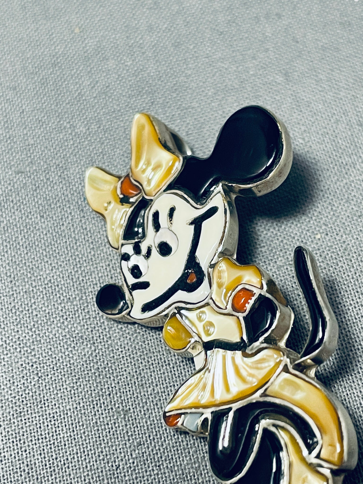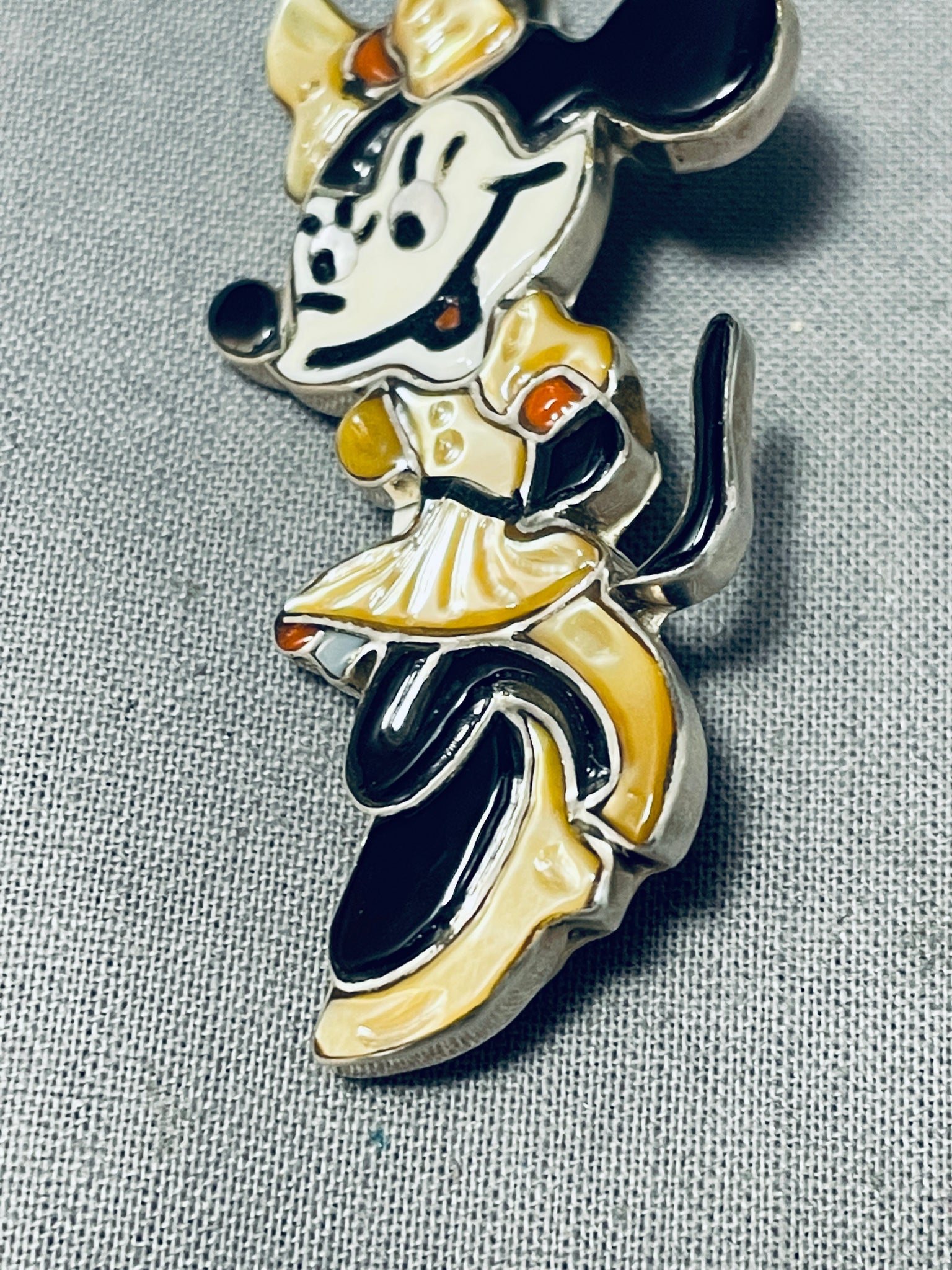 Extreme Detail Native American Zuni Minnie Mouse Coral Sterling Silver Pin