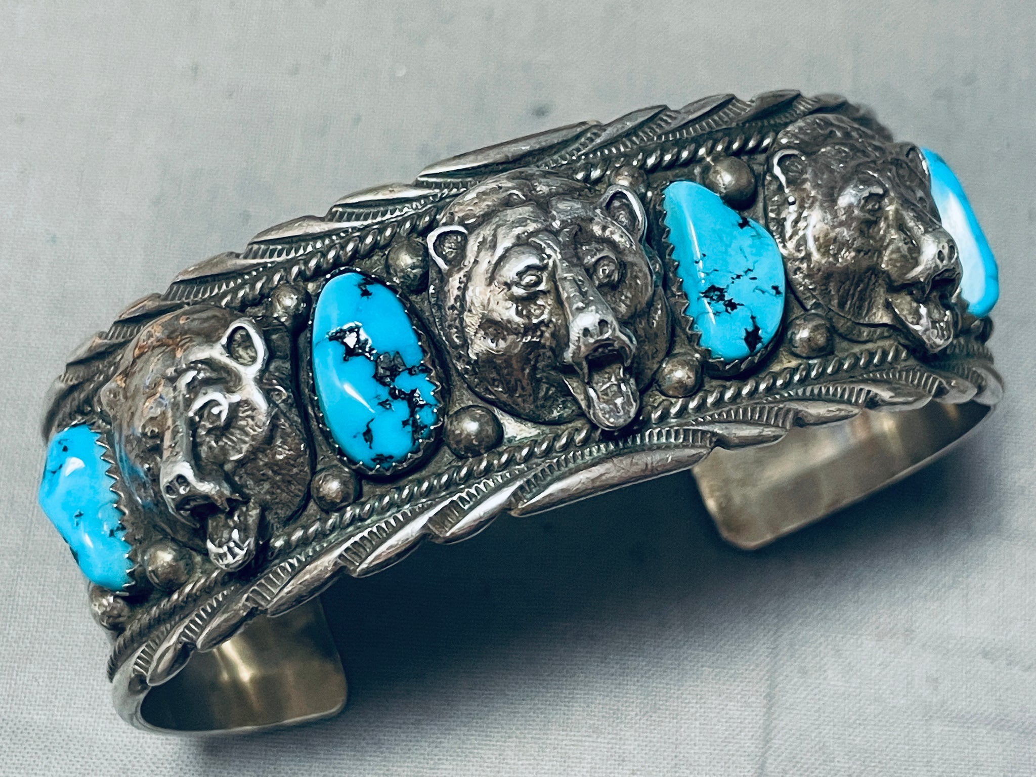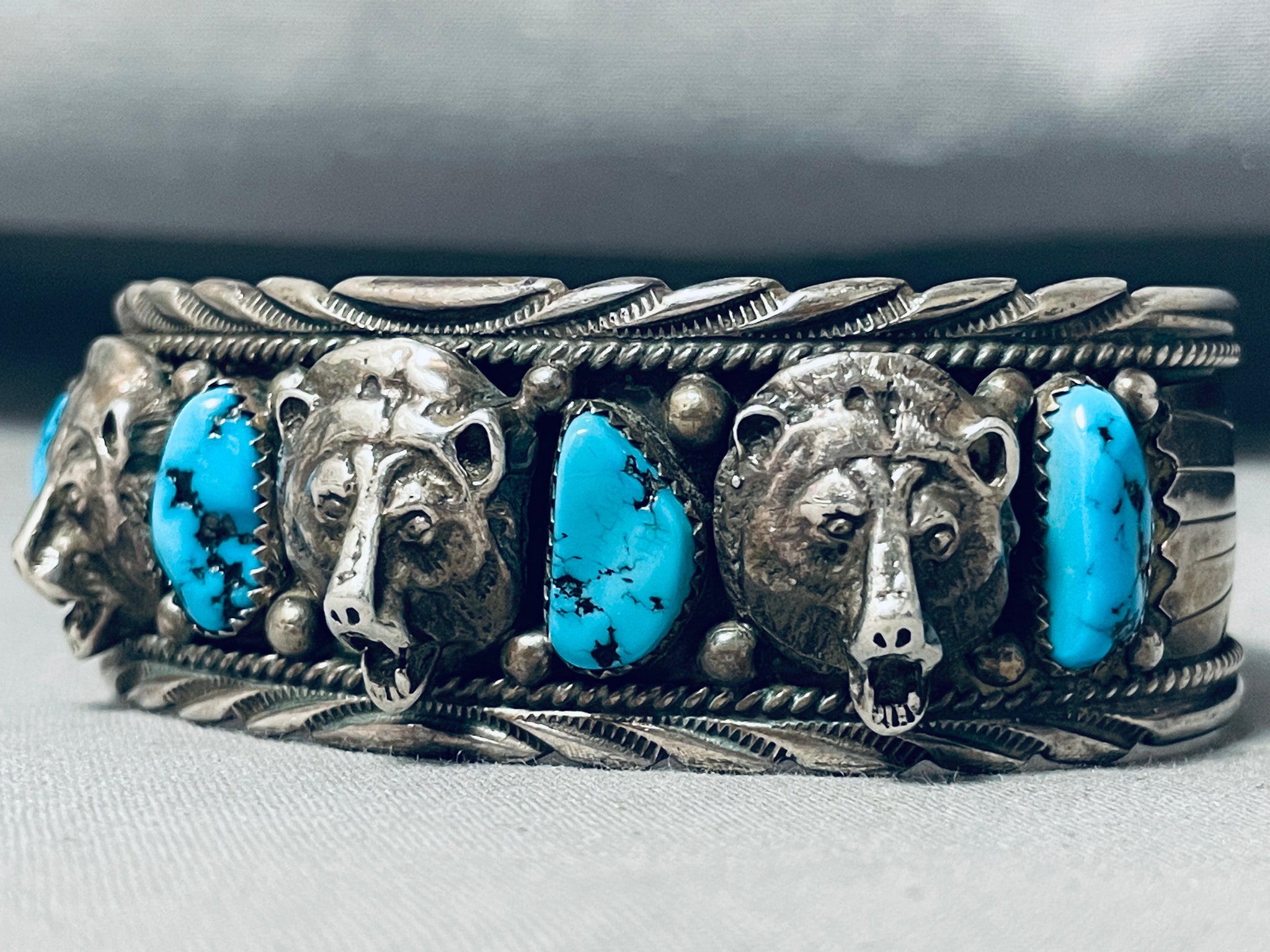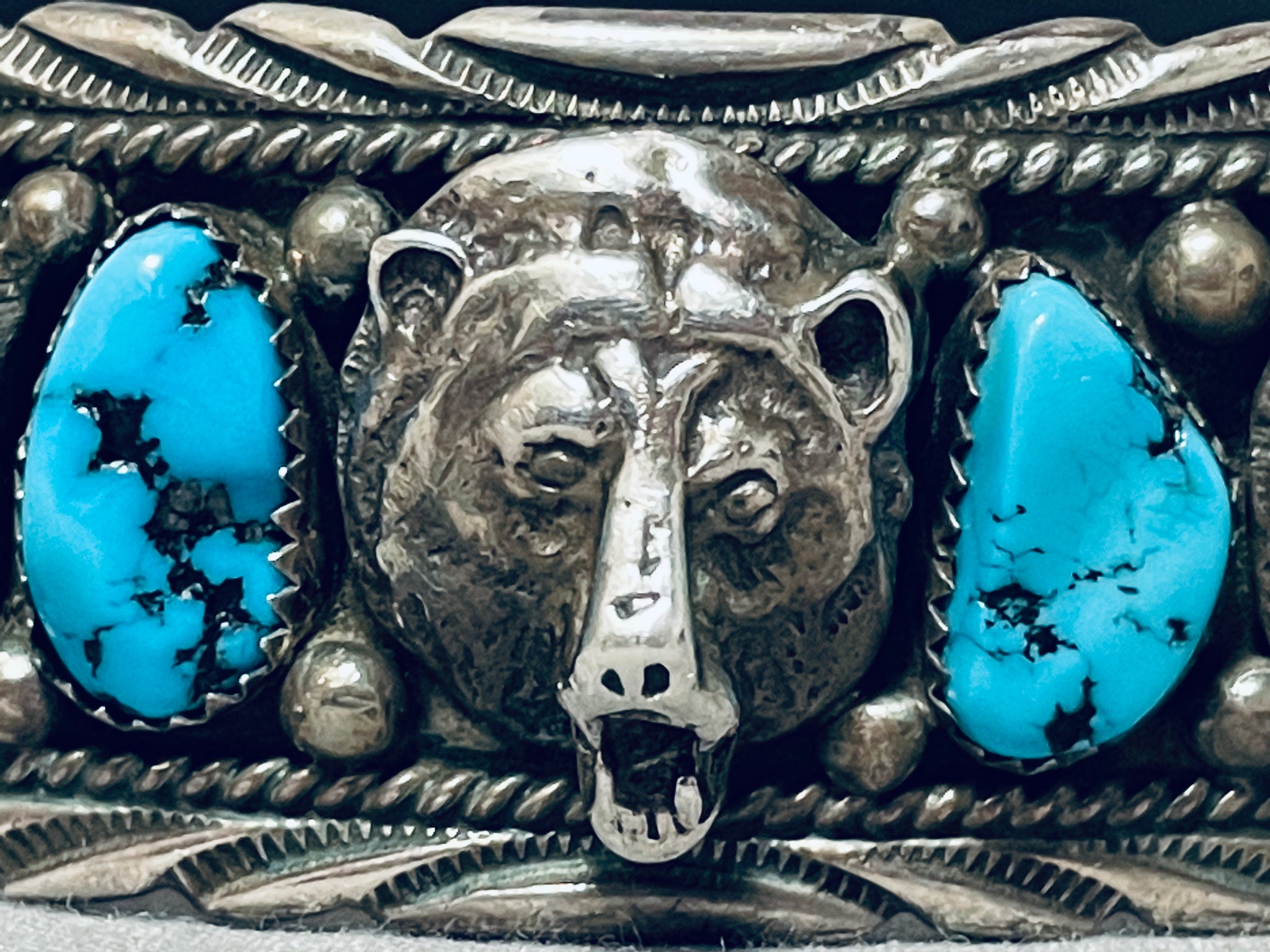Extremely Detailed Vintage Native American Navajo Turquoise Bear Animal Sterling Silver Bracelet