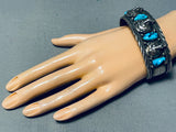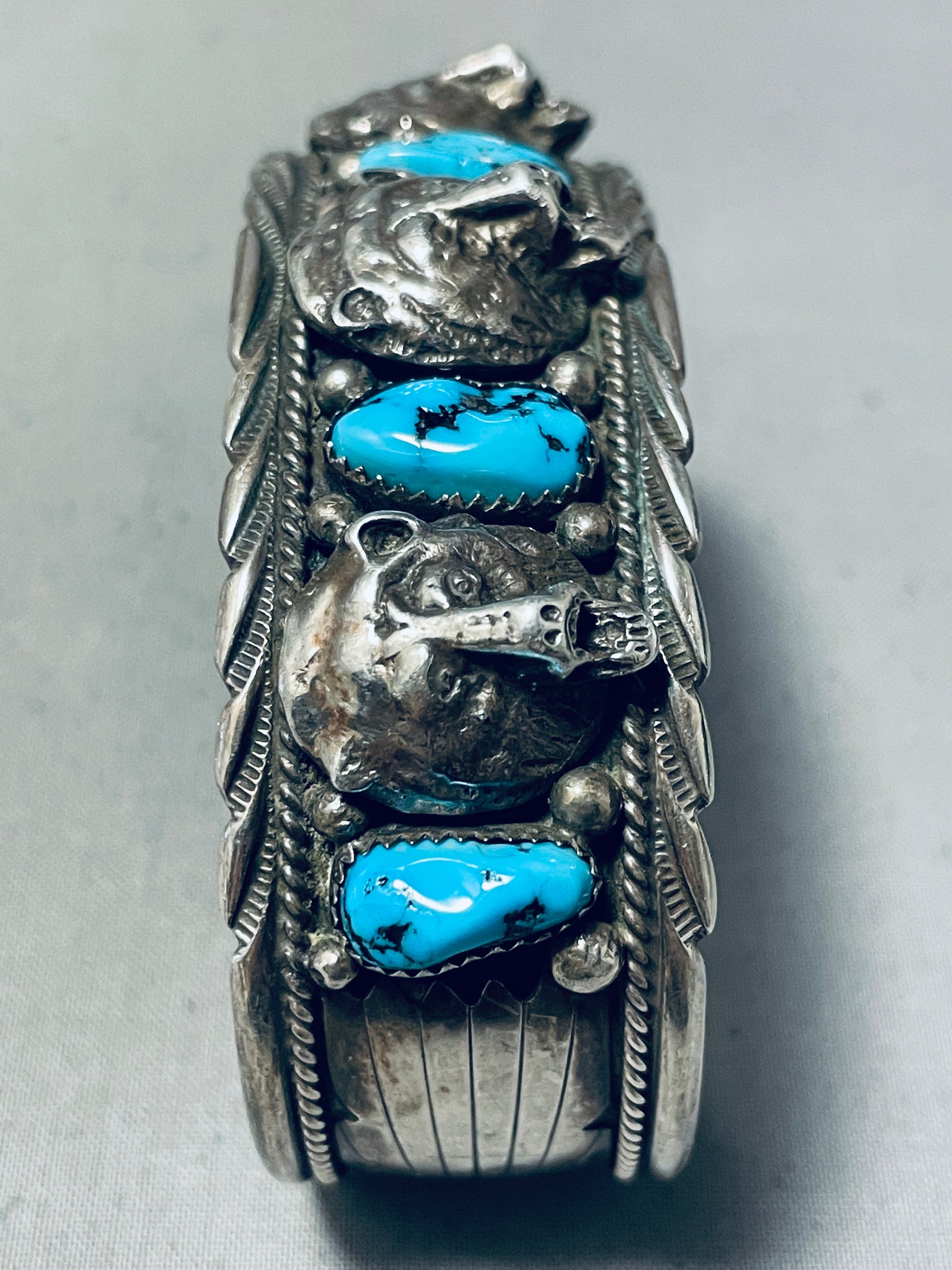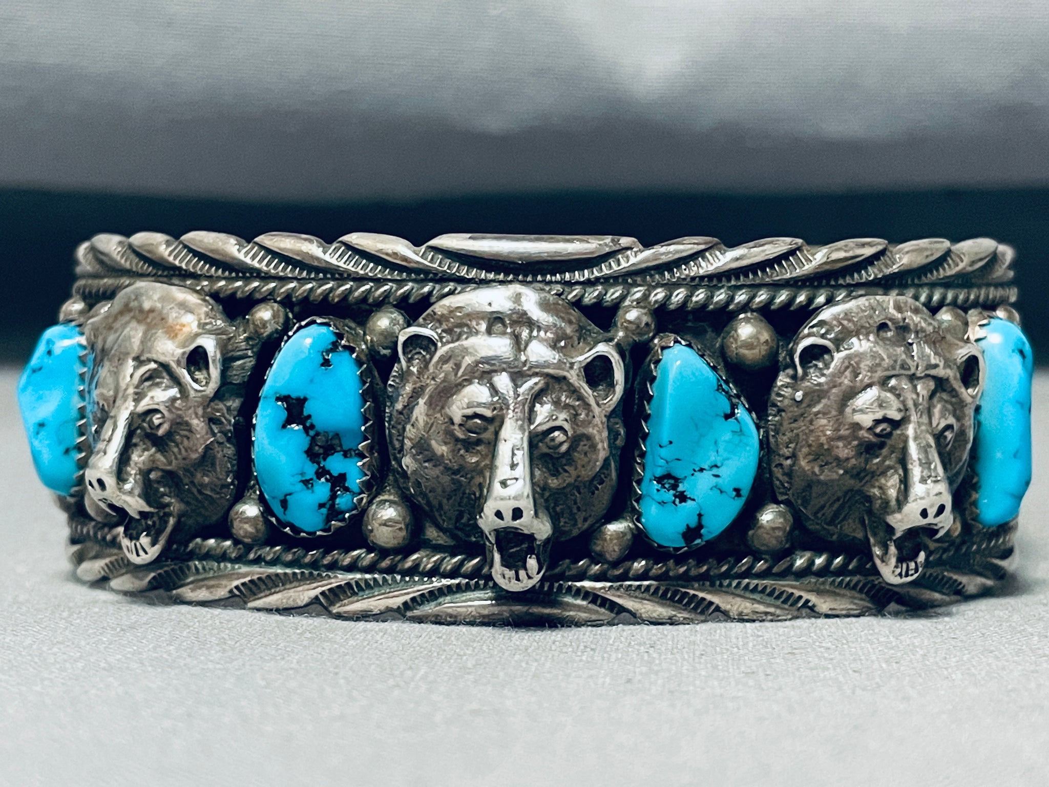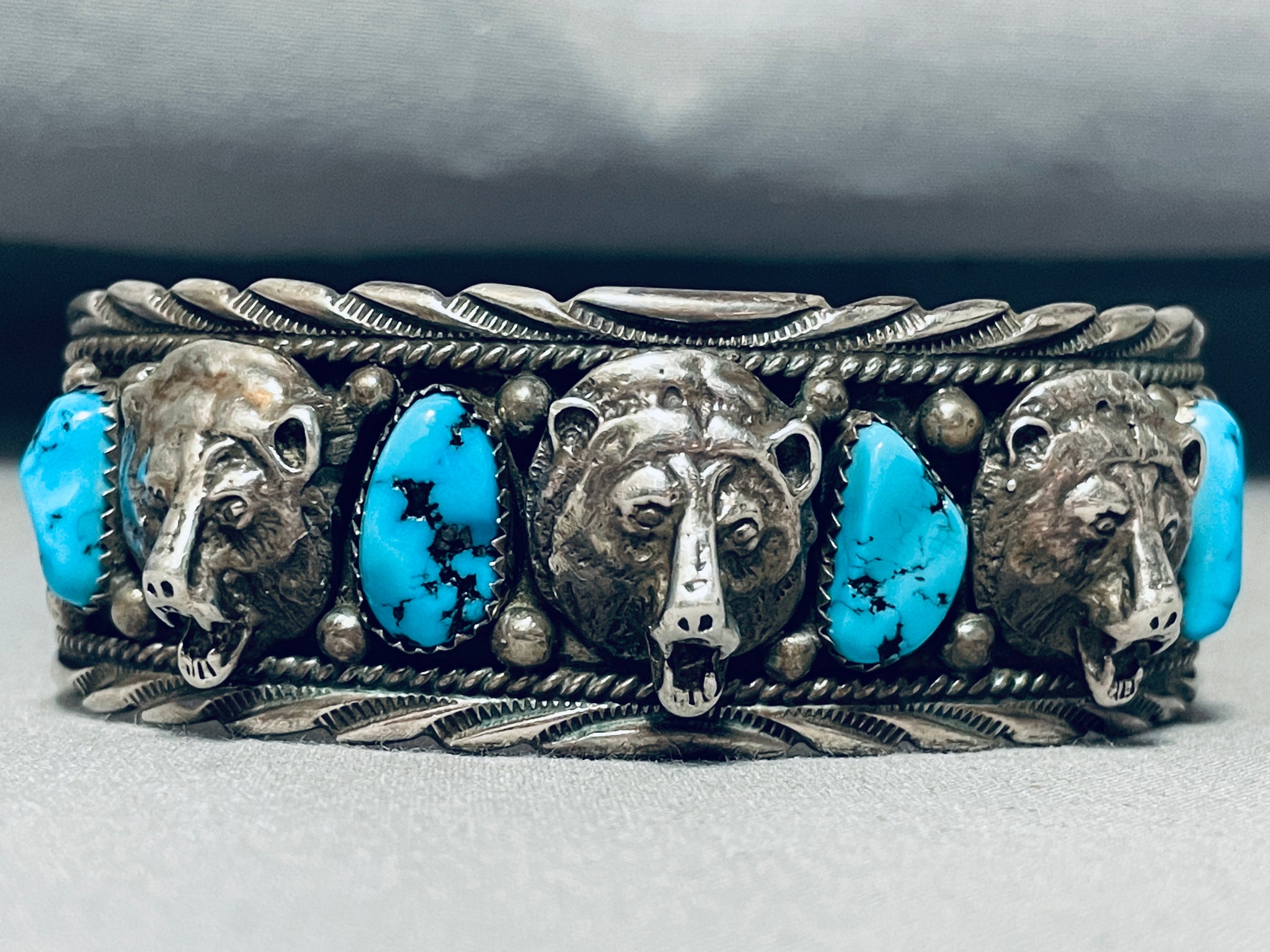Extremely Detailed Vintage Native American Navajo Turquoise Bear Animal Sterling Silver Bracelet