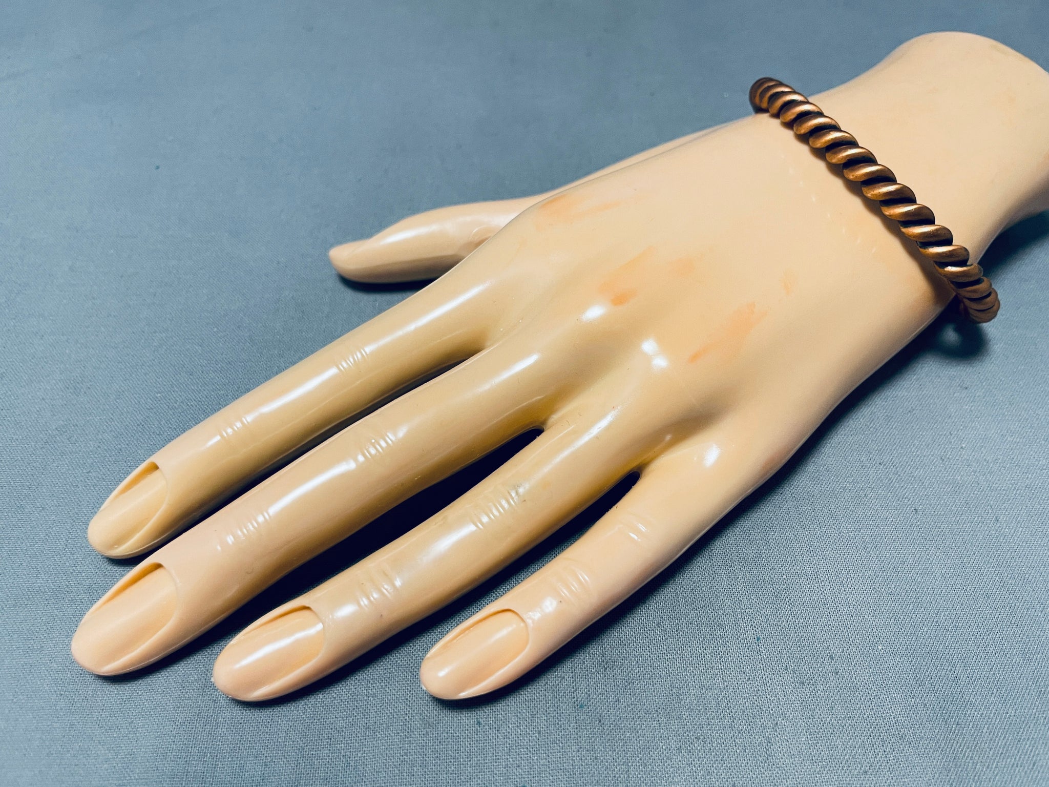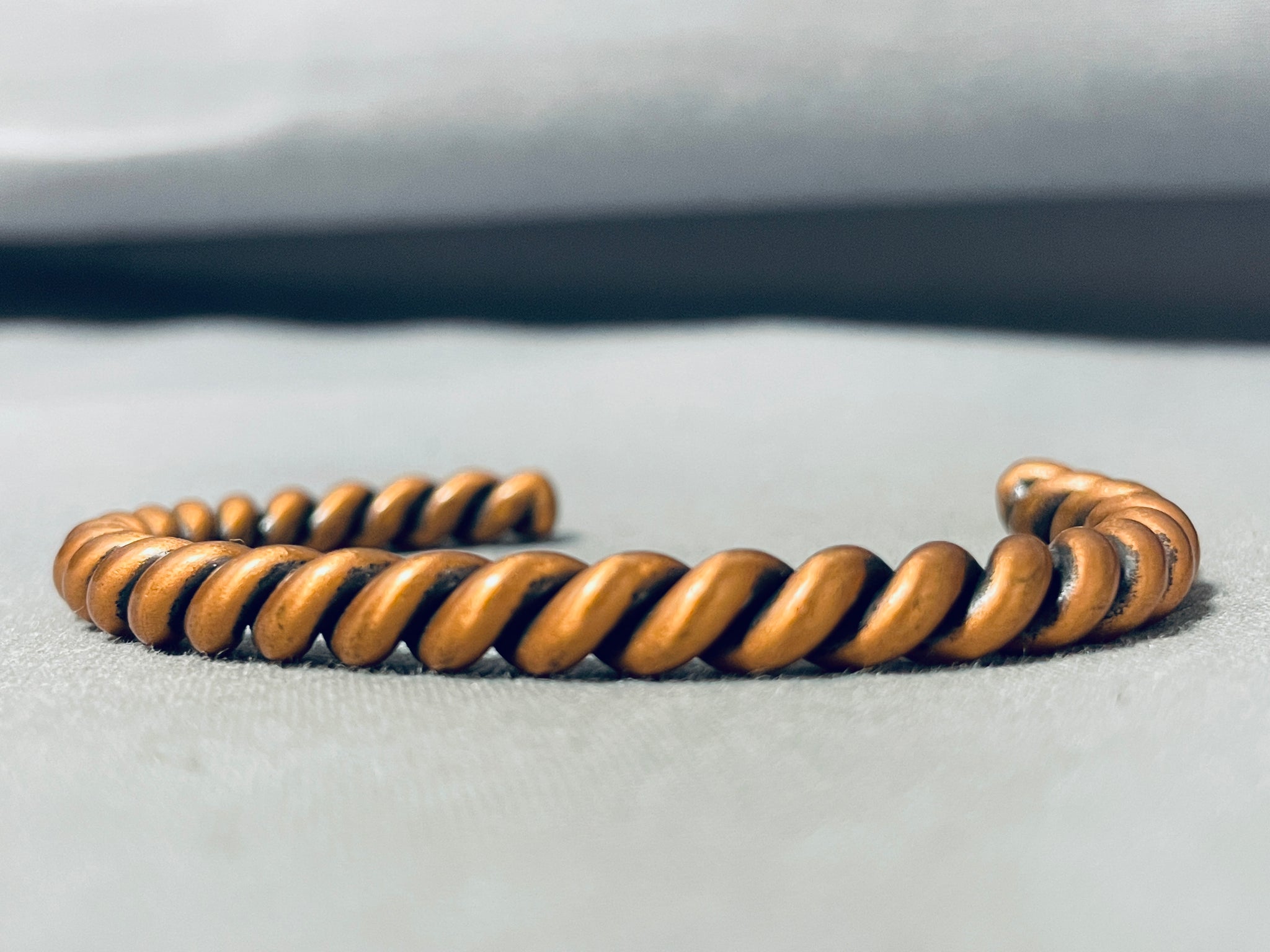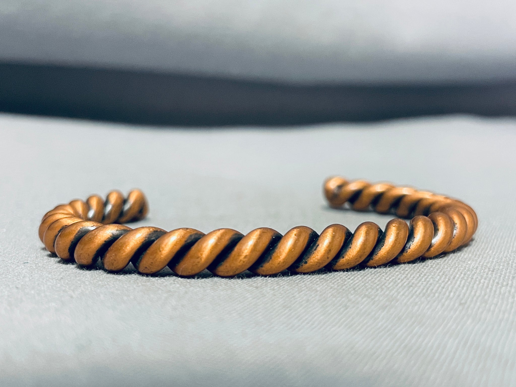 This is an exquisite vintage Navajo bracelet! It features a solid copper cuff made up of hand carved copper rope! A noteworthy design! The width of the bracelet measures around 1/4". Copper. The inside end to end measures around 5-1/8" with an additional 1-1/2" gap. Sturdy 27 grams.