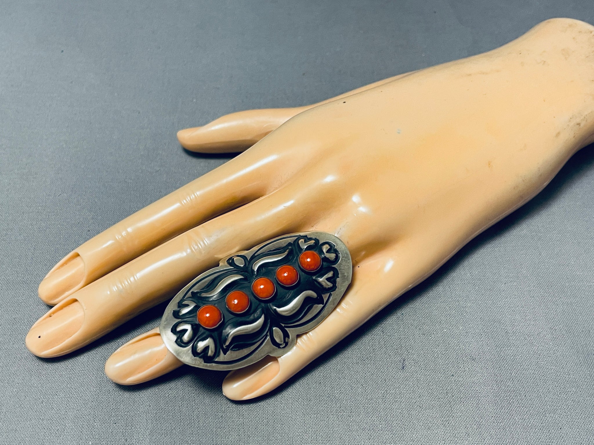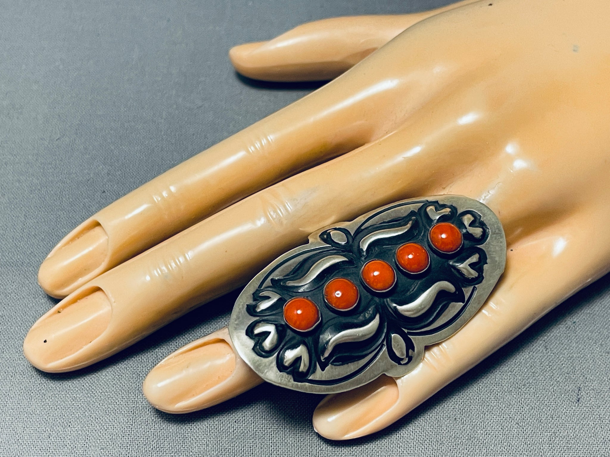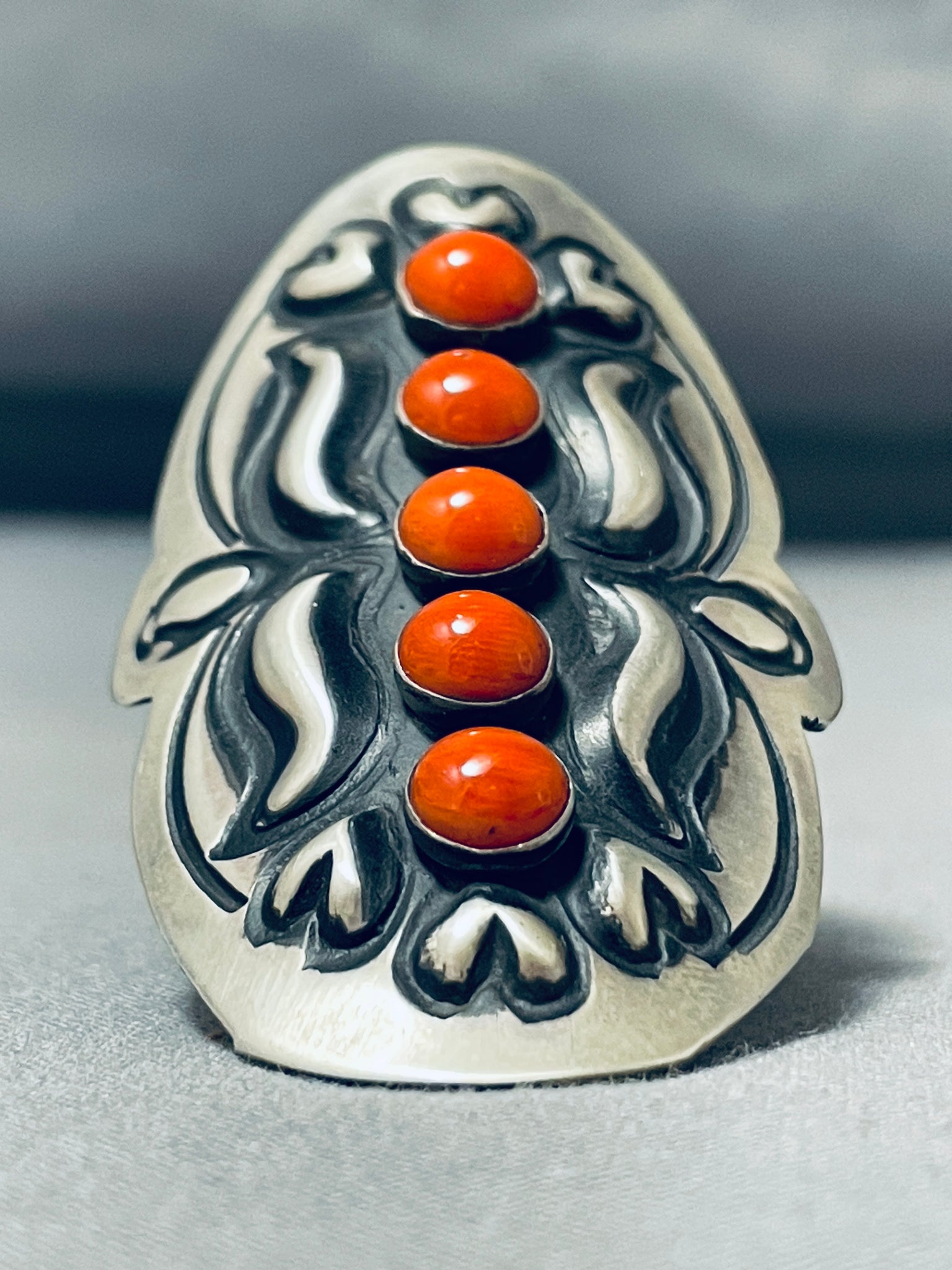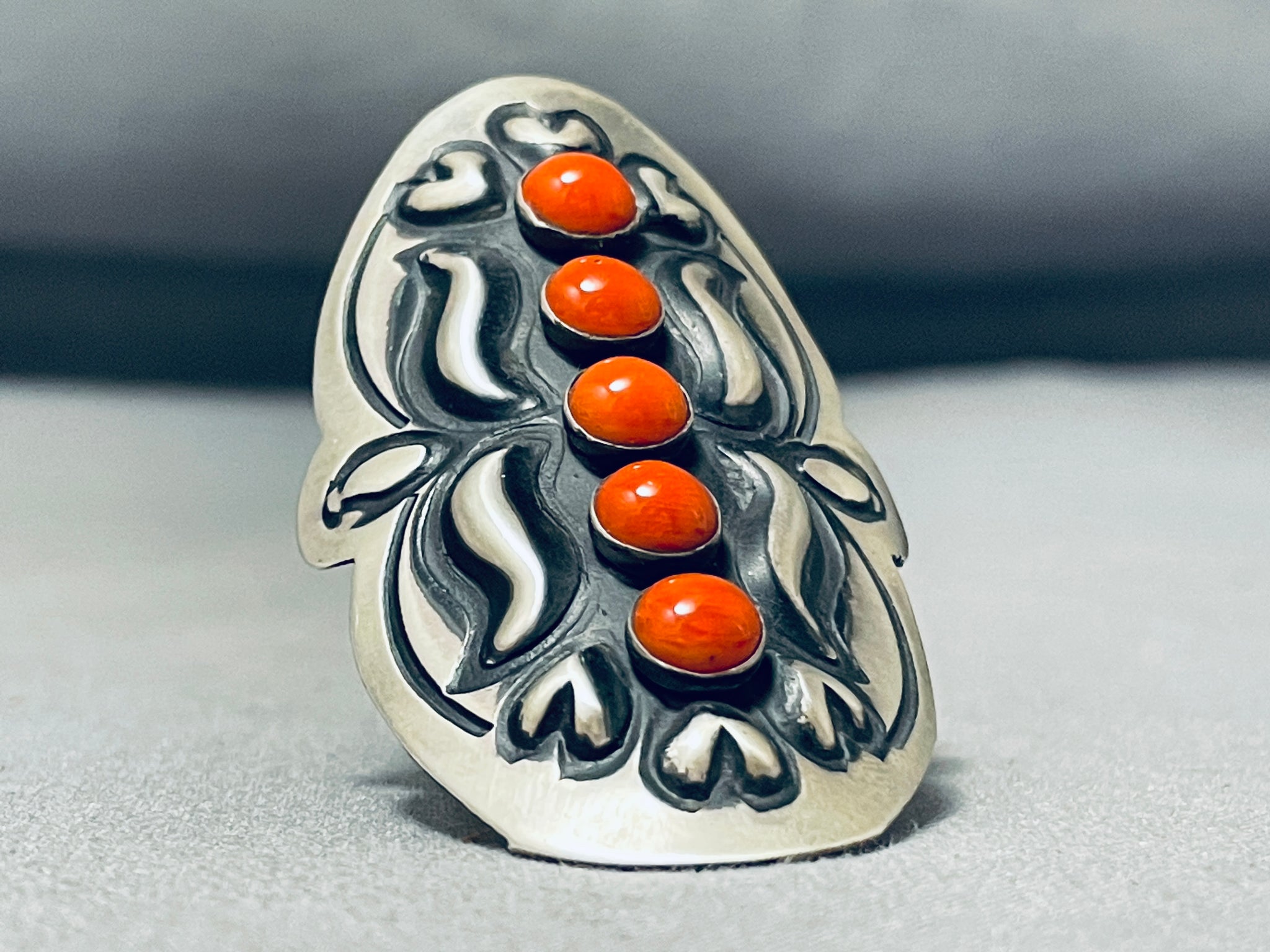 Up for sale is this superior Navajo silver ring having a vertical row of 5 coral ovals centered among swirling silver handcarvings and a handcarved solid silver adjustable band! Truly Remarkable! The stones measure around 1/4" x 1/4". The ring face measures around 2-1/4" x 1-1/2". The ring size is around 10. Sterling silver, marked. Sturdy 20 grams.