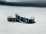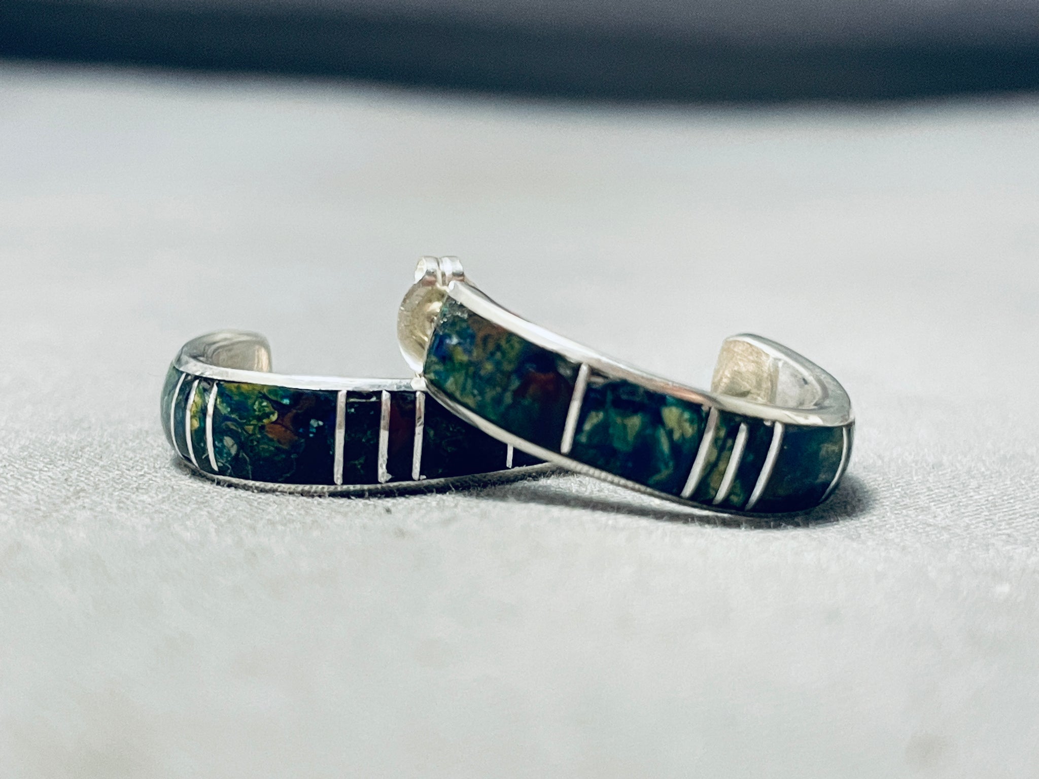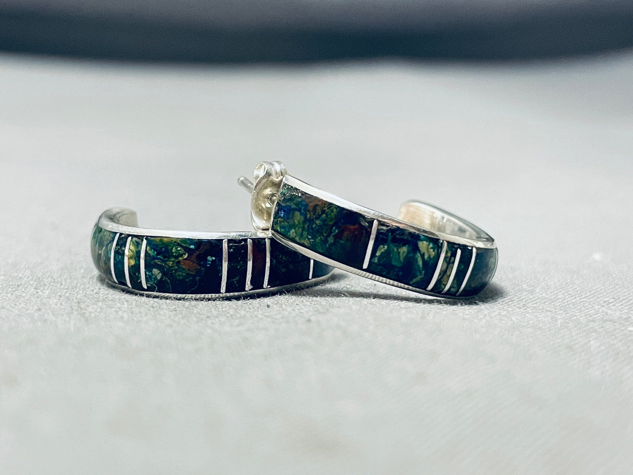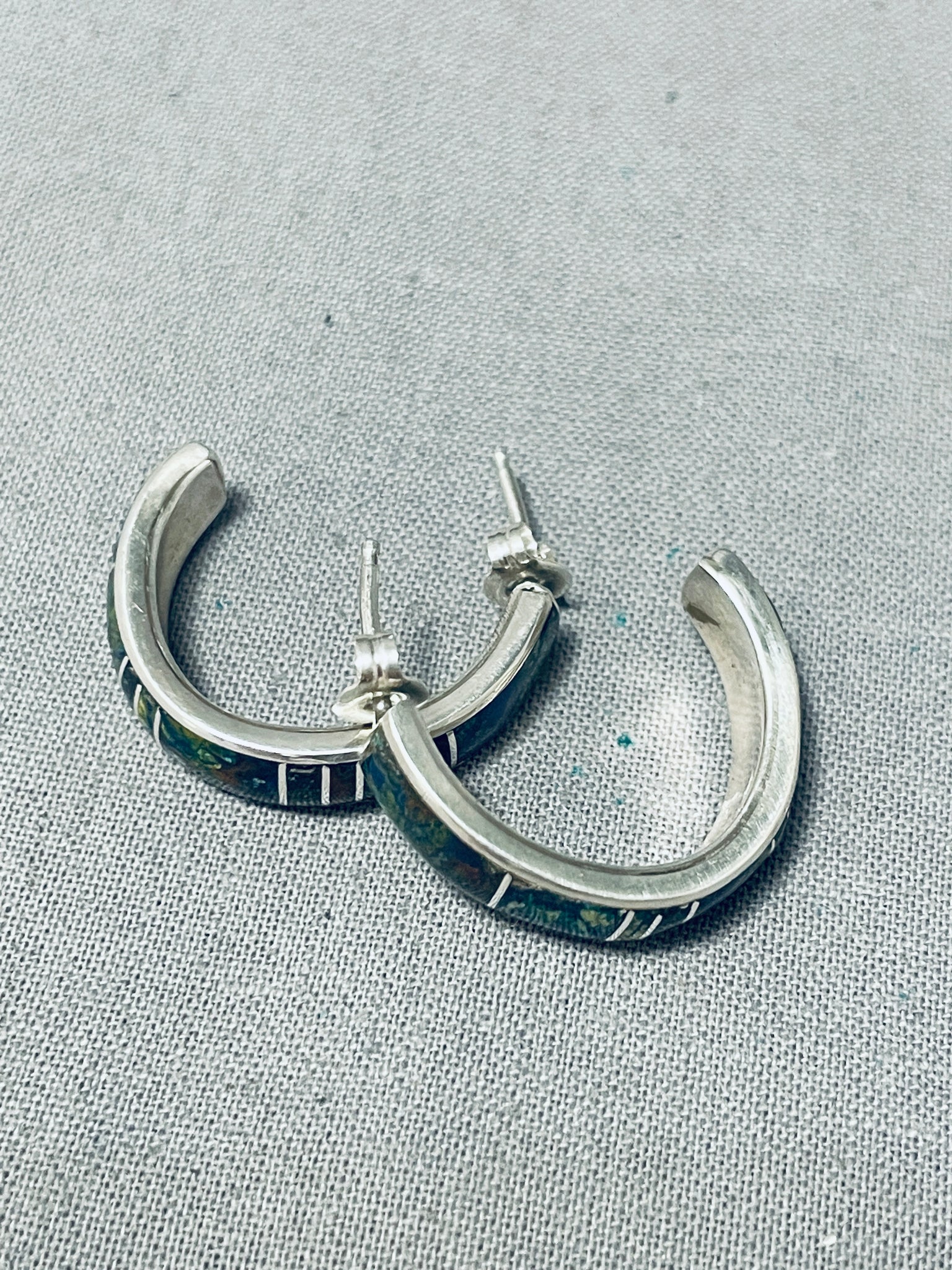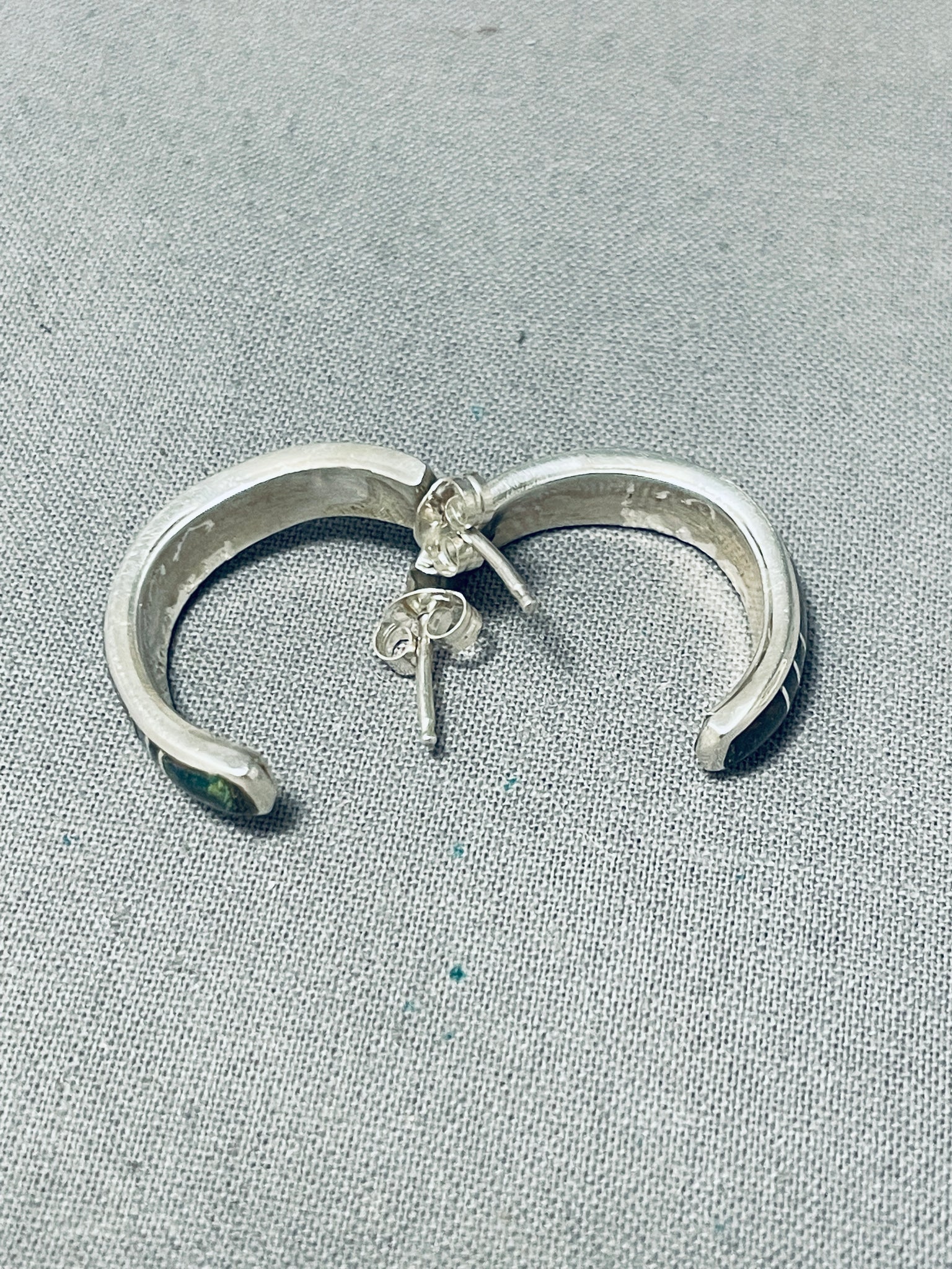Fabulous Native American Navajo Inlay Turquoise Sterling Silver Hoop Earrings