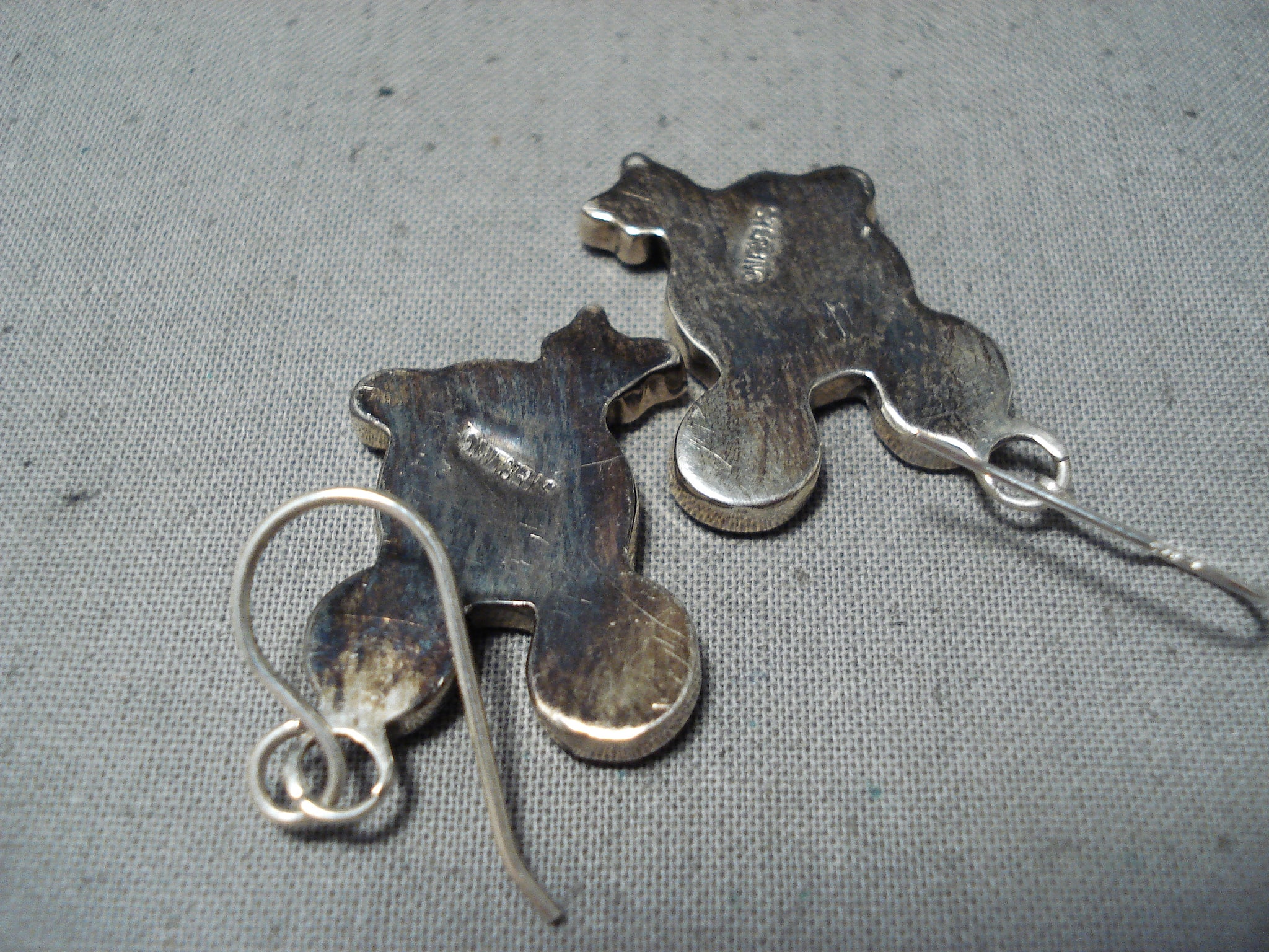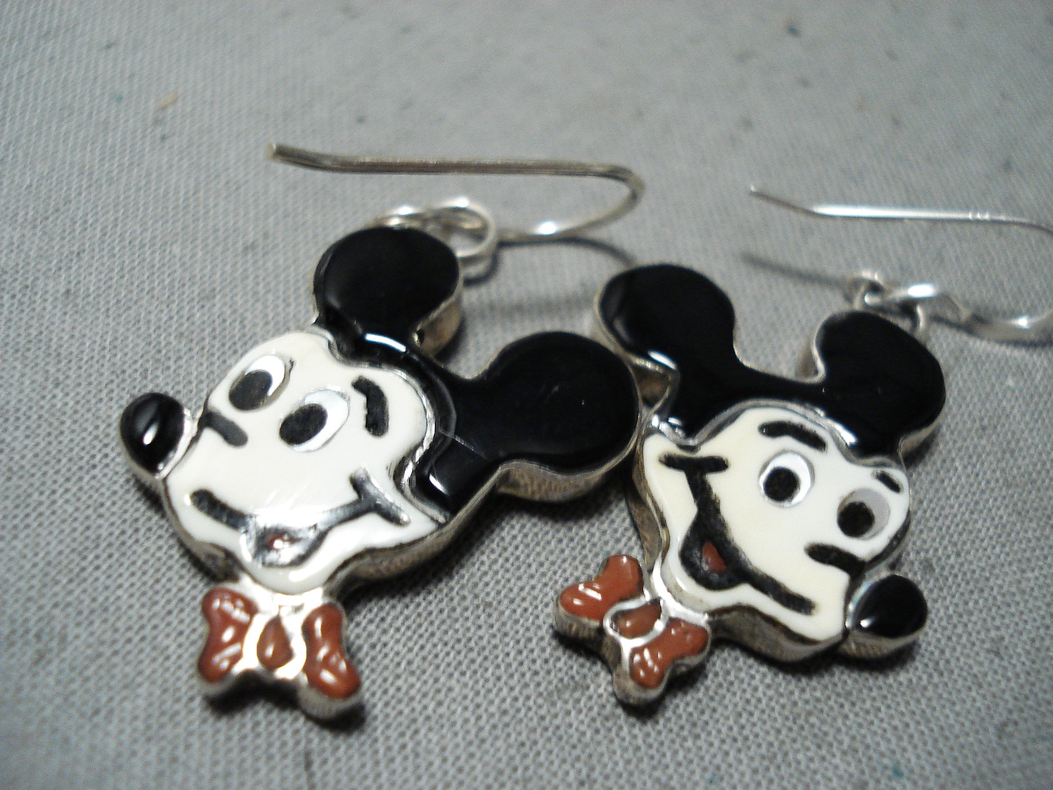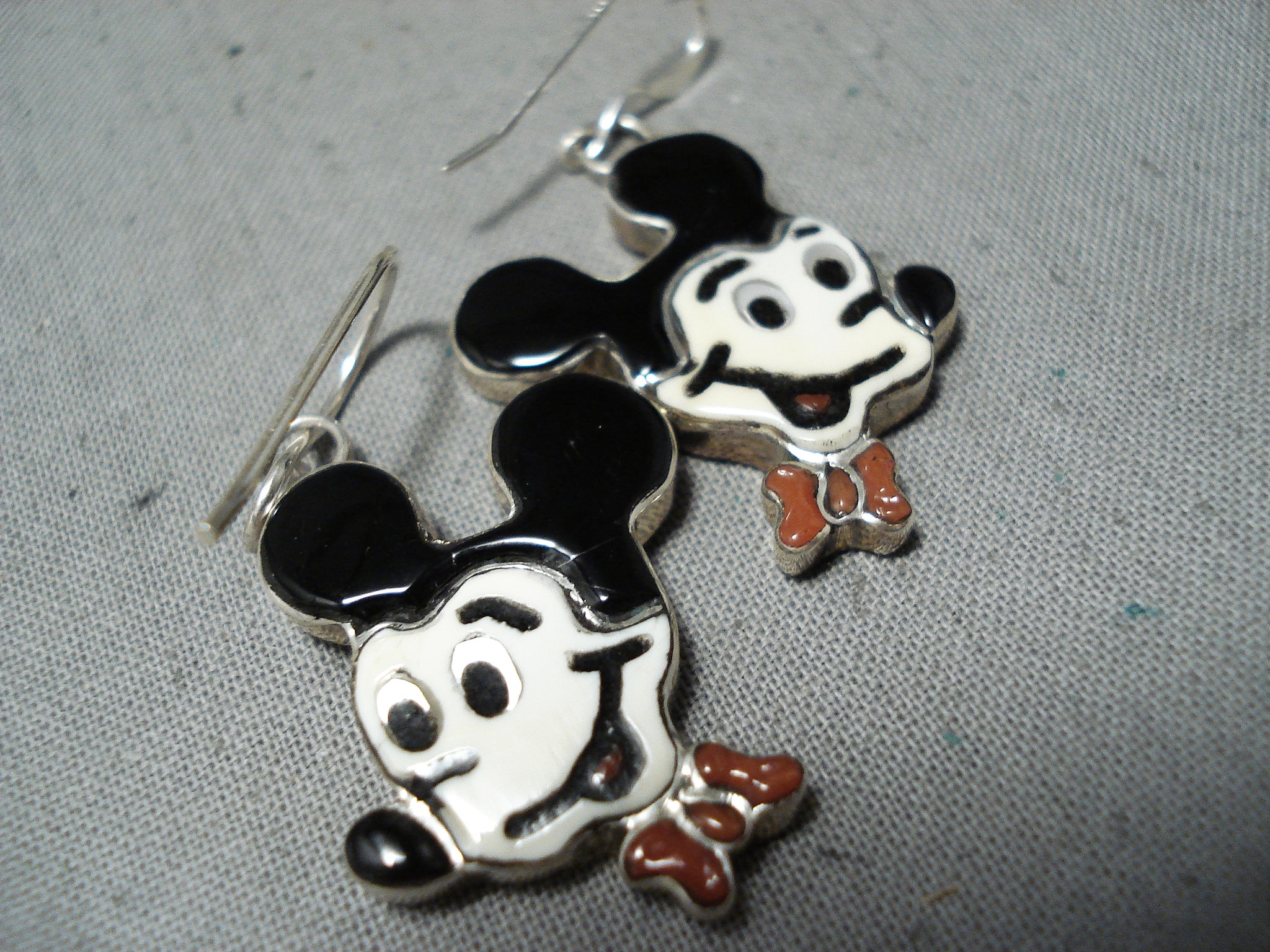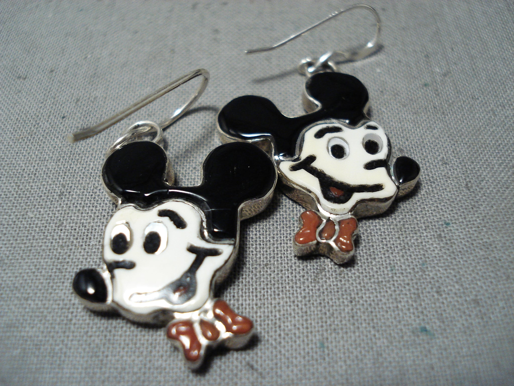 Fabulous Native American Zuni Inlay Coral Jet Sterling Silver Mickey Mouse Earrings