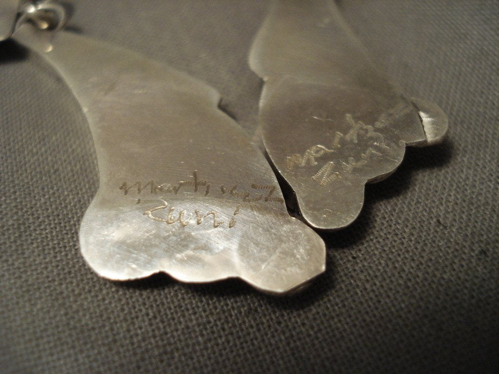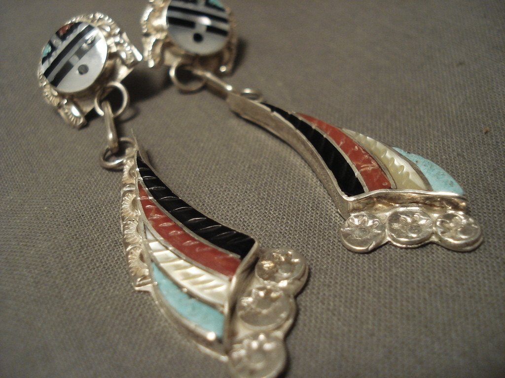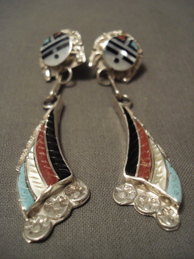 This is a superlative vintage Zuni Native American jewelry silver pair of earrings handmade by the famous artist Eldred Martinez. What makes Eldreds pieces so unique is that she beautifully hand carves into the stones to give her pieces more texture and intricacy. These earrings are amazing as they contain wonderful inlaid sun faces. The inlay on these earrings contain mother of pearl, turquoise, coral, onyx and shell. Surrounding each earring are incredible flattened silver shells and sun patterns. Each earring measures around 2-3/4" X 1/2". The earrings weigh around 10 grams. LAYAWAYS- We are happy to work with you and are more flexible than anyone on the net. Simply send us an email for more information.