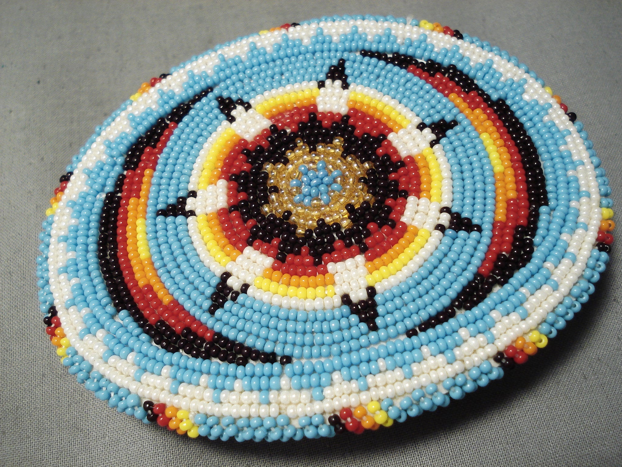 Up for sale is this striking vintage Navajo buckle having a large colorful oval of small beads with a large center starburst design! Very Unique! The buckle measures around 4-1/4" x 3-1/4". Sturdy 101 grams.