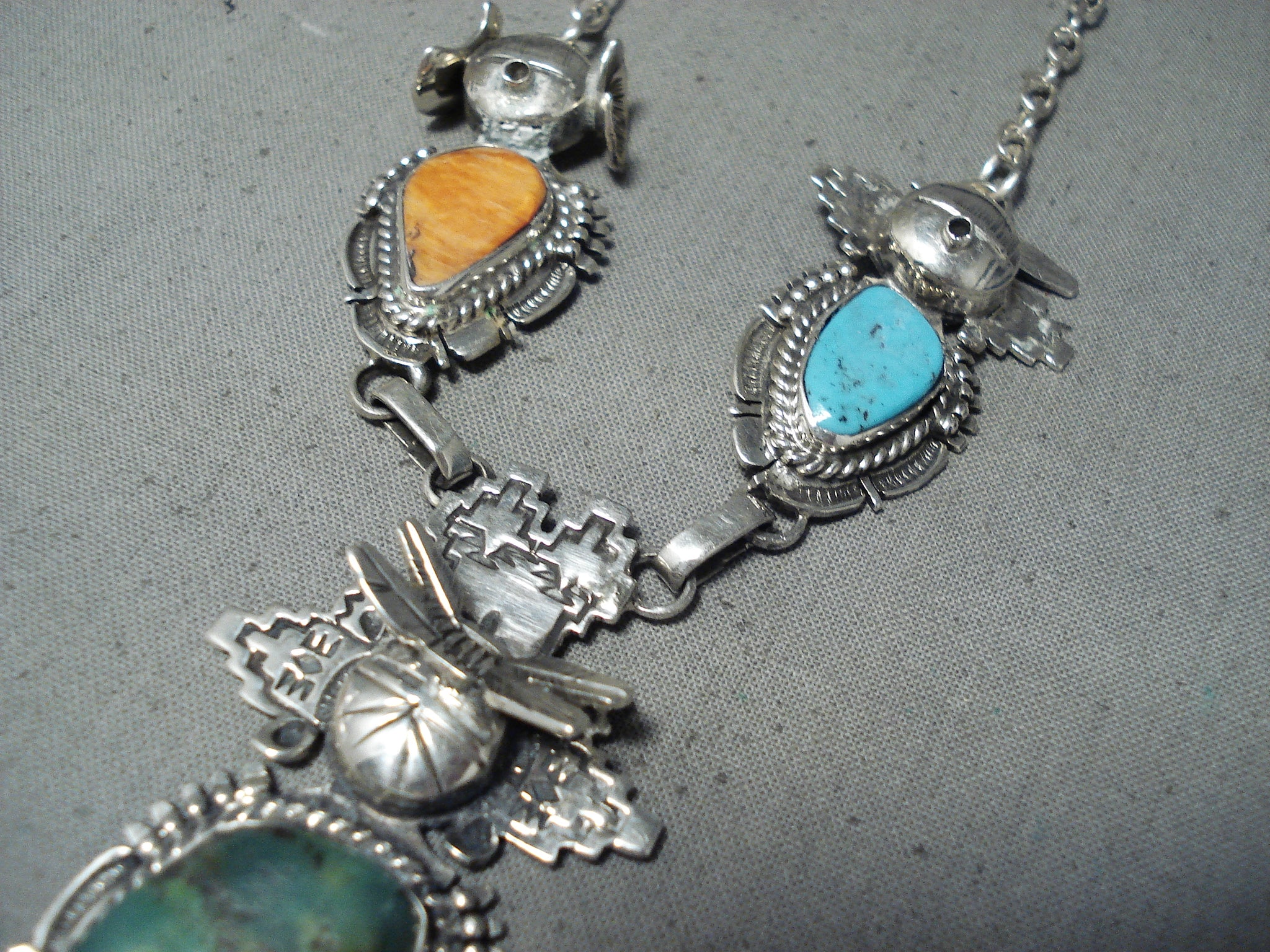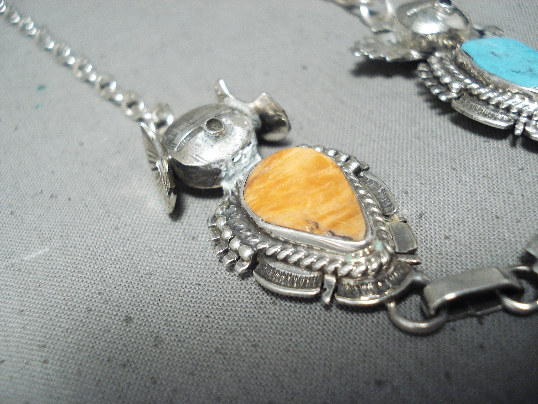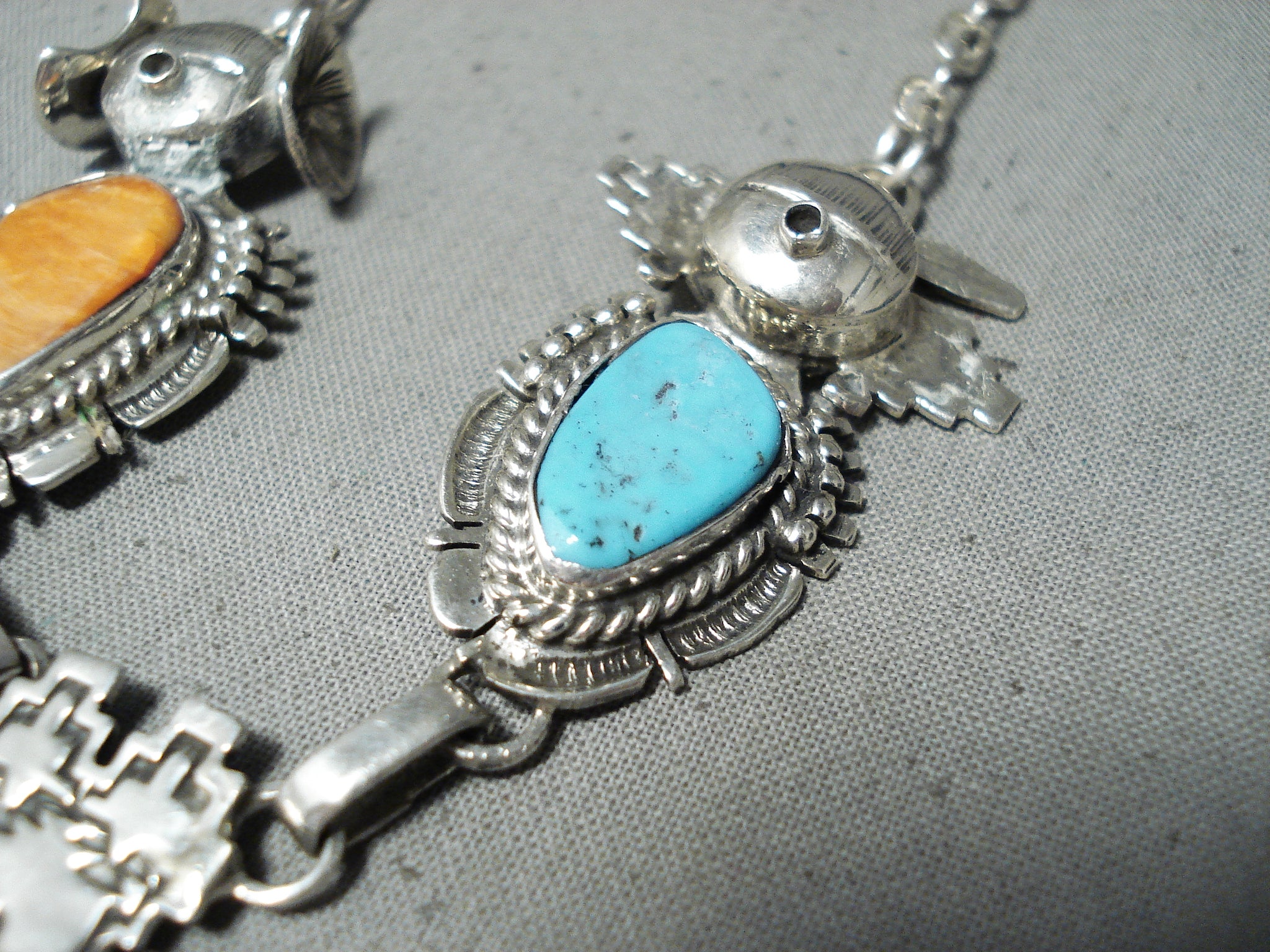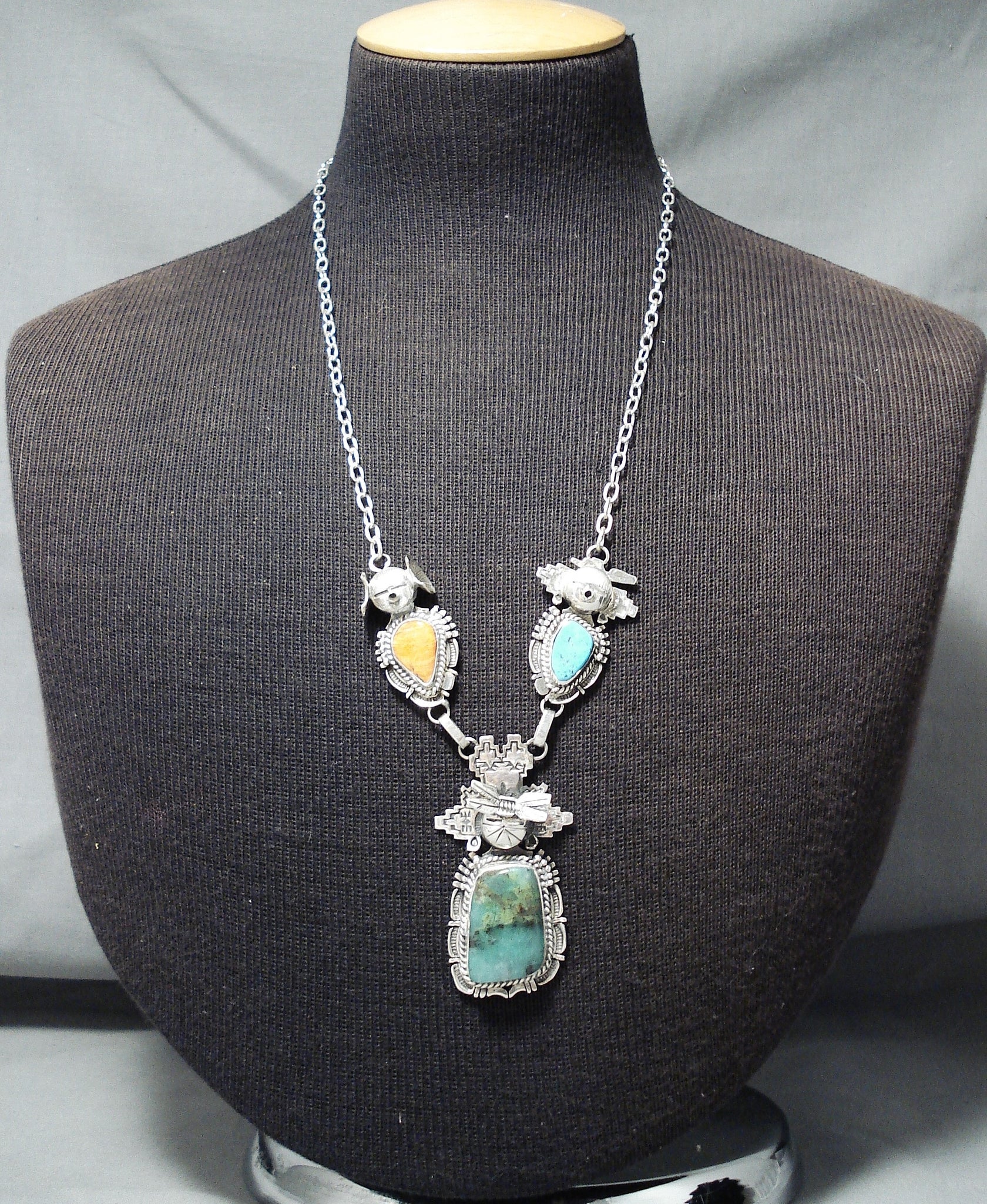 Fascinating Native American Navajo Turquoise Spiny Shell Sterling Silver 3 Kachinas Necklace