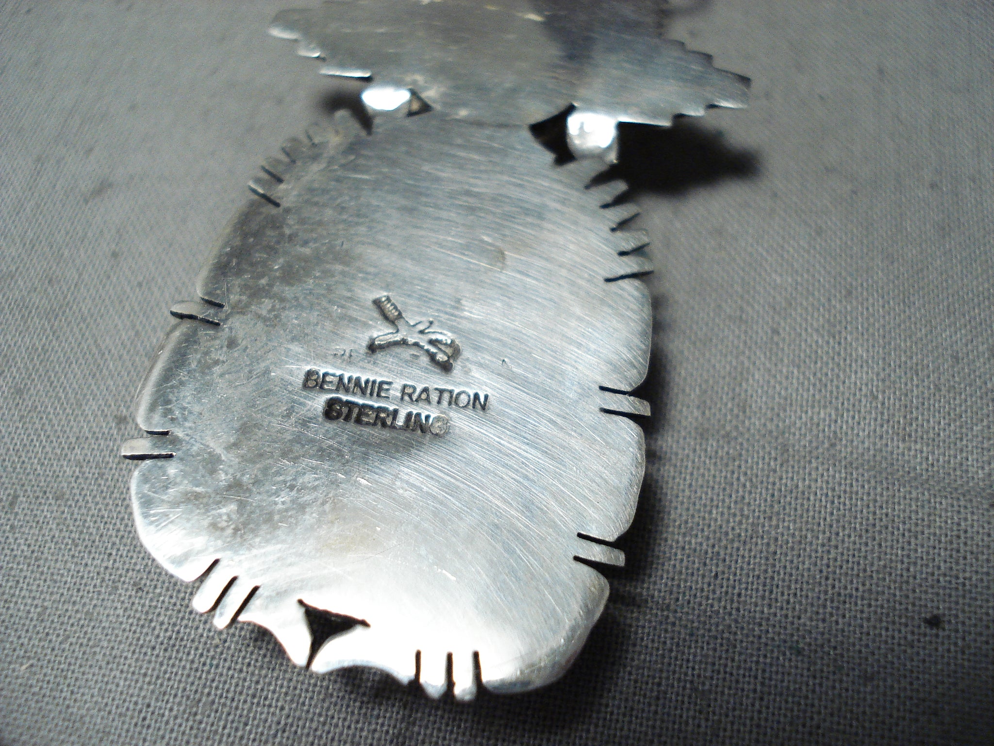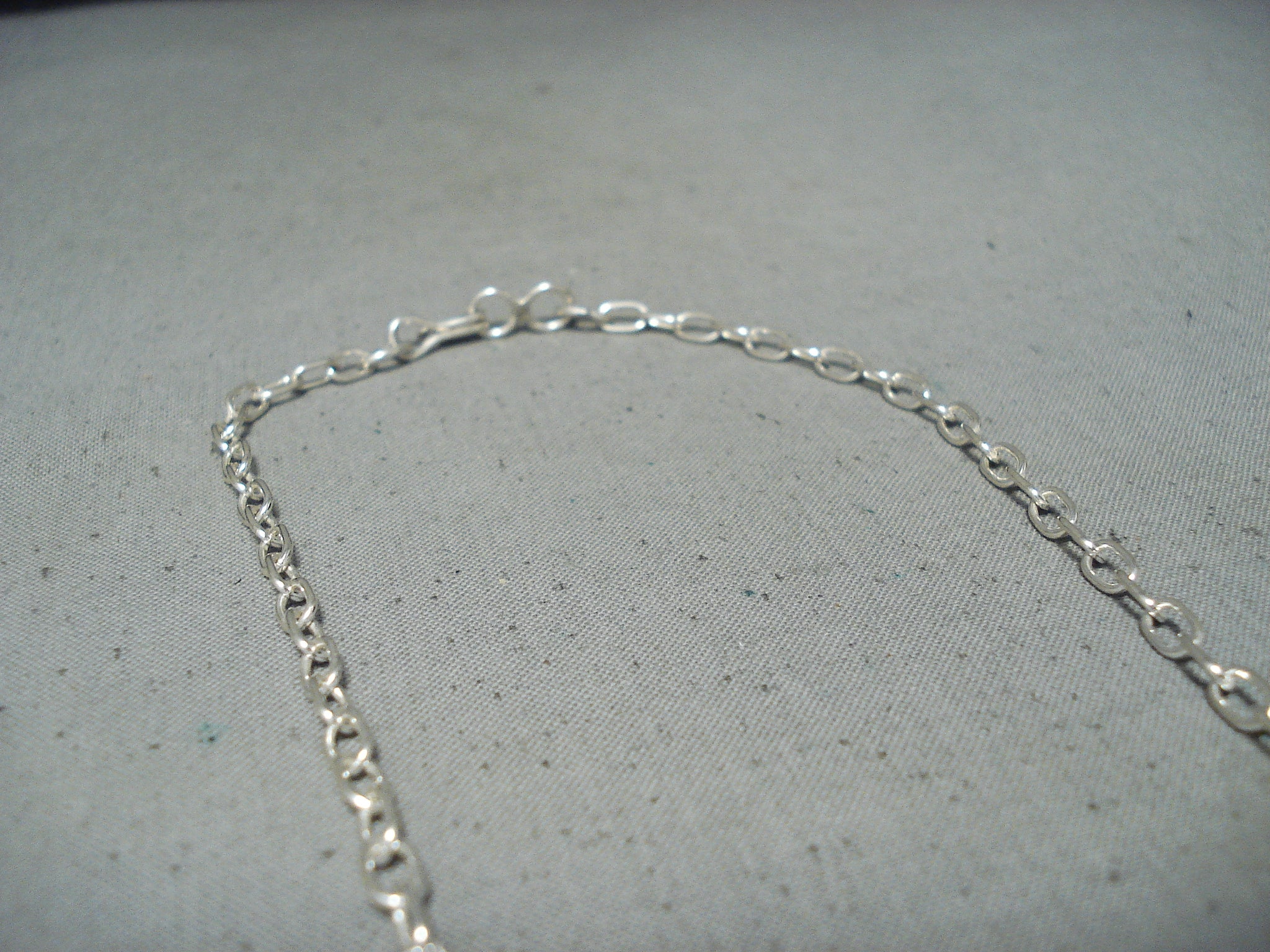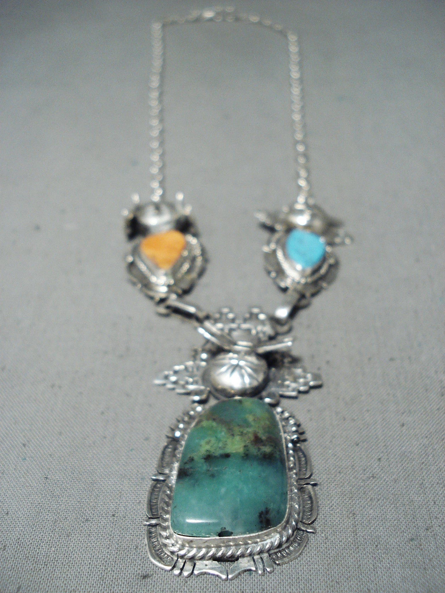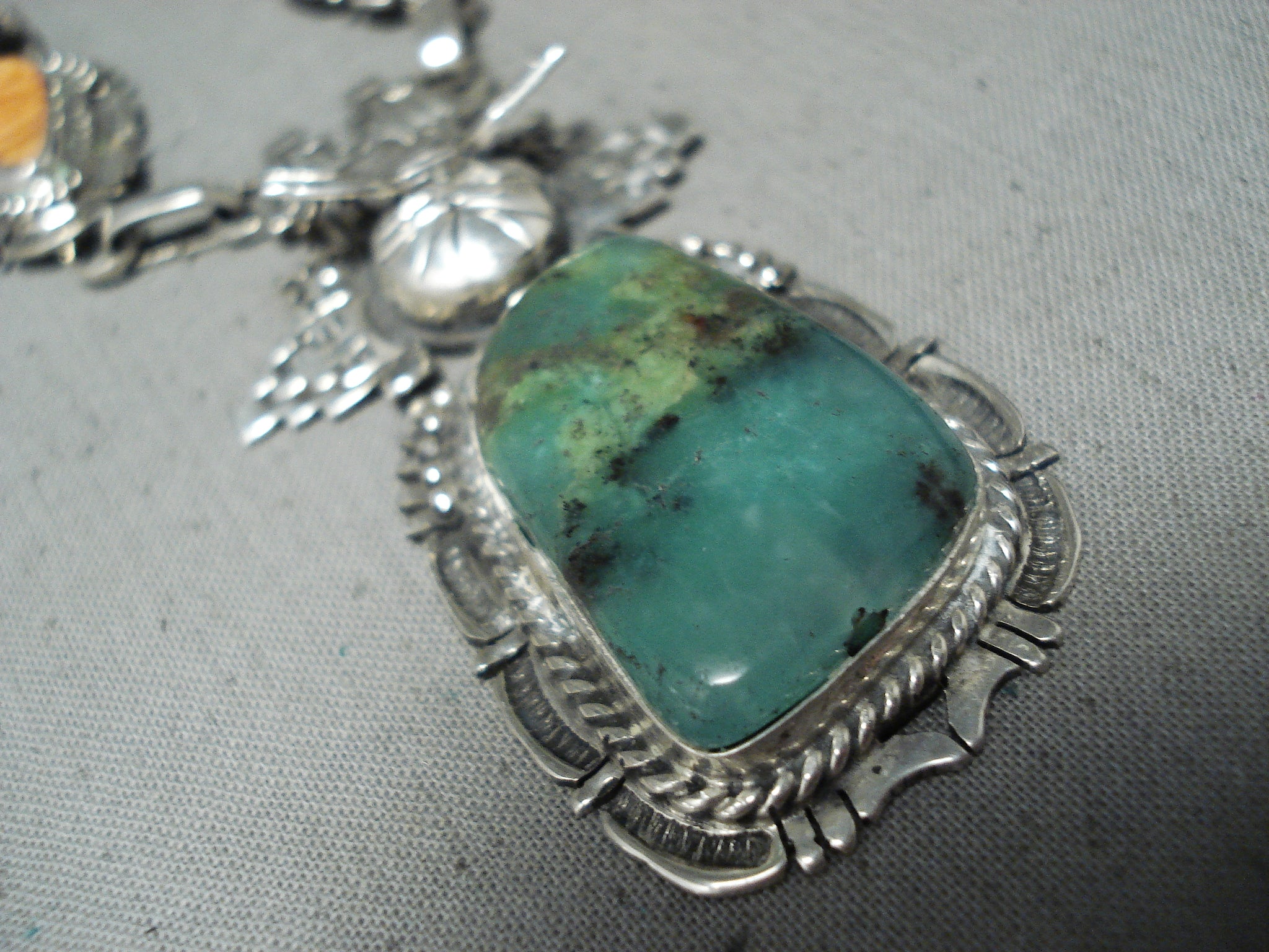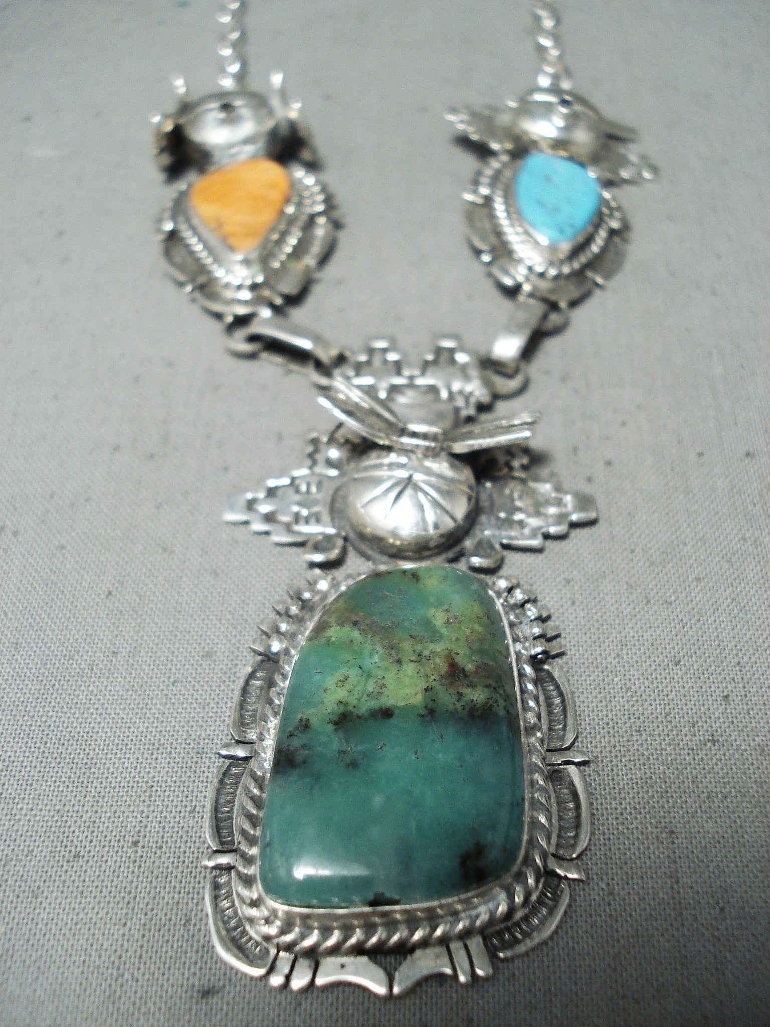 Fascinating Native American Navajo Turquoise Spiny Shell Sterling Silver 3 Kachinas Necklace