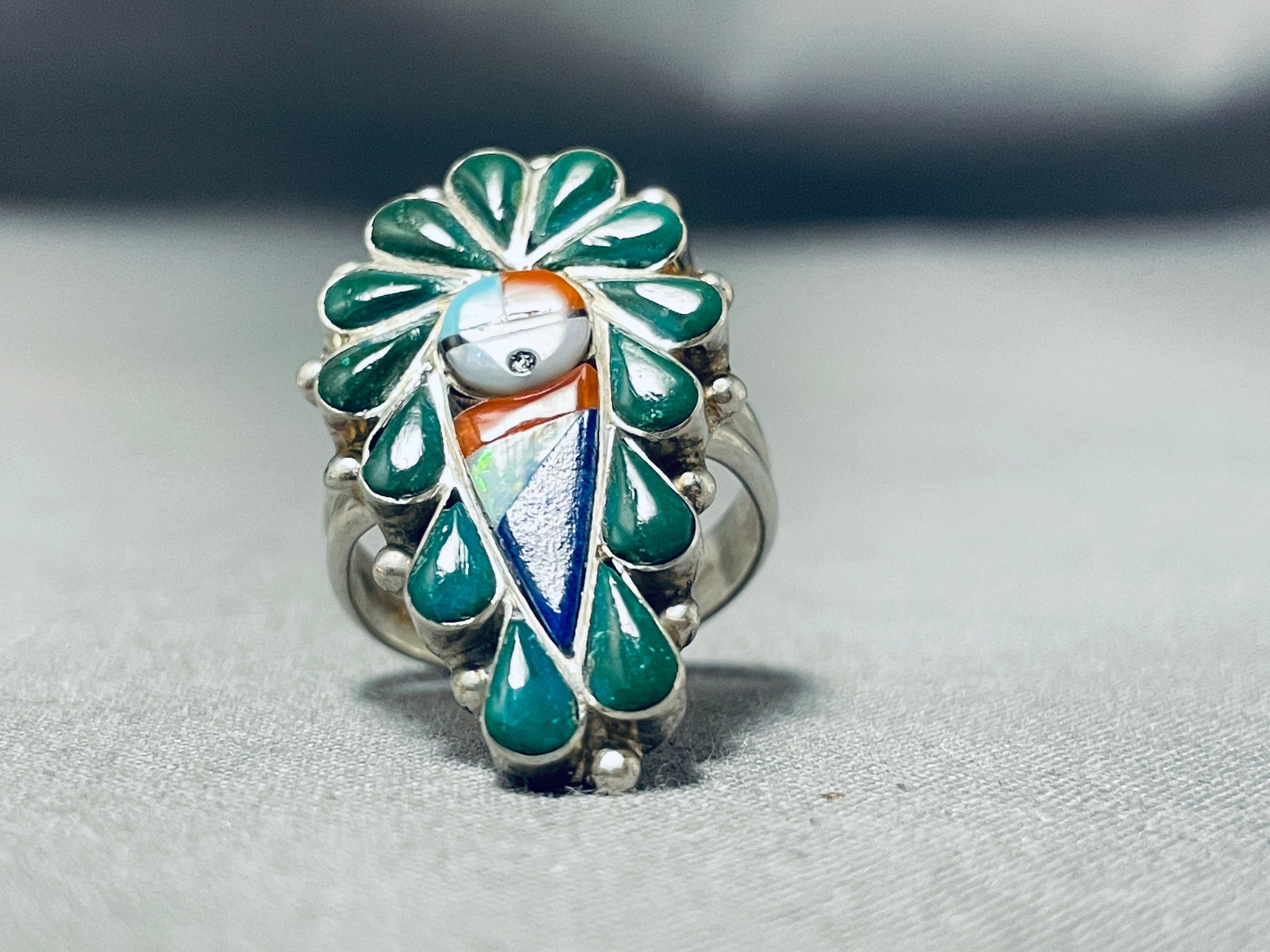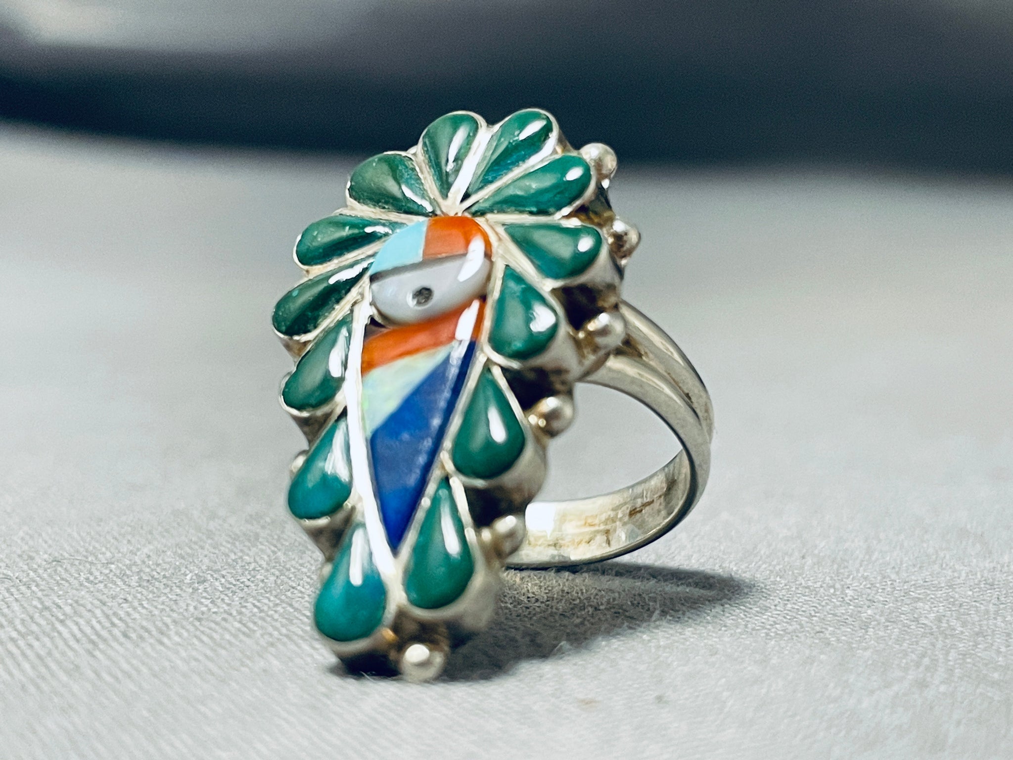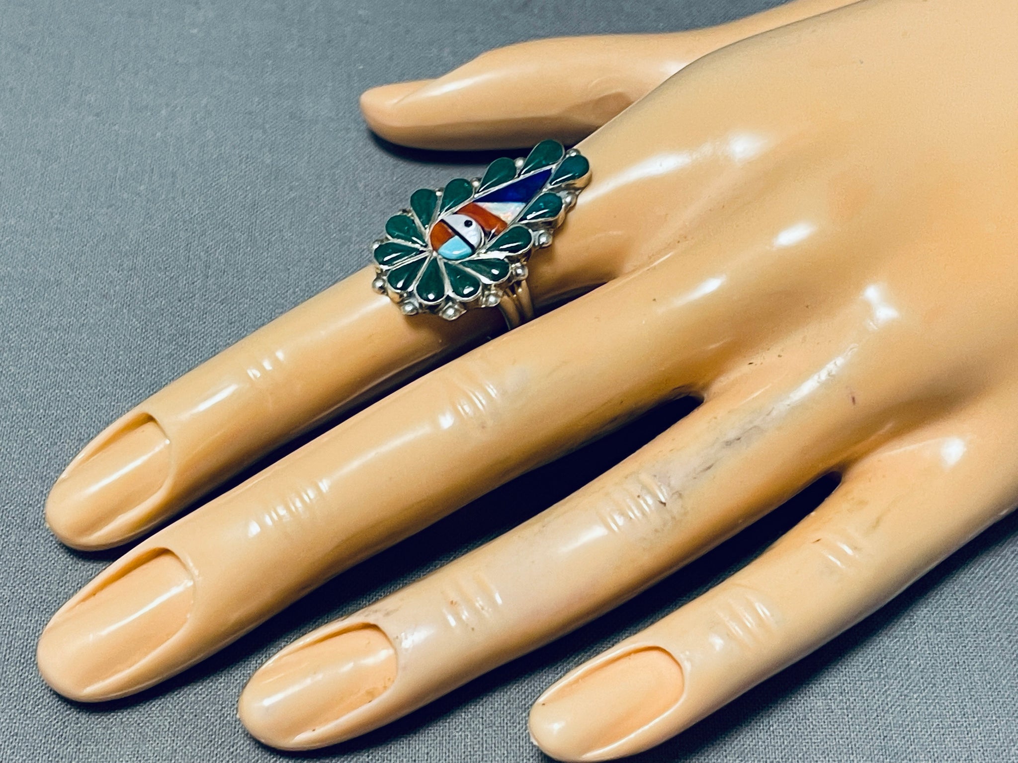 Fascinating Native American Zuni Inlay Turquoise Coral Inlay Sunface Sterling Silver Ring
