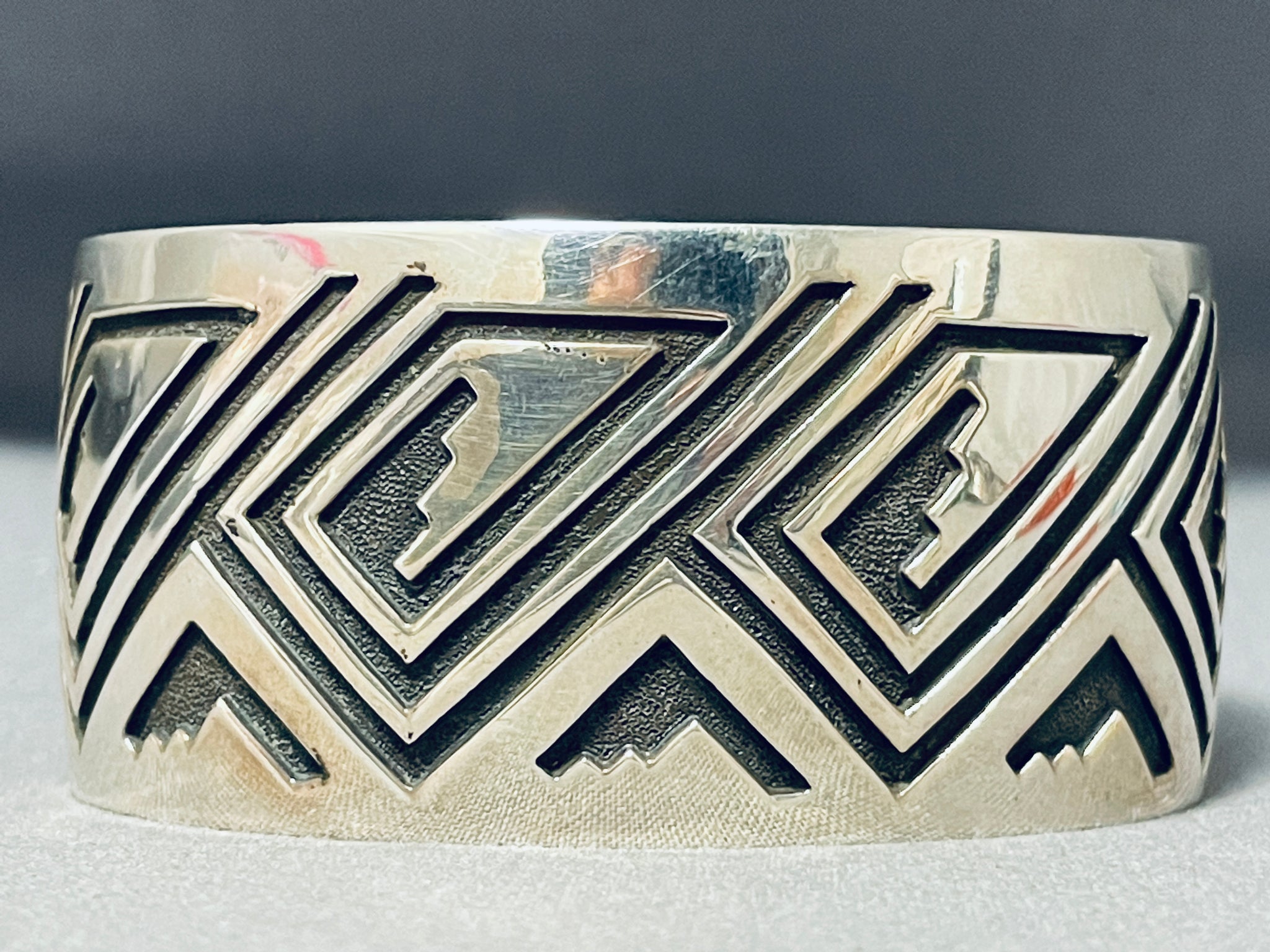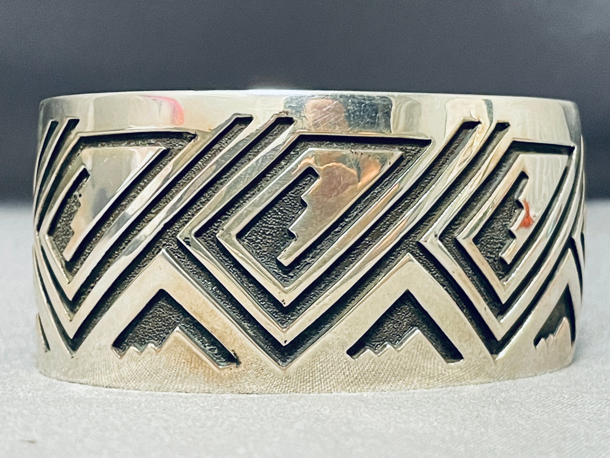 We are proud to offer this superior Navajo silver bracelet. Intense deep geometric designs decorate this incredible cuff from side to side! This piece really catches your eye! The width of the bracelet measures around 1-1/4". Signed by Navajo artist, Freddy Douglas. Sterling silver, marked. The inside end to end measures around 5-7/8" with an additional 1-1/4" gap. Sturdy 70 grams.