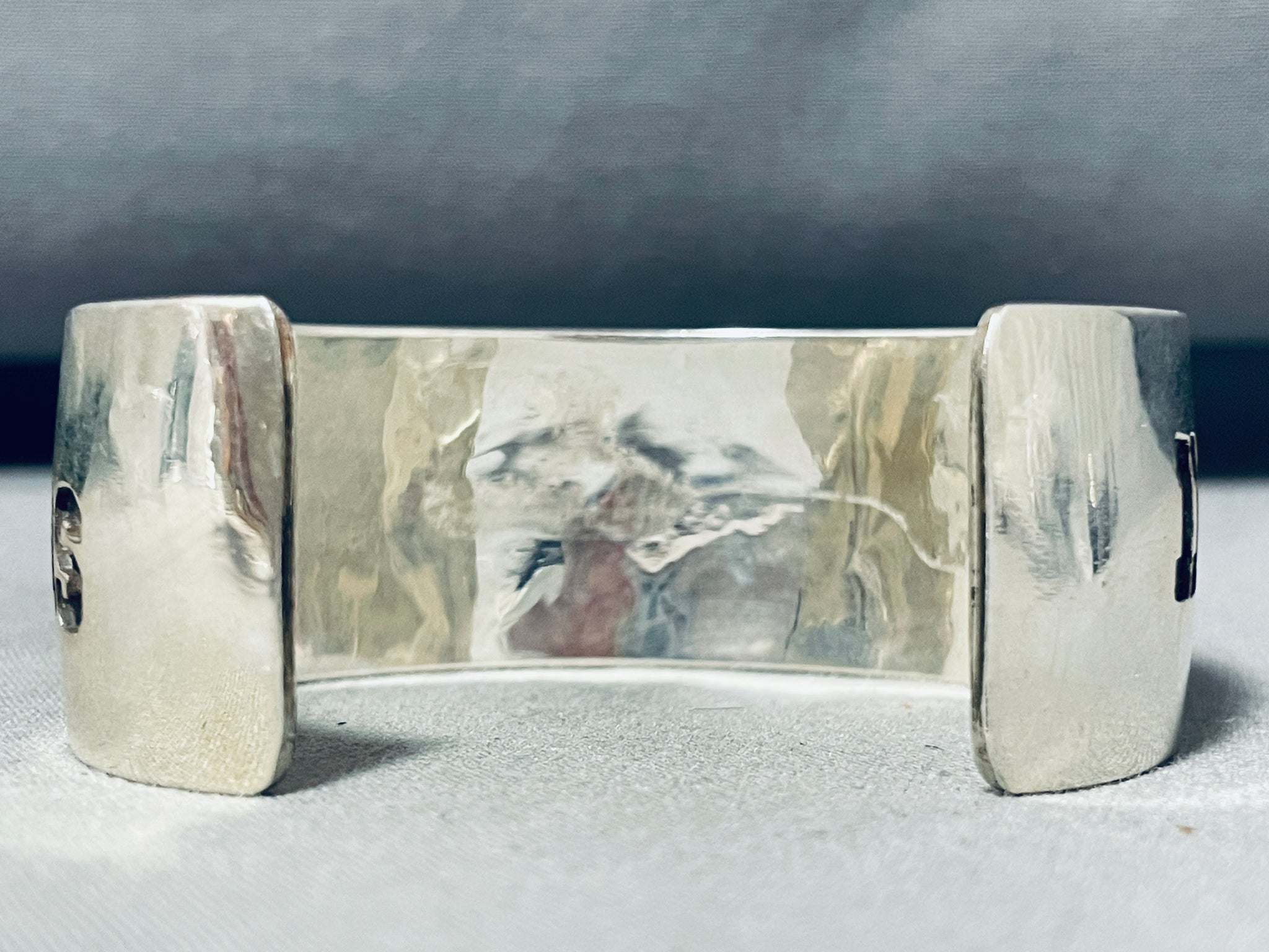 Fred Douglas is a highly respected Navajo jewelry artist celebrated for his exceptional craftsmanship and innovative designs that bridge traditional Navajo techniques with contemporary aesthetics. A master silversmith, Douglas is known for his intricate silverwork, which often features bold geometric patterns, meticulous stamp work, and stunning gemstone inlays. His designs reflect a deep appreciation for Navajo culture and heritage, blending classic motifs with a modern sensibility that resonates with both collectors and connoisseurs of Native American art. Douglas's work frequently incorporates high-quality turquoise, coral, and other gemstones, enhancing the visual impact of his jewelry. His artistry not only preserves the traditions of Navajo silversmithing but also pushes the boundaries of the craft, earning him a prominent place in the world of Native American jewelry. Fred Douglas's creations are celebrated for their beauty, precision, and the rich cultural narrative they convey. The width of the bracelet measures around 1". Signed by Navajo artist, Freddy Douglas. Sterling silver, marked. The inside end to end measures around 5-7/8" with an additional 1-1/4" gap. Sturdy 57 grams.