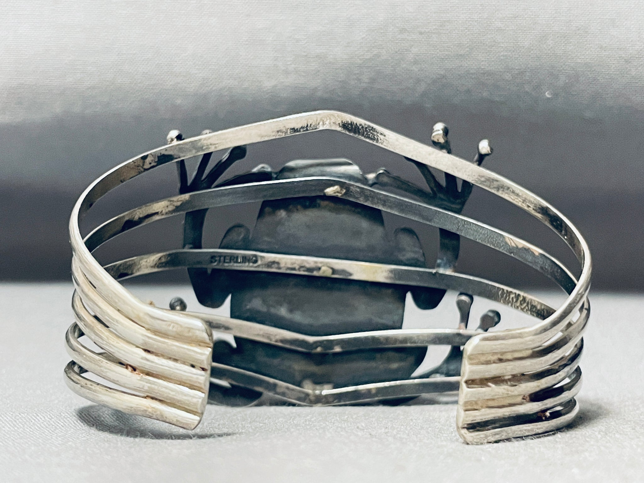This is an amazing vintage Southwestern single stone silver frog bracelet. This incredible bracelet contains a very detailed handmade silver frog that is placed on the center of the bracelet. Located on the frogs back is a marvelous spiderweb turquoise stone that contains amazing coloration. This bracelet includes a phenomenal sturdy graduating five silver shank cuff. The entire frog measures around 1-7/8" X 2-1/2". I absolutely love the detailing on this fine bracelet. The center stone measures around 1-1/4" x 1". The width of the bracelet measures around 1-7/8". Sterling silver, marked. The inside end to end measures around 5-3/4" with an additional 1" gap. Sturdy 47 grams.
