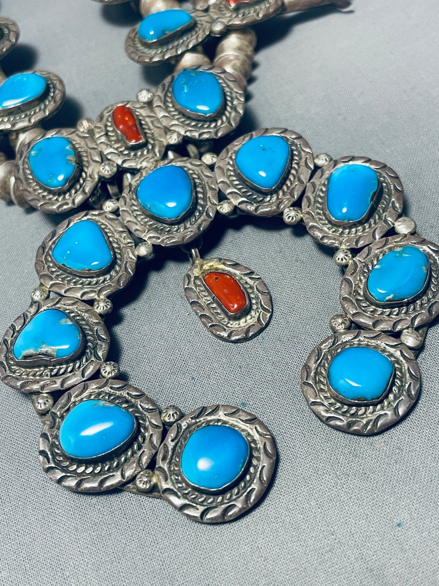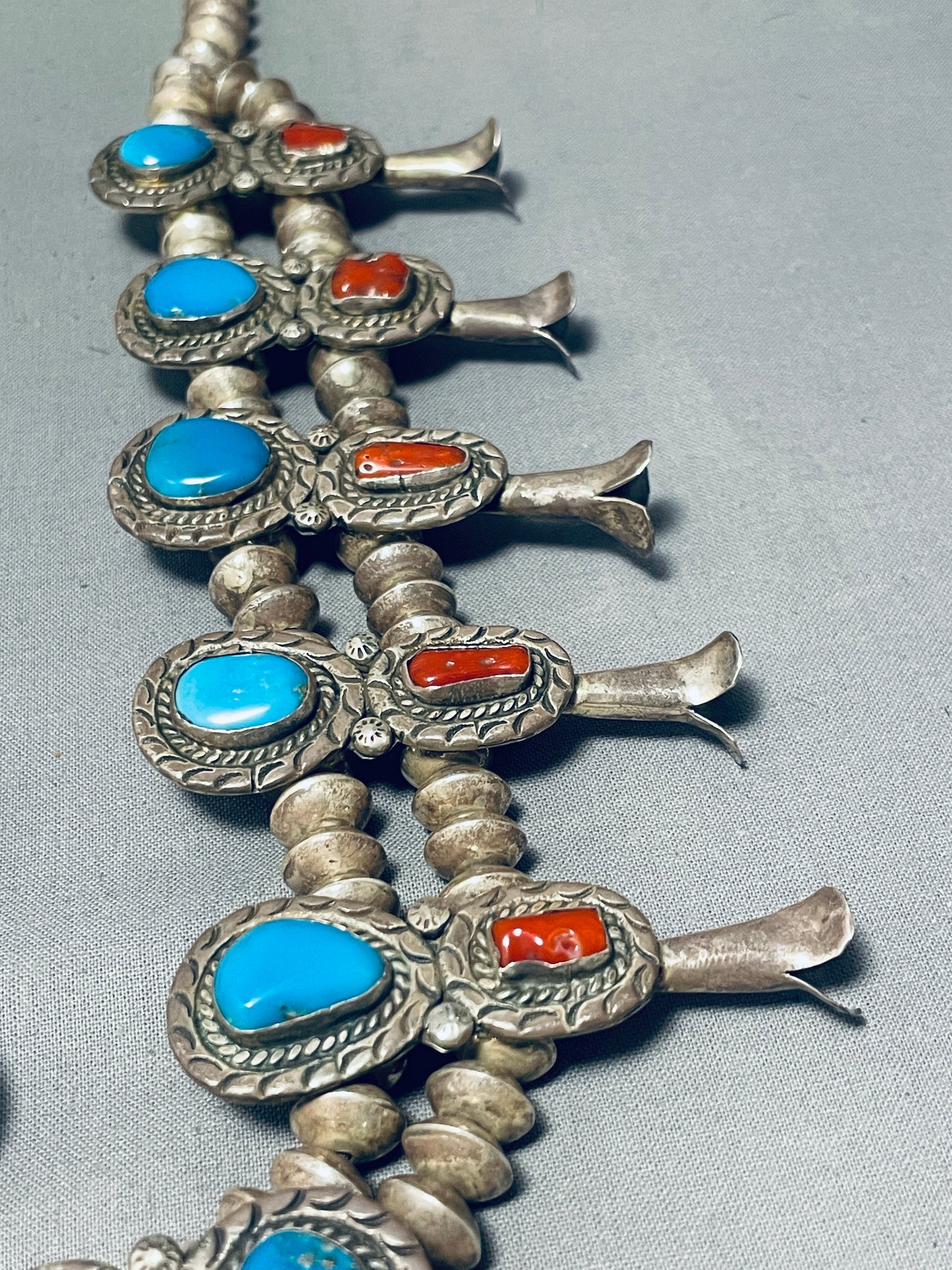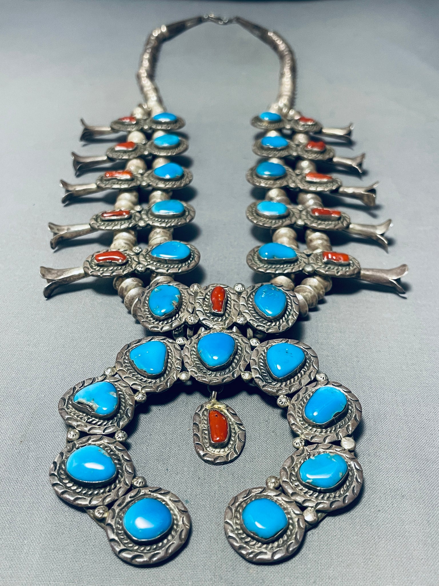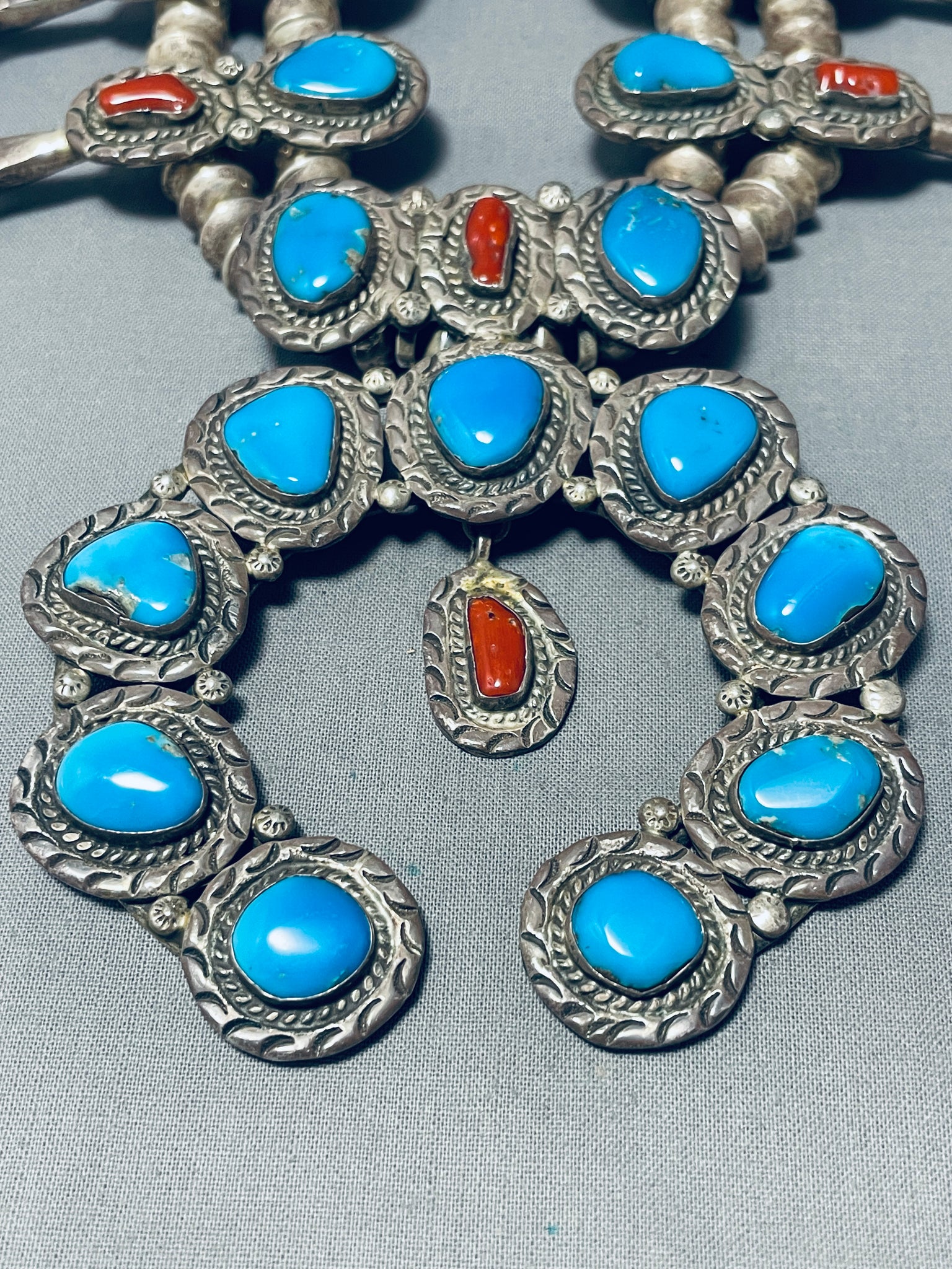 This is a museum quality vintage Navajo very large and long turquoise, coral and silver squash blossom necklace. This mind blowing squash blossom includes 21 beauitiful large and chunky Morenci turquoise stones with 12 accenting chunky coral stones. Surrounding the stones are phenomenal wave stampings along with shells and ropes. That heavy and large double silver shank naja pendant measures a whopping 4" X 3-1/2". Located throughout the entire necklace are marvelous large round silver beads with fabulous end fluted silver cones and a traditional silver clasp. Squash blossom necklaces are very rare to come across that are this long, intricate and detailed especially consisting of both turquoise and coral stones, WOW! . Sterling silver. Cir. 1970's+. Signed by Navajo artist, PJ. The length of the necklace measures around 40". Sturdy 348 grams. A Navajo squash blossom necklace is a traditional piece of Native American jewelry that originated from the Navajo tribe, known for their exceptional craftsmanship. It is a significant and highly sought-after item in Native American jewelry. The squash blossom necklace typically features a central pendant called the "naja," which is crescent-shaped and represents a Navajo or Spanish influence. The naja pendant is often adorned with gemstones or turquoise, a highly valued stone in Native American culture. From the bottom of the naja pendant, several silver "squash blossoms" or "blossom beads" are suspended, resembling the blossoms of a squash or pomegranate flower. These blossom beads are handcrafted from silver and have a distinctive flared shape. They may be plain or decorated with intricate stamp work or repoussé designs, showcasing the silversmith's skill and artistry. The necklace itself is usually made of silver beads, often handmade and strung on a chain or a leather cord. Navajo squash blossom necklaces have deep cultural and symbolic significance to the Navajo people. The squash blossom is considered a symbol of abundance, fertility, and prosperity. It is also believed to bring good luck and protect against evil spirits. The necklace is often worn by both men and women during important ceremonies, celebrations, and dances. Today, Navajo squash blossom necklaces are not only cherished for their cultural and historical significance but also admired as exquisite pieces of jewelry. They are highly valued by collectors and often sought after by individuals who appreciate the beauty and craftsmanship of Native American art