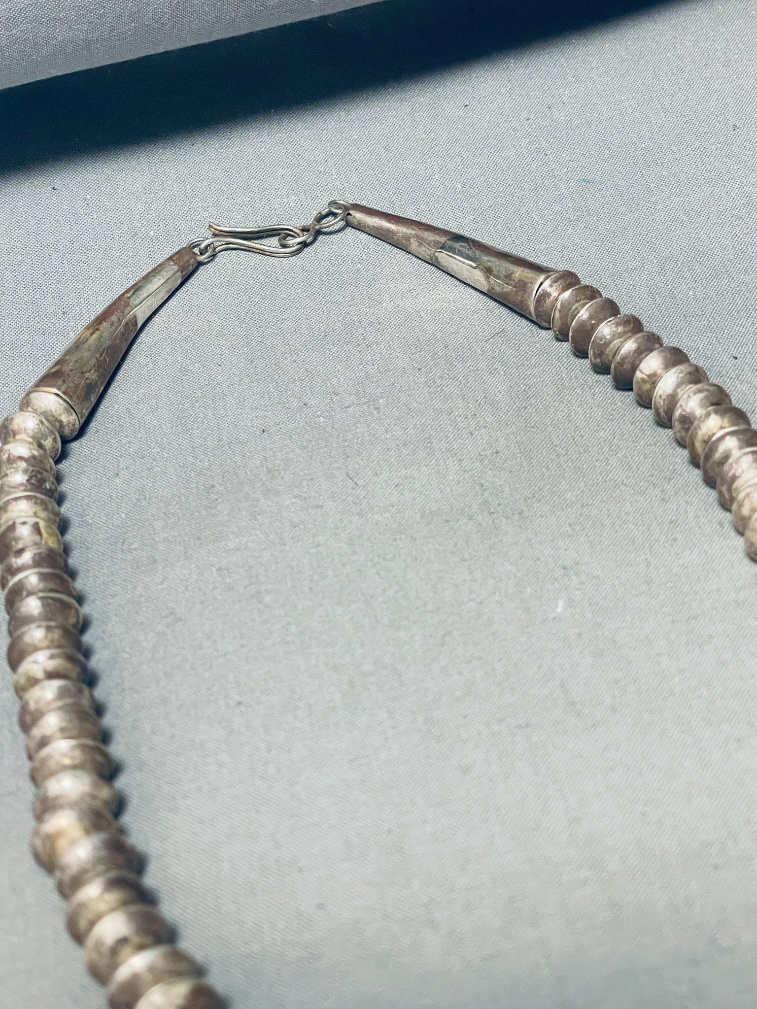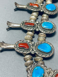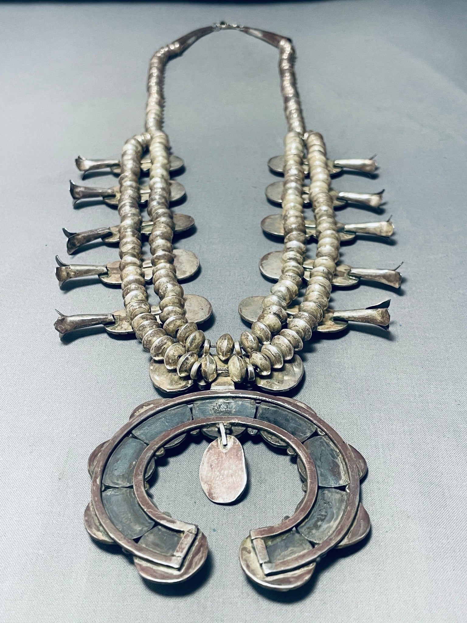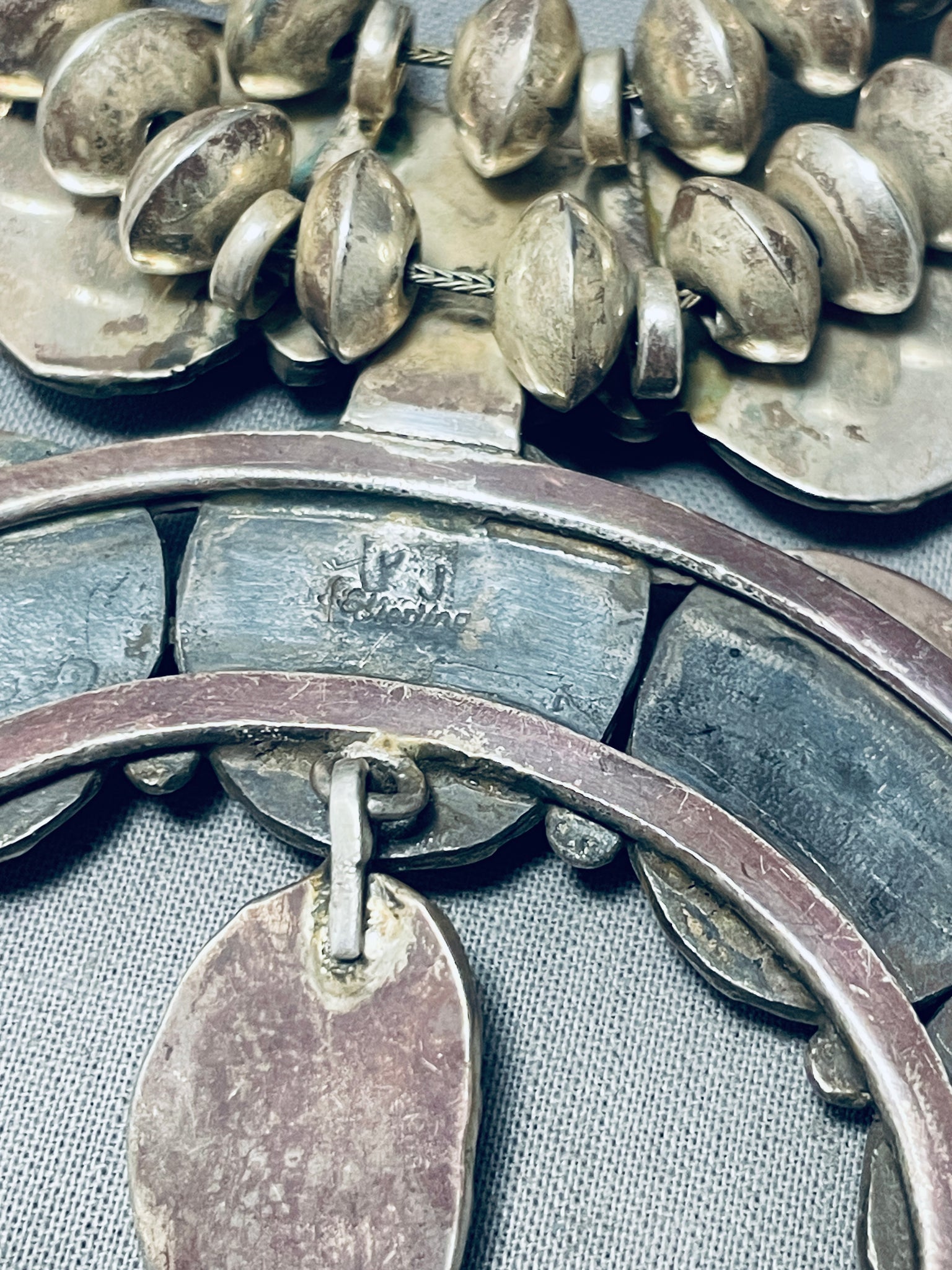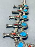 This is a museum quality vintage Navajo very large and long turquoise, coral and silver squash blossom necklace. This mind blowing squash blossom includes 21 beauitiful large and chunky Morenci turquoise stones with 12 accenting chunky coral stones. Surrounding the stones are phenomenal wave stampings along with shells and ropes. That heavy and large double silver shank naja pendant measures a whopping 4" X 3-1/2". Located throughout the entire necklace are marvelous large round silver beads with fabulous end fluted silver cones and a traditional silver clasp. Squash blossom necklaces are very rare to come across that are this long, intricate and detailed especially consisting of both turquoise and coral stones, WOW! . Sterling silver. Cir. 1970's+. Signed by Navajo artist, PJ. The length of the necklace measures around 40". Sturdy 348 grams. A Navajo squash blossom necklace is a traditional piece of Native American jewelry that originated from the Navajo tribe, known for their exceptional craftsmanship. It is a significant and highly sought-after item in Native American jewelry. The squash blossom necklace typically features a central pendant called the "naja," which is crescent-shaped and represents a Navajo or Spanish influence. The naja pendant is often adorned with gemstones or turquoise, a highly valued stone in Native American culture. From the bottom of the naja pendant, several silver "squash blossoms" or "blossom beads" are suspended, resembling the blossoms of a squash or pomegranate flower. These blossom beads are handcrafted from silver and have a distinctive flared shape. They may be plain or decorated with intricate stamp work or repoussé designs, showcasing the silversmith's skill and artistry. The necklace itself is usually made of silver beads, often handmade and strung on a chain or a leather cord. Navajo squash blossom necklaces have deep cultural and symbolic significance to the Navajo people. The squash blossom is considered a symbol of abundance, fertility, and prosperity. It is also believed to bring good luck and protect against evil spirits. The necklace is often worn by both men and women during important ceremonies, celebrations, and dances. Today, Navajo squash blossom necklaces are not only cherished for their cultural and historical significance but also admired as exquisite pieces of jewelry. They are highly valued by collectors and often sought after by individuals who appreciate the beauty and craftsmanship of Native American art