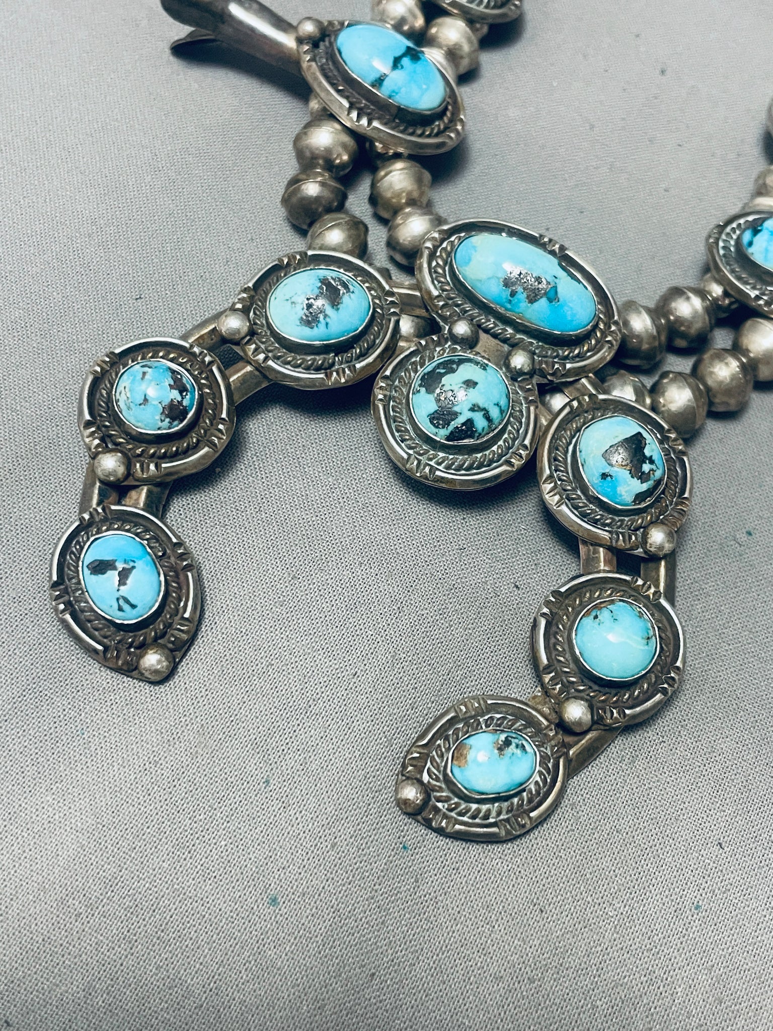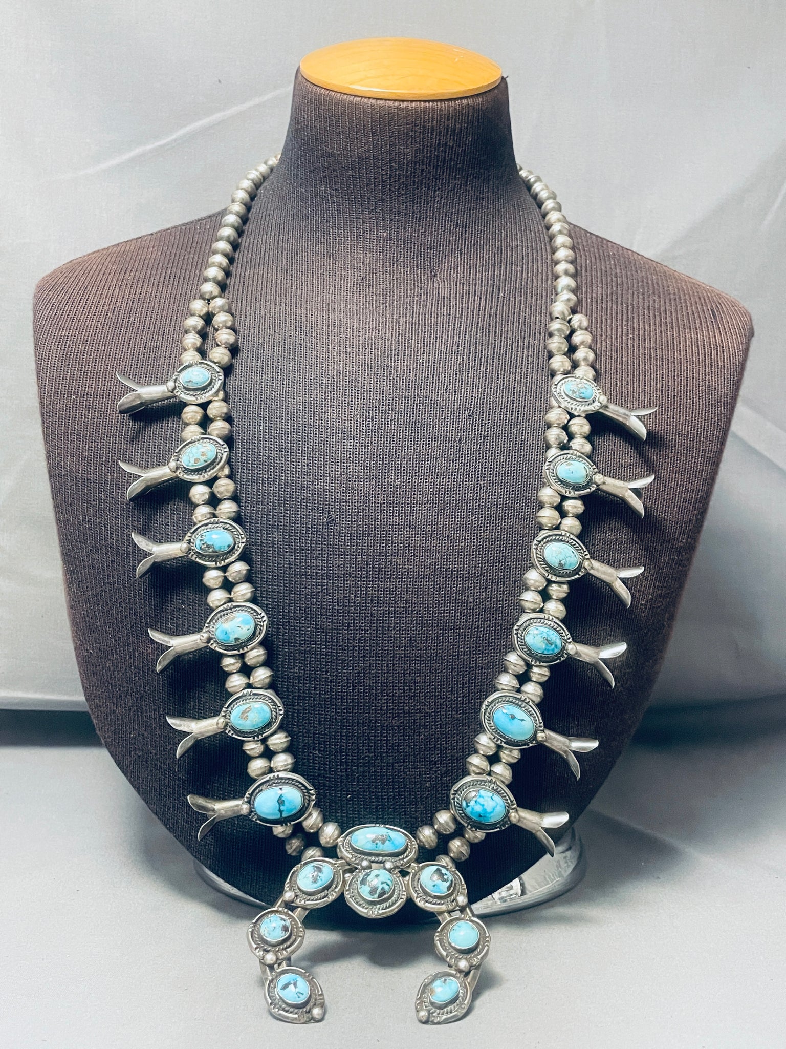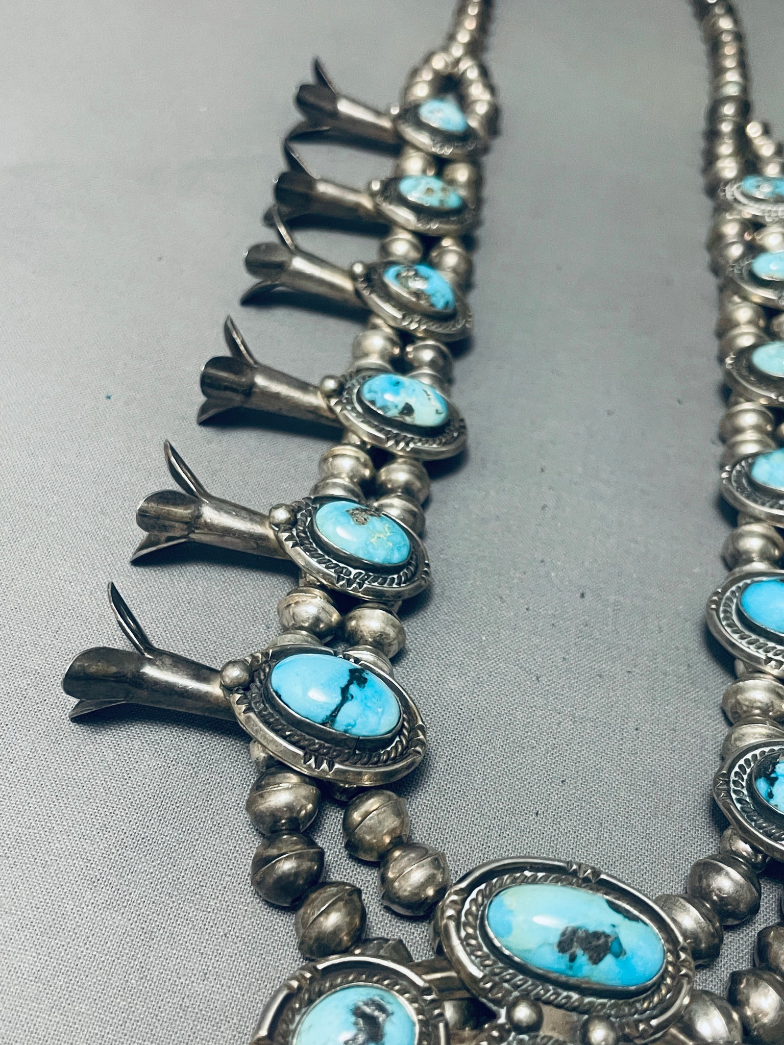 Gasp! Vintage Native American Navajo 220 Gram Sterling Silver Turquoise Squash Blossom Necklace