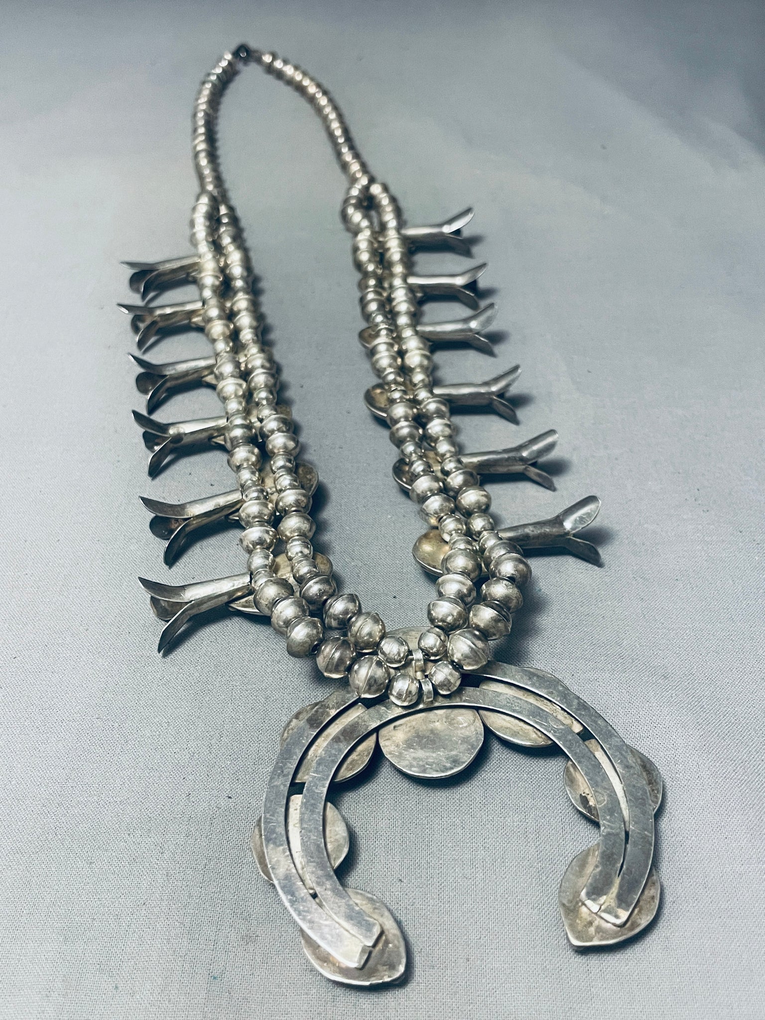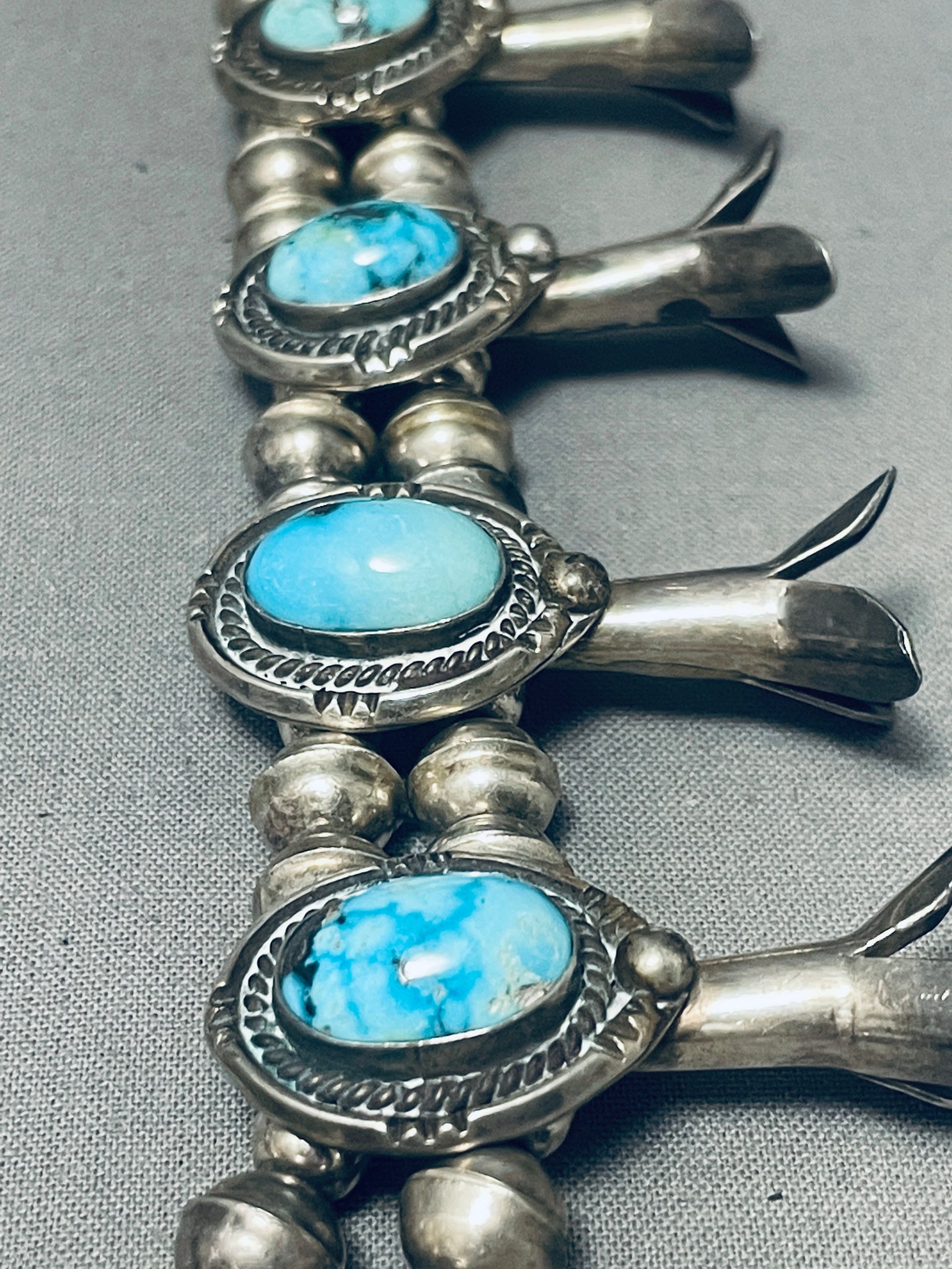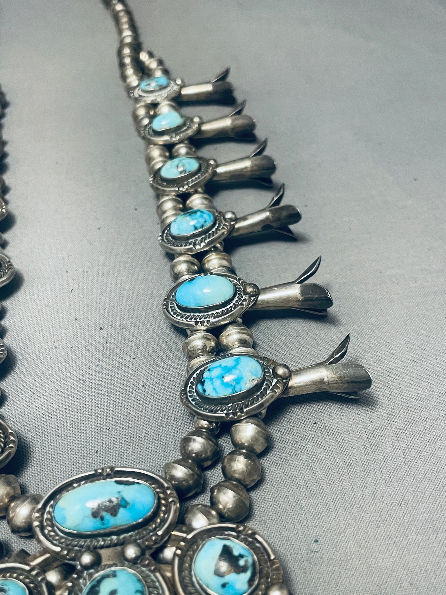 Gasp! Vintage Native American Navajo 220 Gram Sterling Silver Turquoise Squash Blossom Necklace