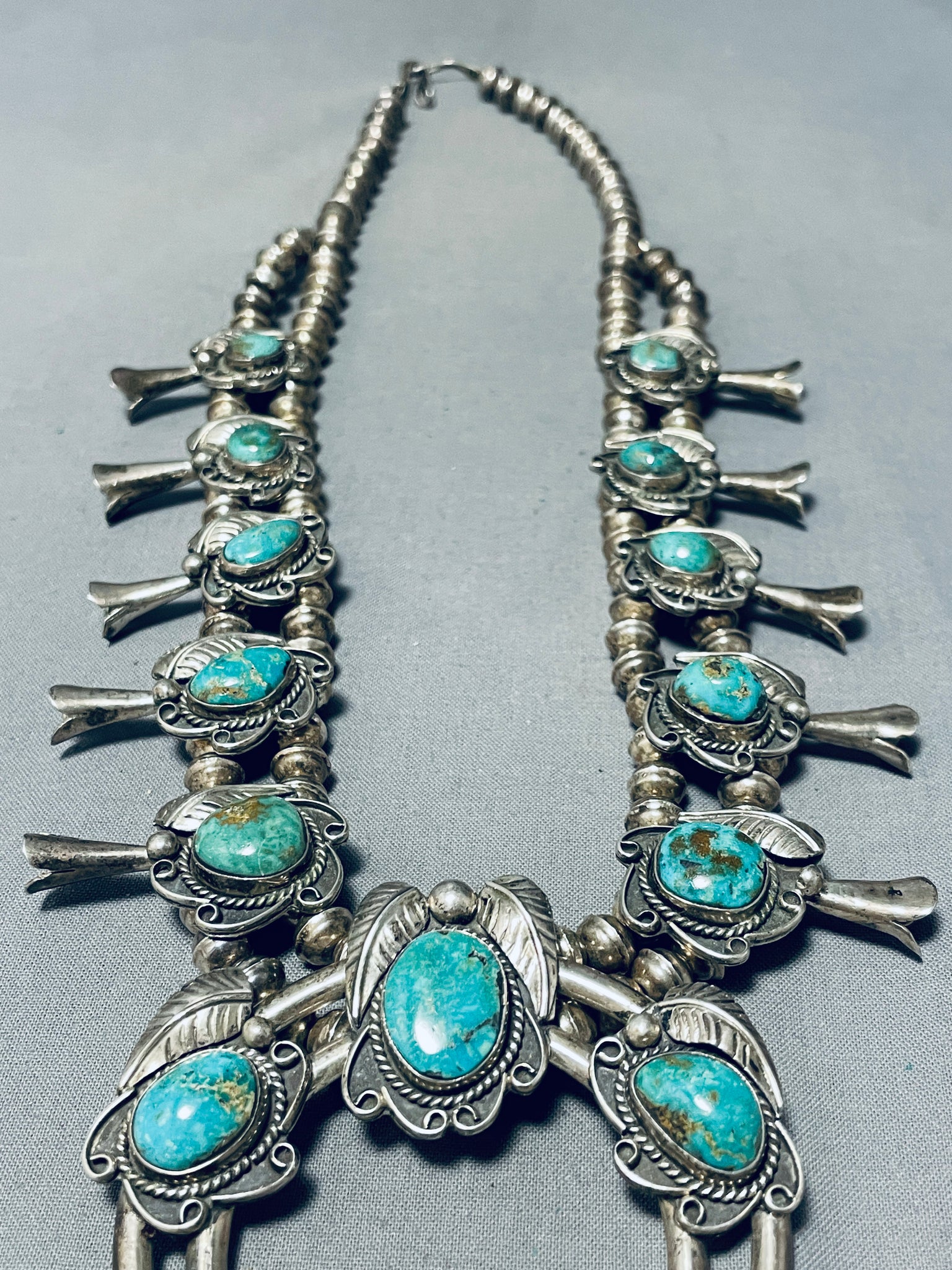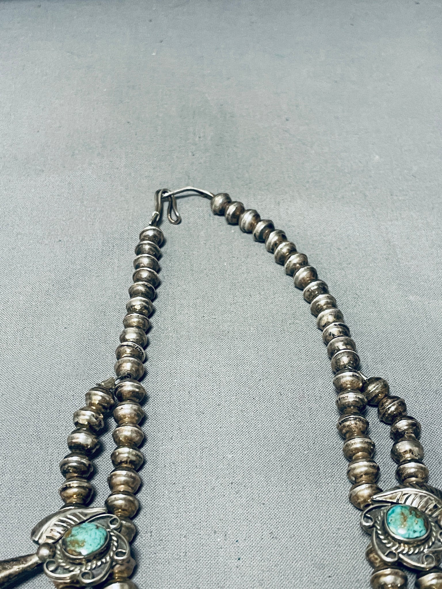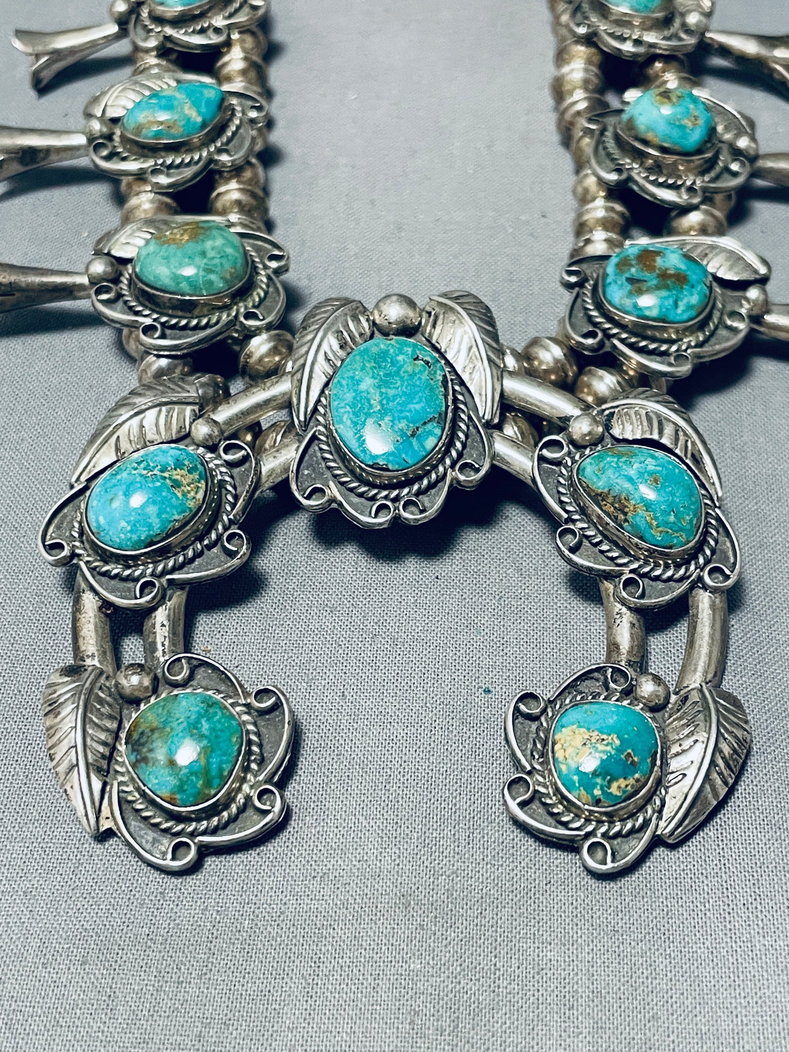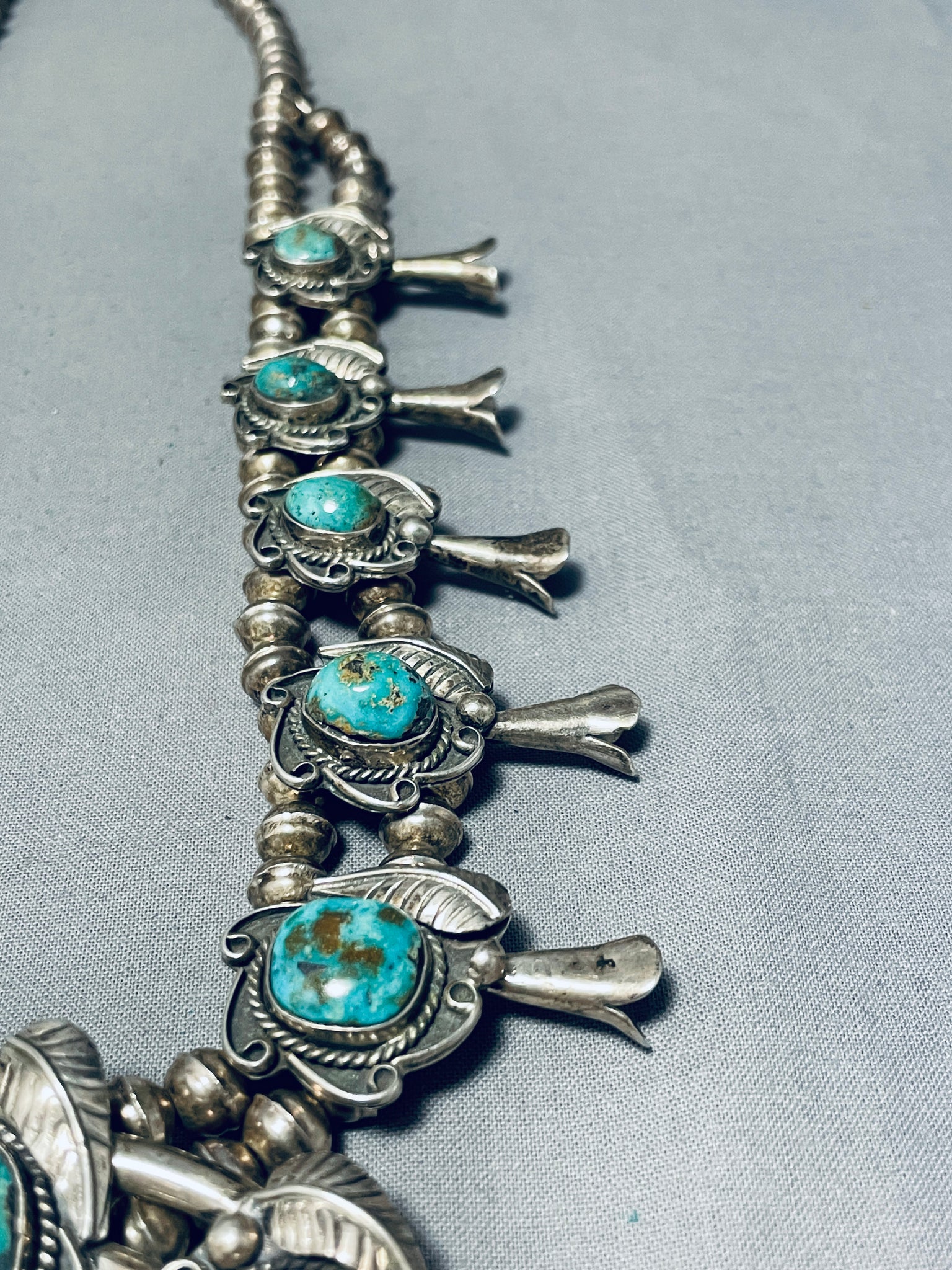 Gasp! Vintage Native American Navajo Turquoise Sterling Silver Squash Blossom Necklace
