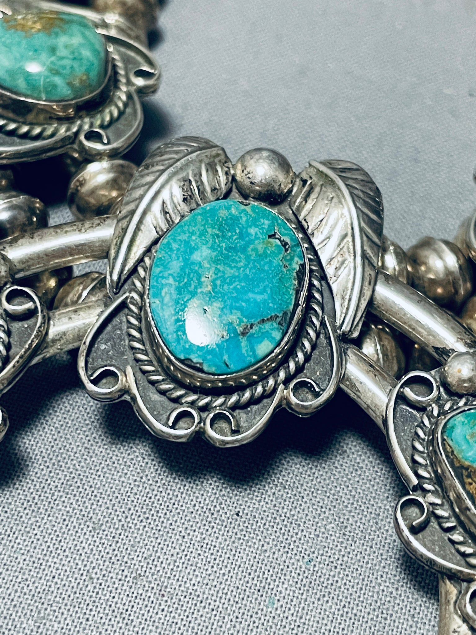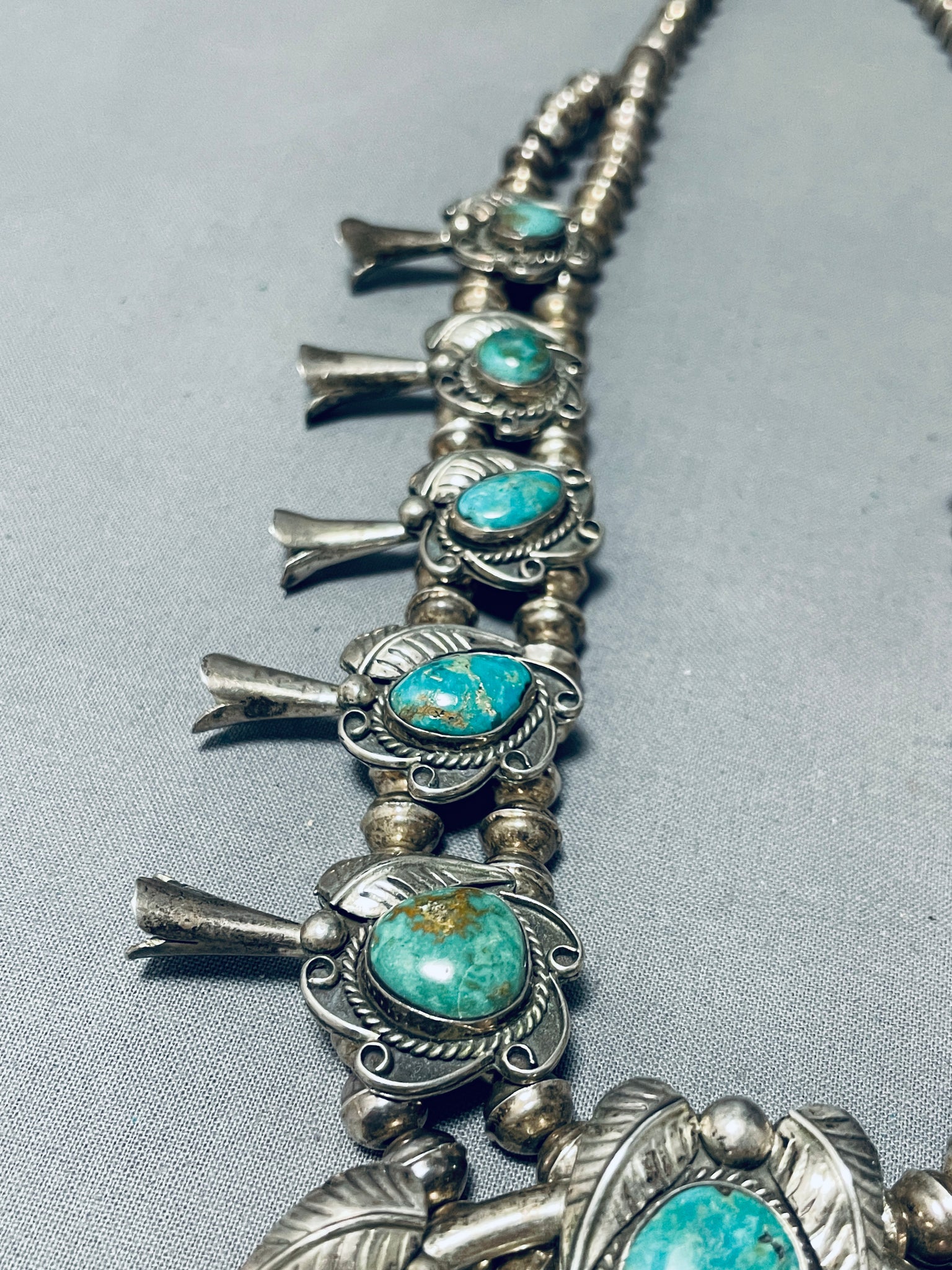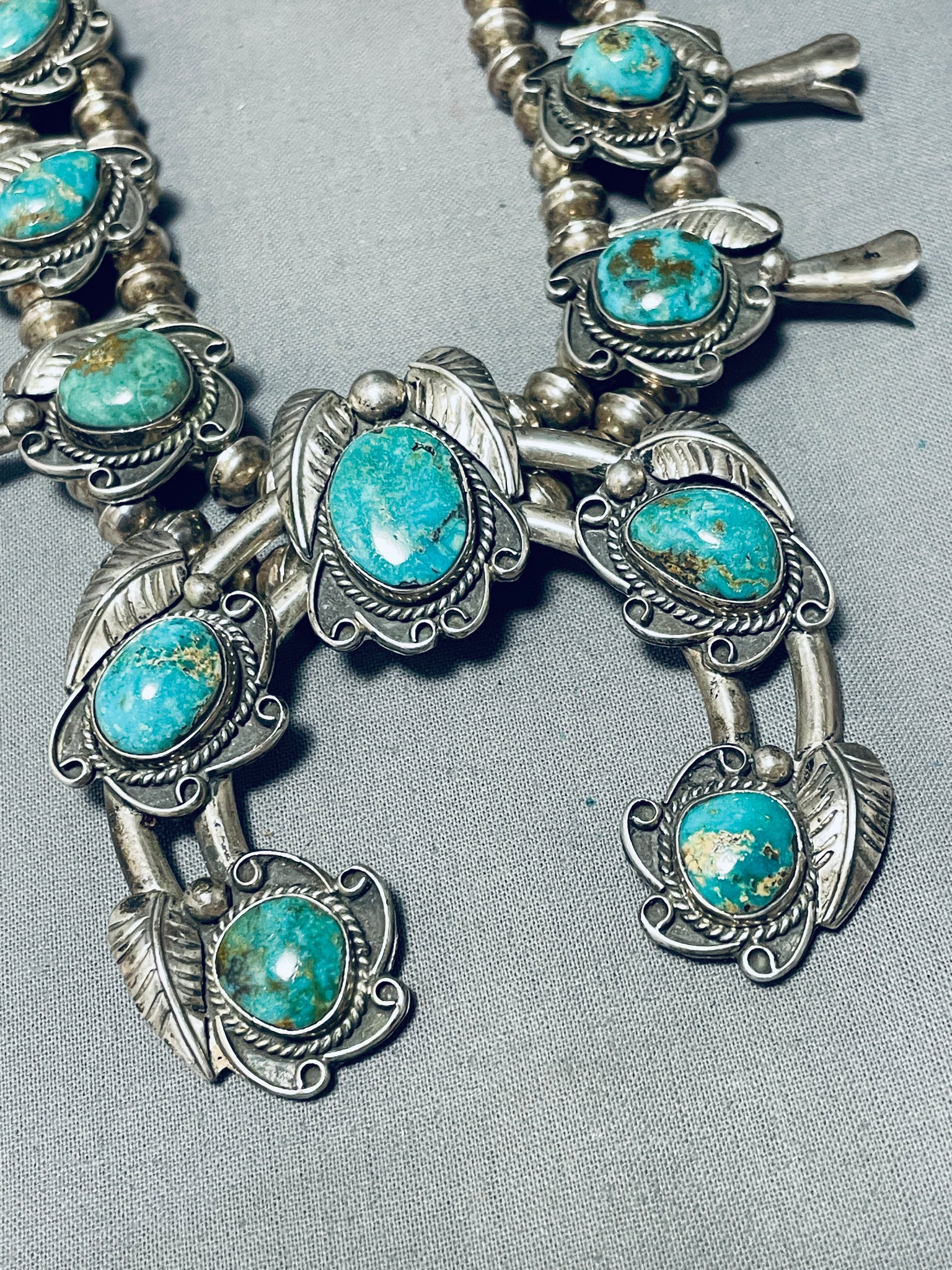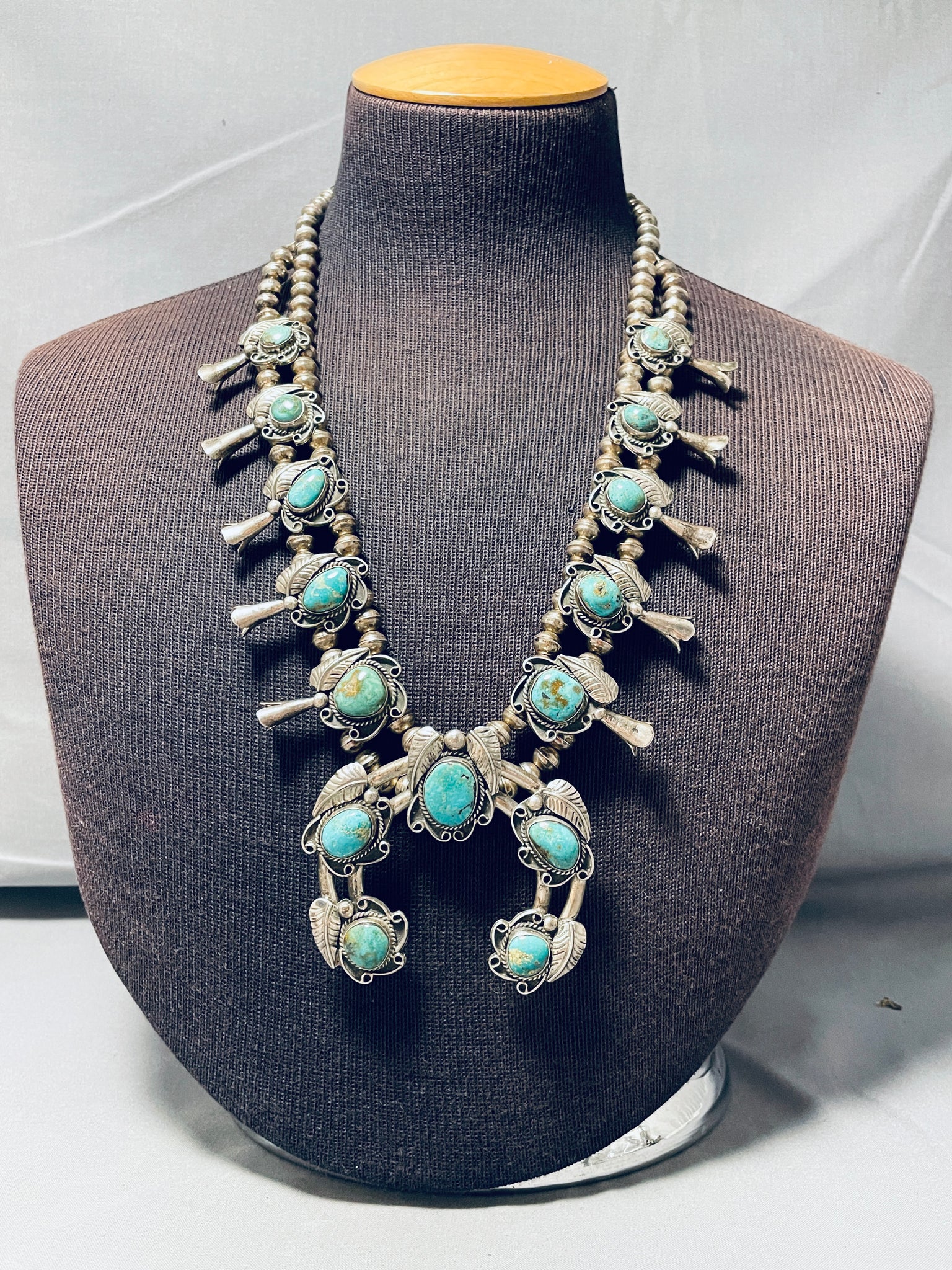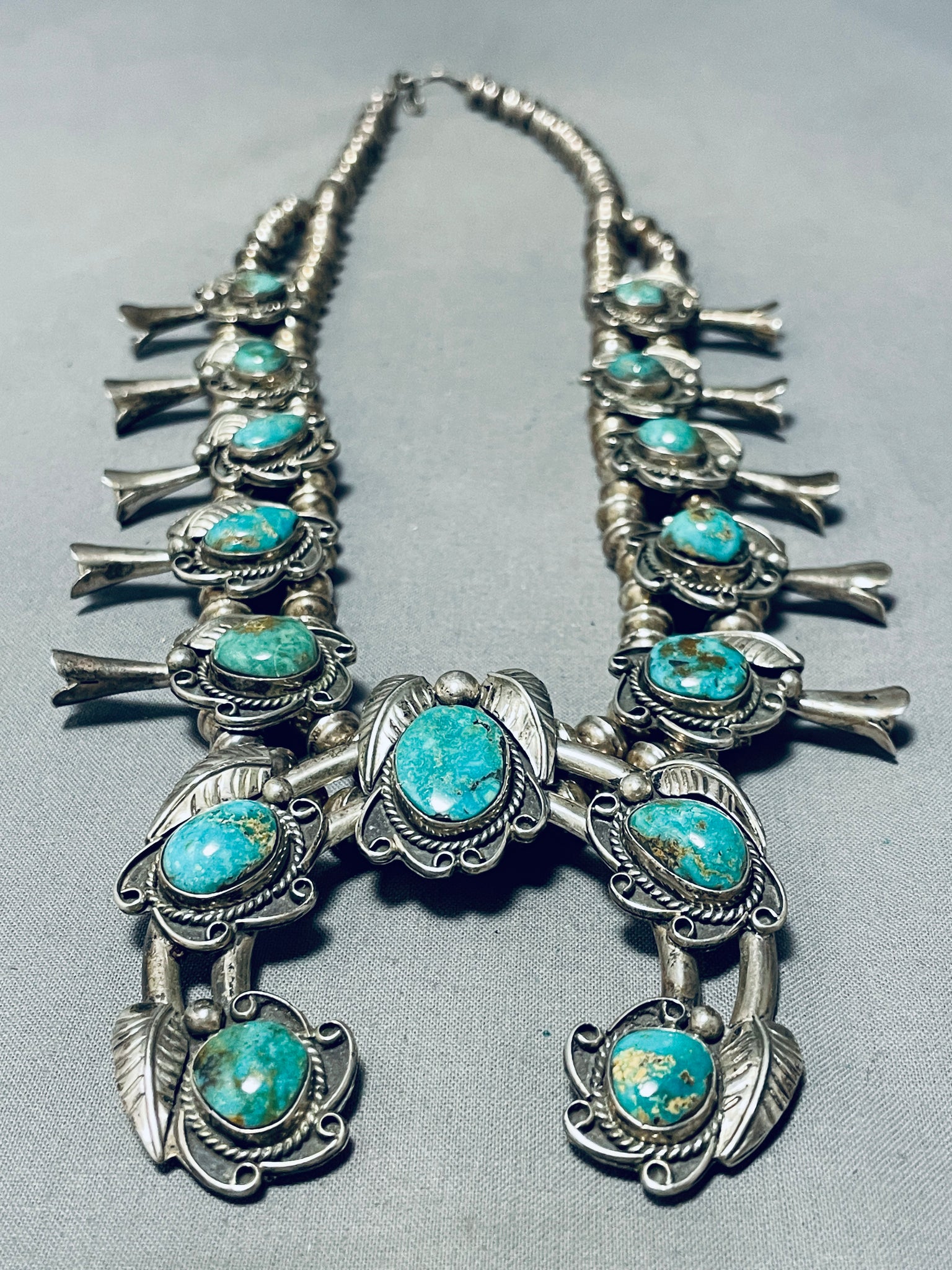 Gasp! Vintage Native American Navajo Turquoise Sterling Silver Squash Blossom Necklace