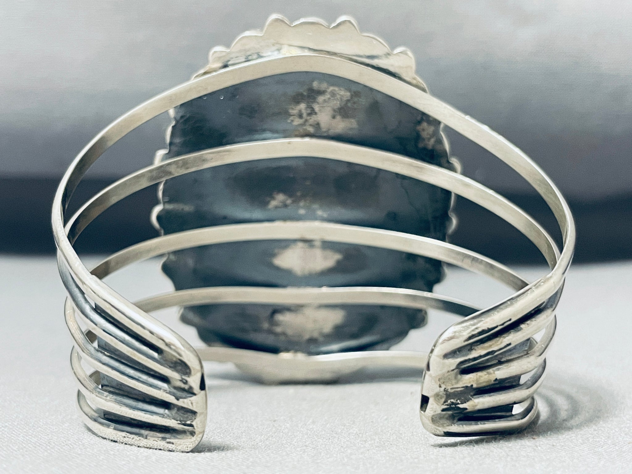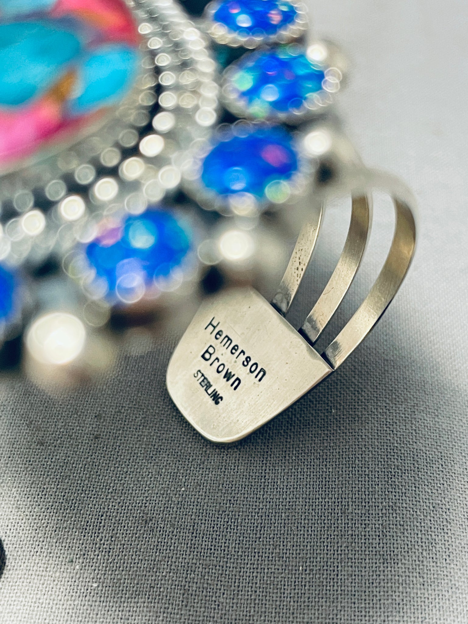 opals and silver beads! This breathtaking bracelet has a handcarved graduated 5 rail silver cuff! Absolutely Stunning Piece! The center stone measures around 1-1/2" x 7/8". The width of the bracelet measures around 2-1/2". Signed by Navajo artist, Hemerson Brown. Sterling silver, marked. The inside end to end measures around 6" with an additional 1" gap. Sturdy 58 grams.