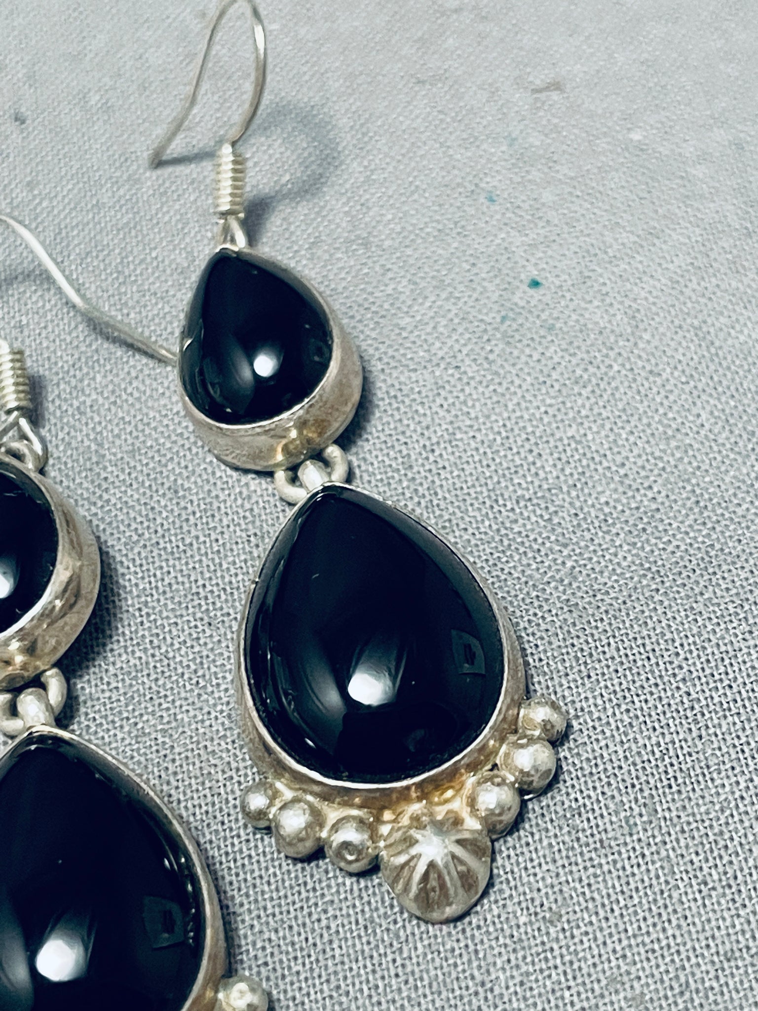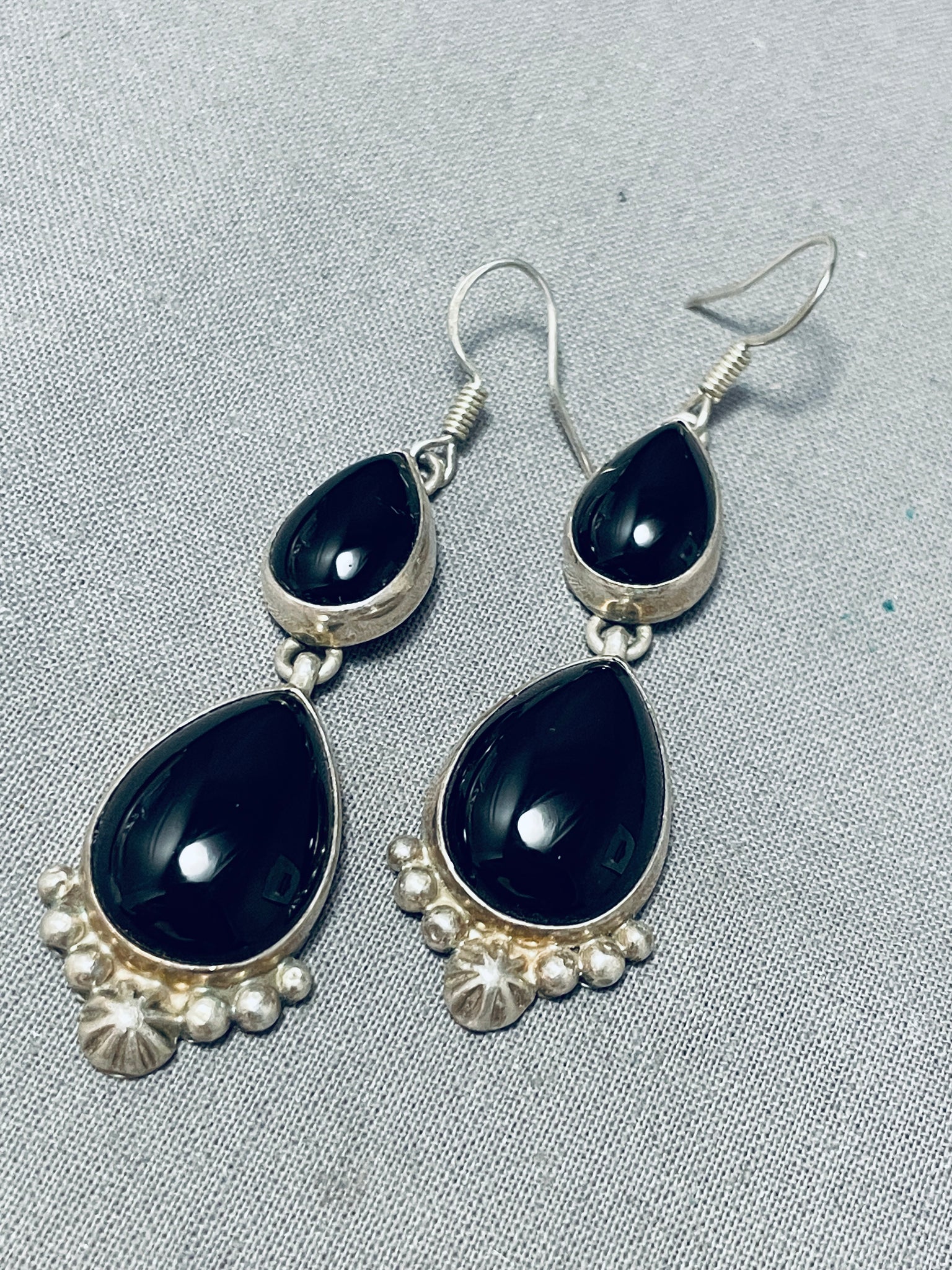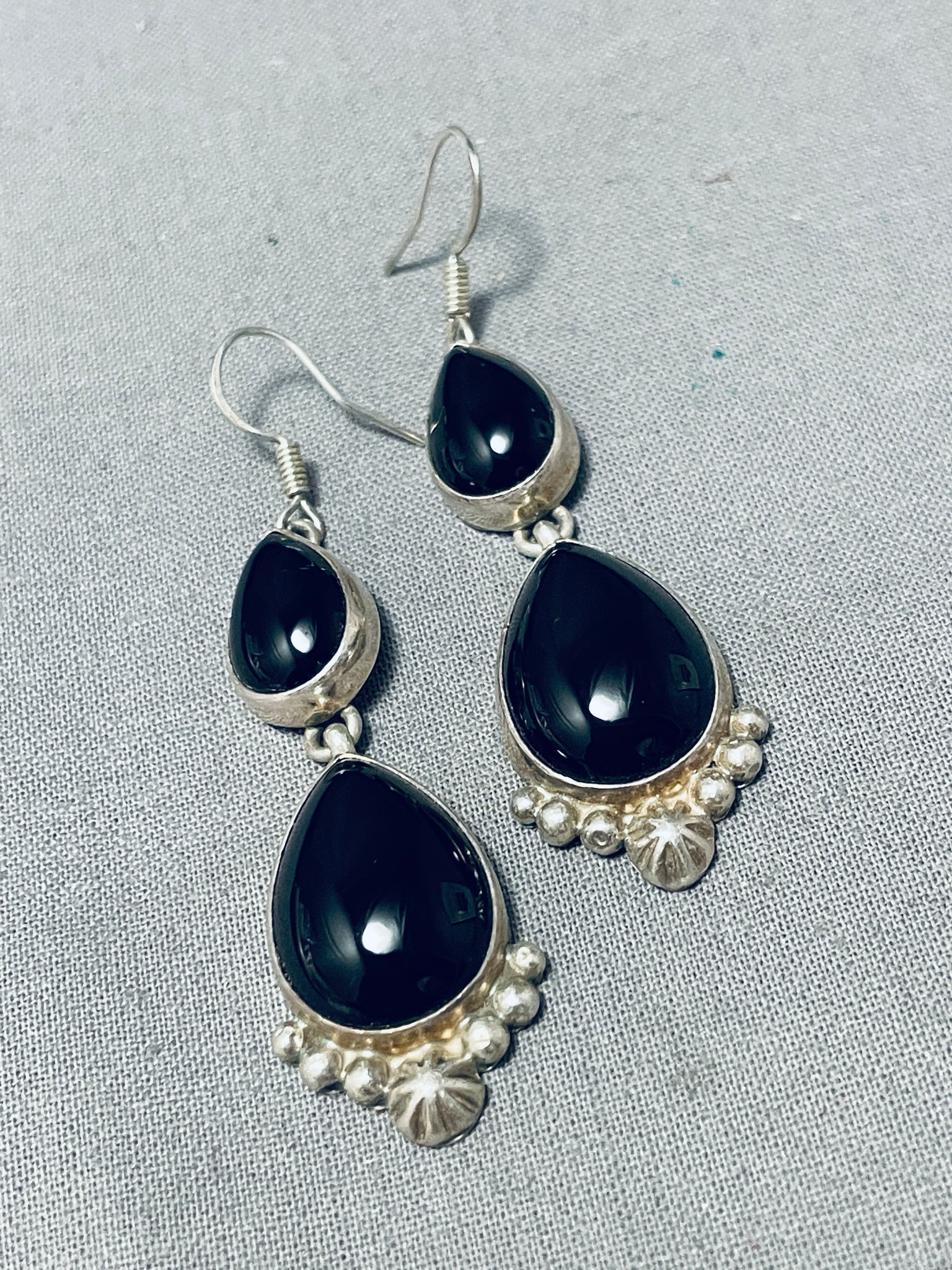 Gorgeous Vintage Native American Navajo Black Onyx Teardrops Sterling Silver Earrings